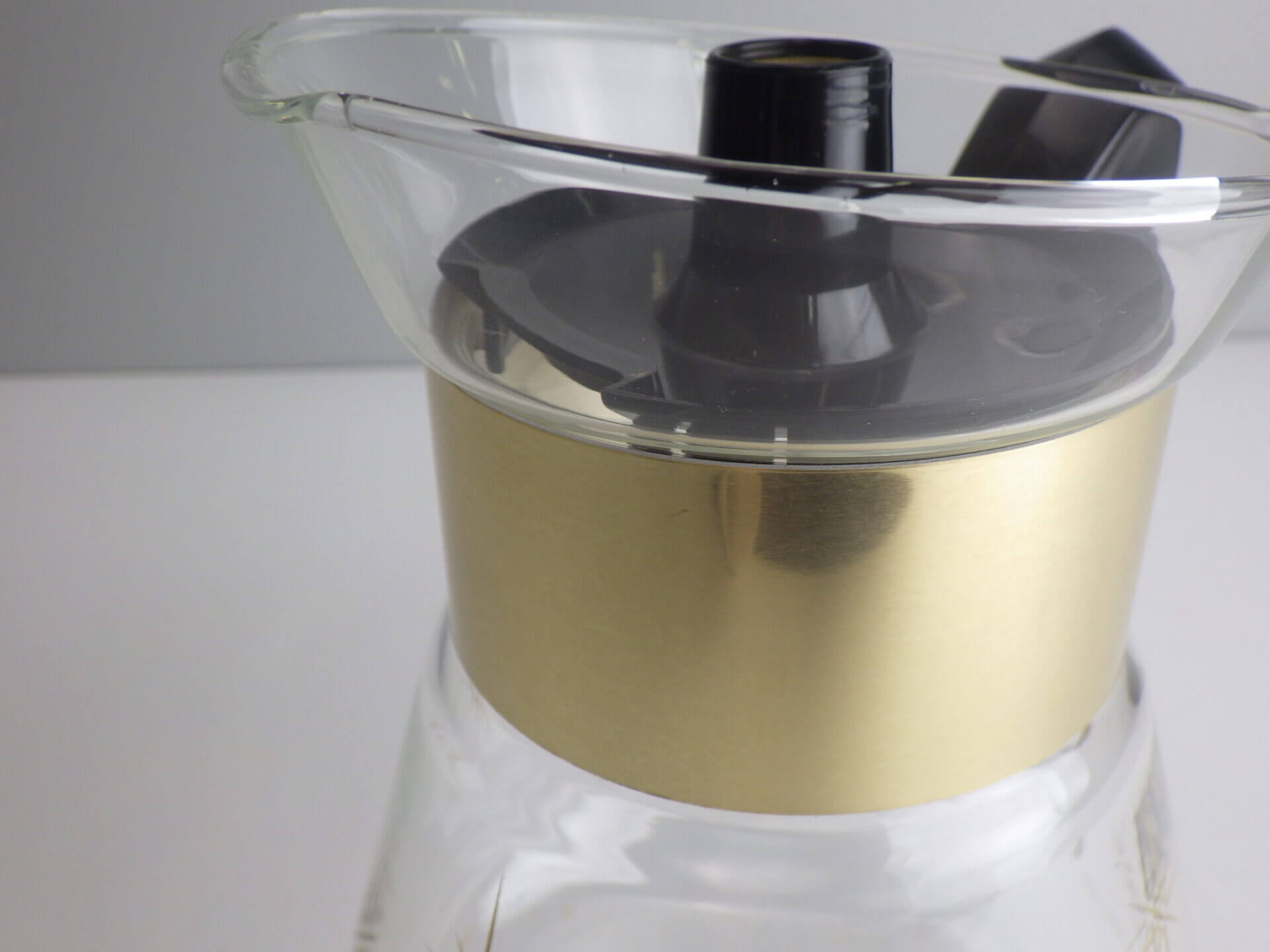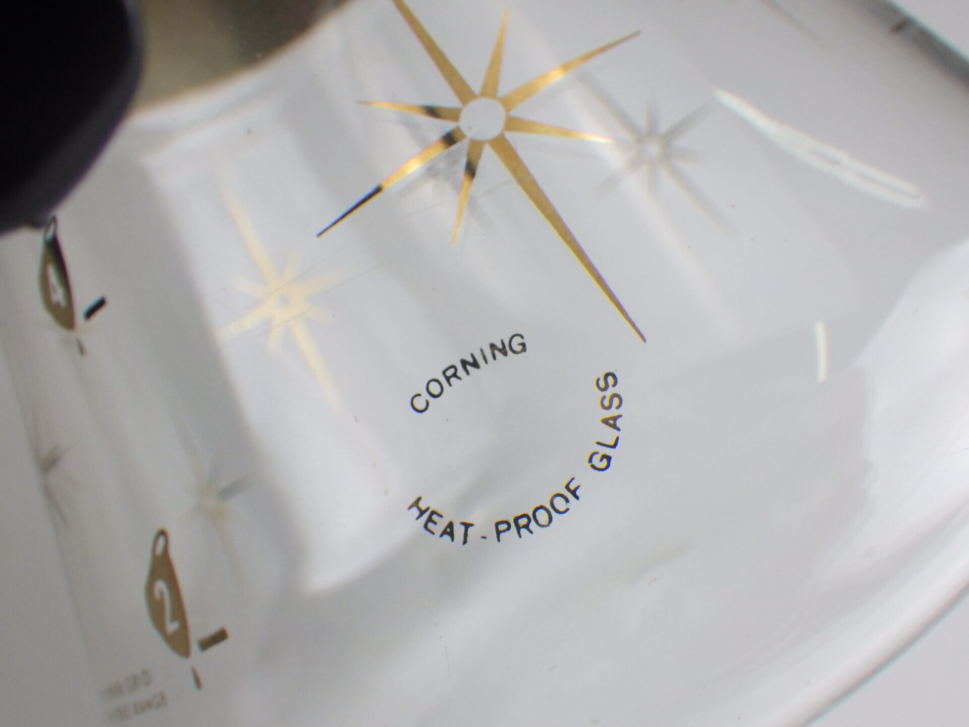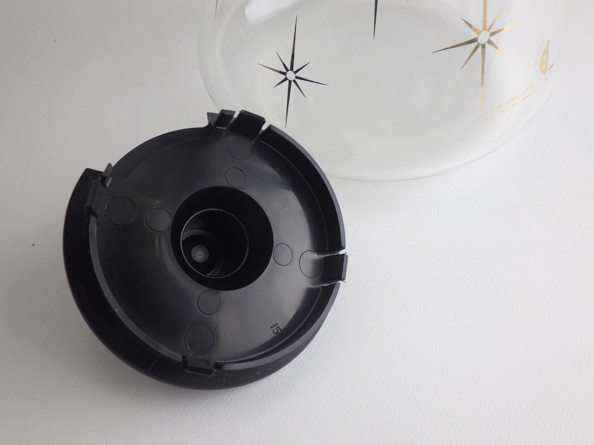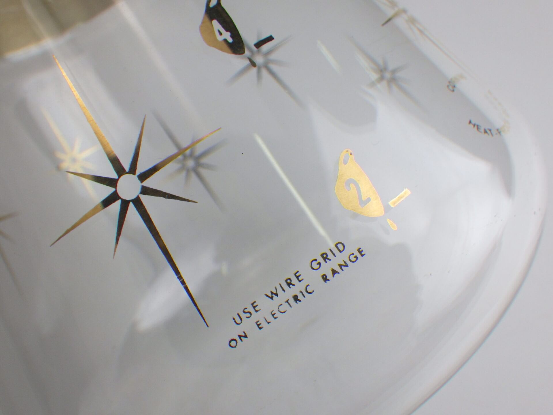 | パイレックスブランドでお馴染みのコーニング社製のビンテージカラフェです。 ゴールドの太めのバンドと星の光線を表現したスターバーストがゴージャスで、ちょっとしたティータイムを華やかにしてくれます。 また、水差しや花瓶などとしてご使用いただくのも良さそうです。 |