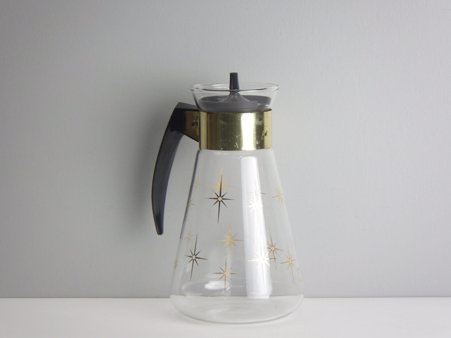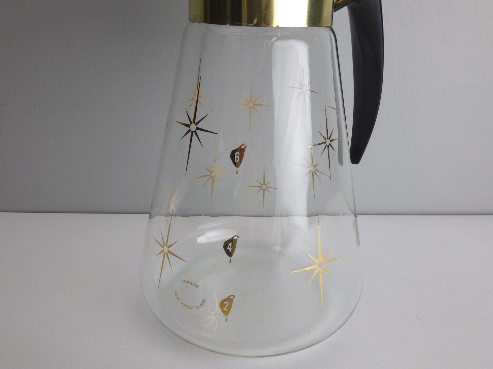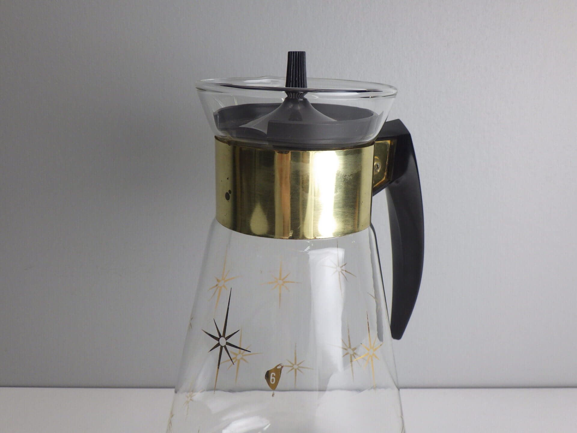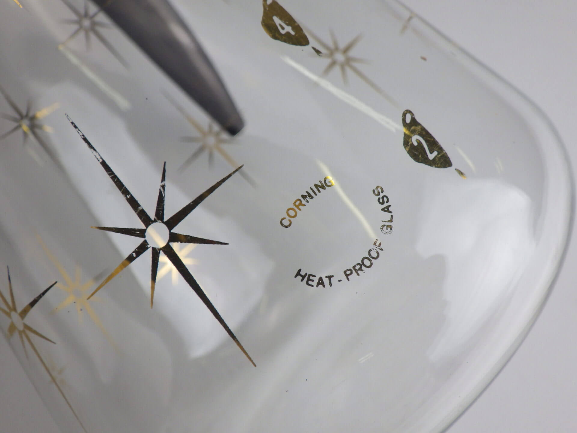 | パイレックスブランドでお馴染みのコーニング社製のビンテージカラフェです。 ゴールドの太めのバンドと星の光線を表現したスターバーストがゴージャスで、ちょっとしたティータイムを華やかにしてくれます。 また、水差しや花瓶などとしてご使用いただくのも良さそうです。 |