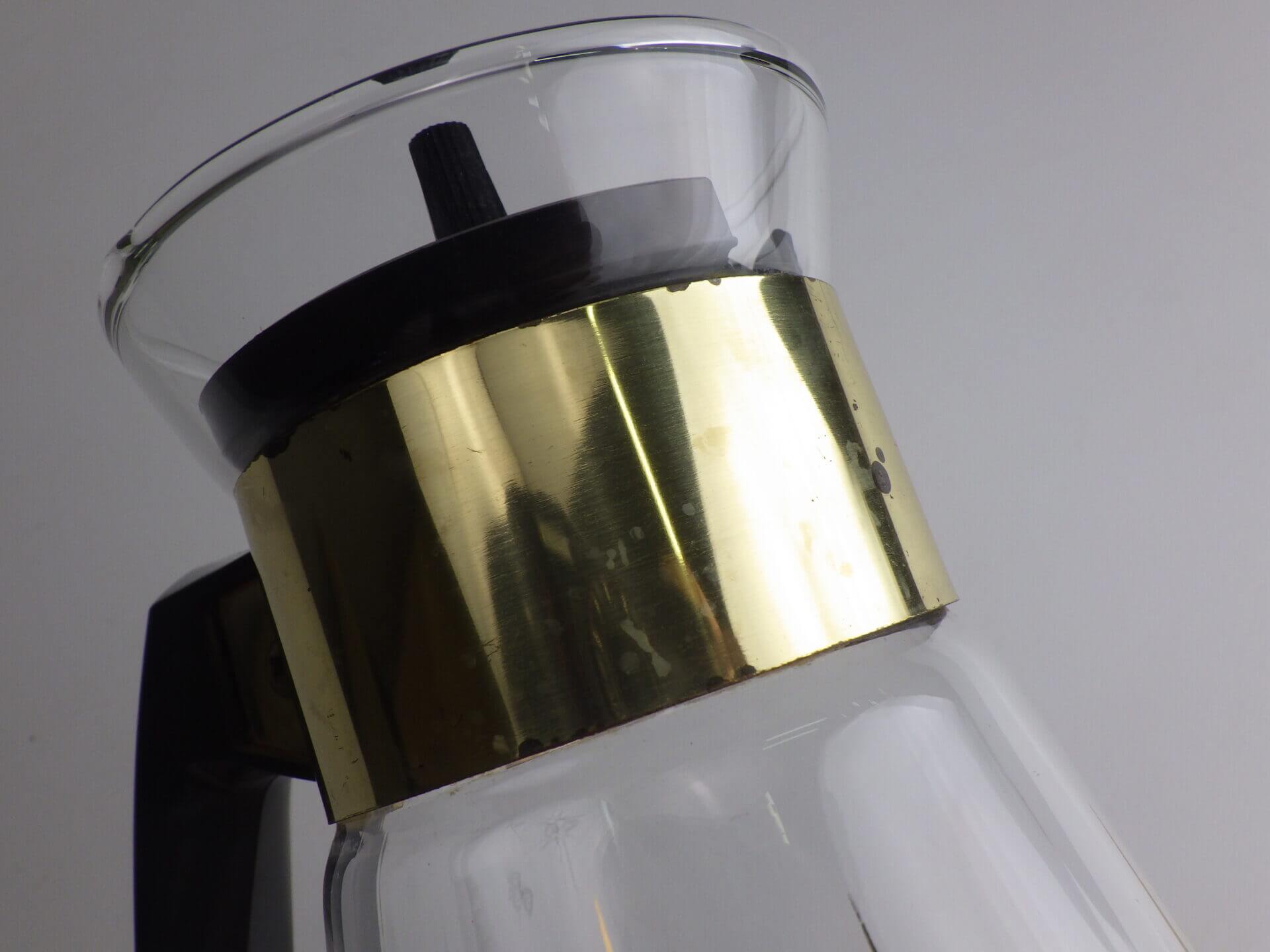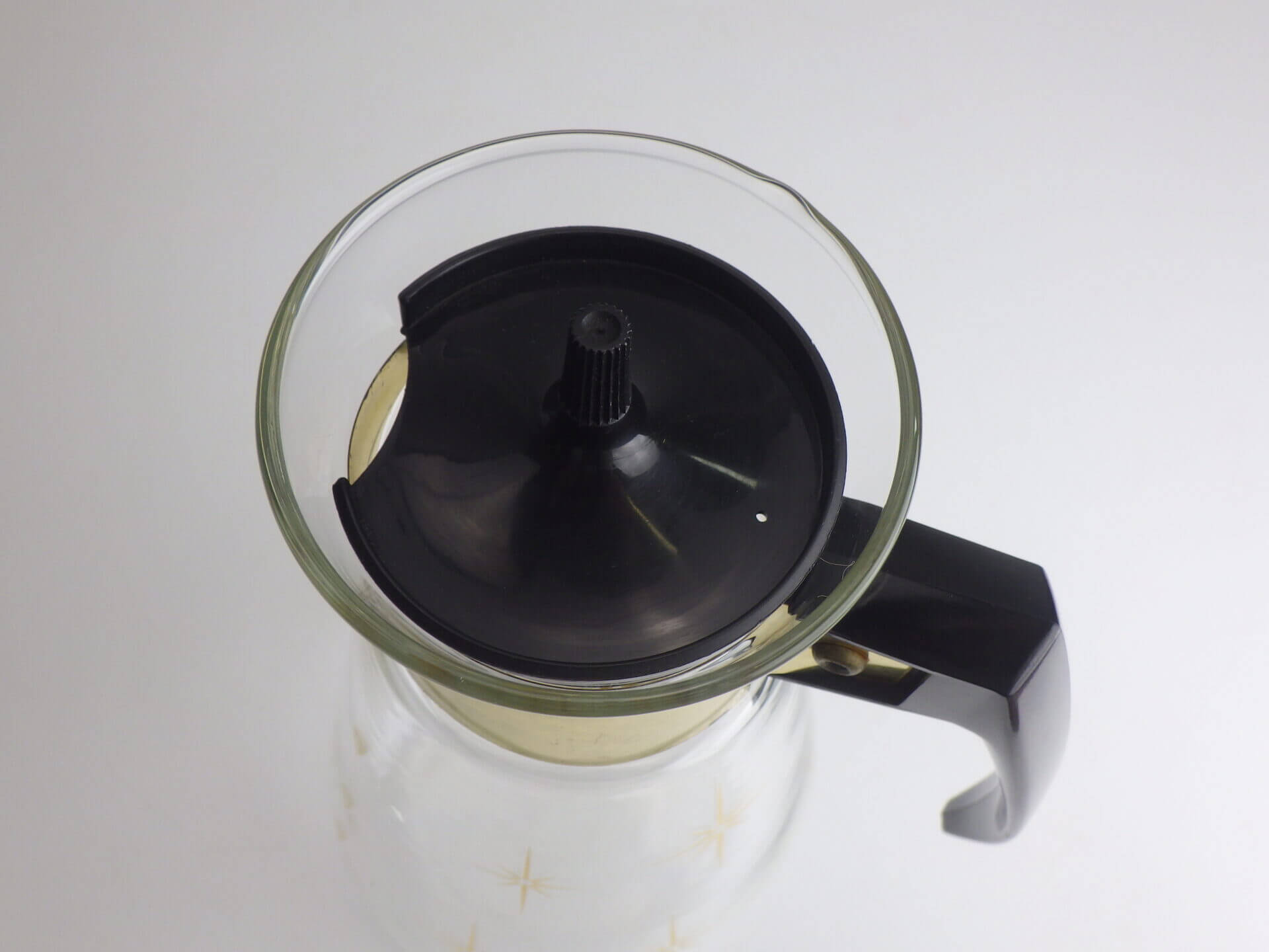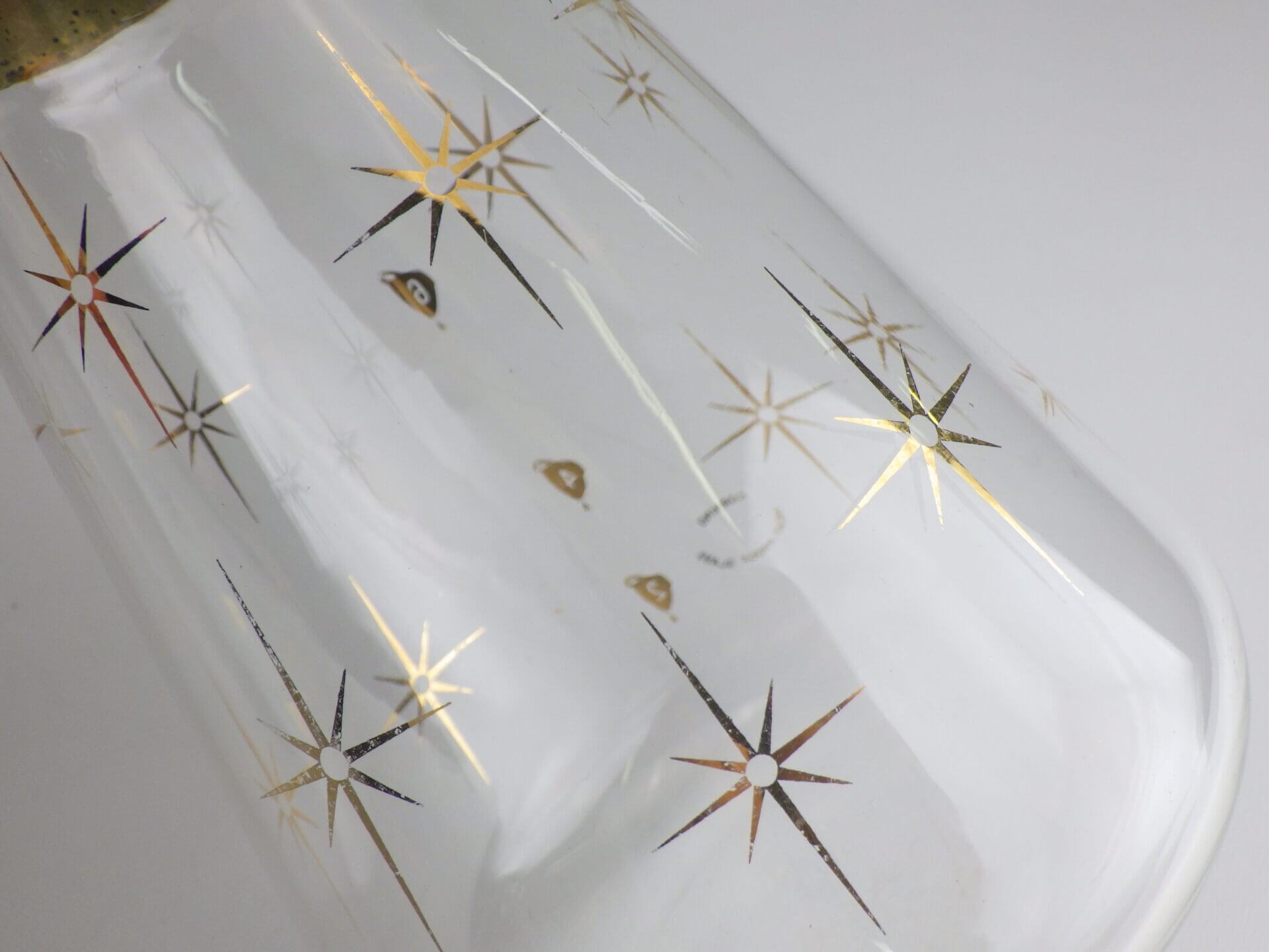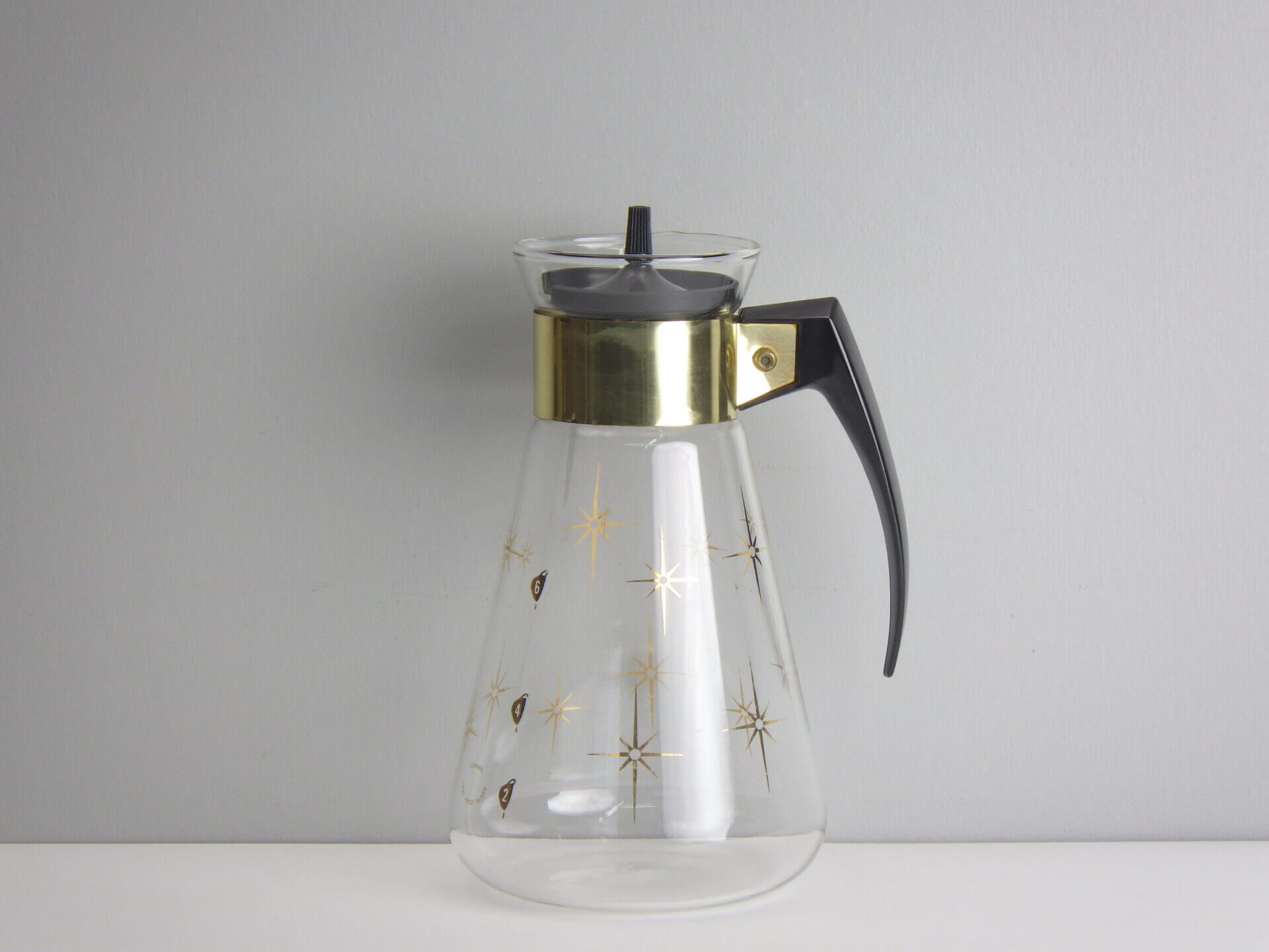 | パイレックスブランドでお馴染みのコーニング社製のビンテージカラフェです。 ゴールドの太めのバンドと星の光線を表現したスターバーストがゴージャスで、ちょっとしたティータイムを華やかにしてくれます。 また、水差しや花瓶などとしてご使用いただくのも良さそうです。 |