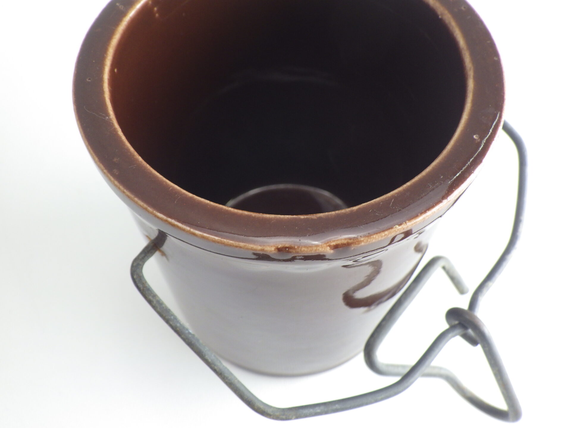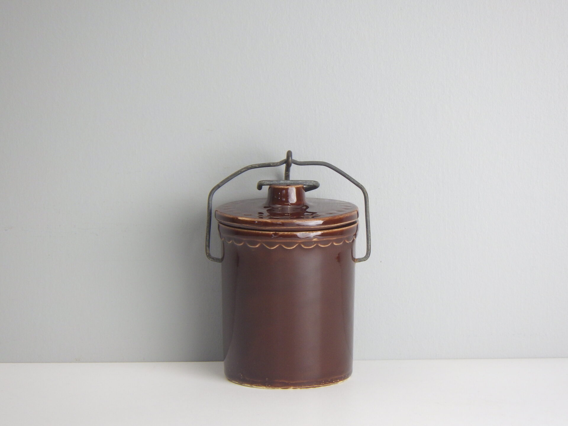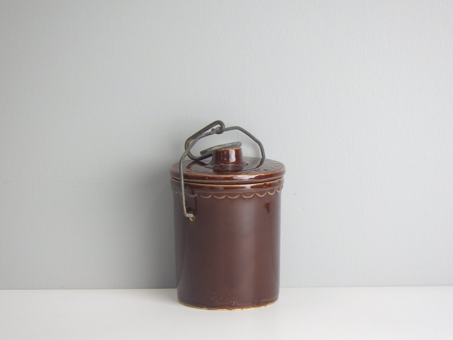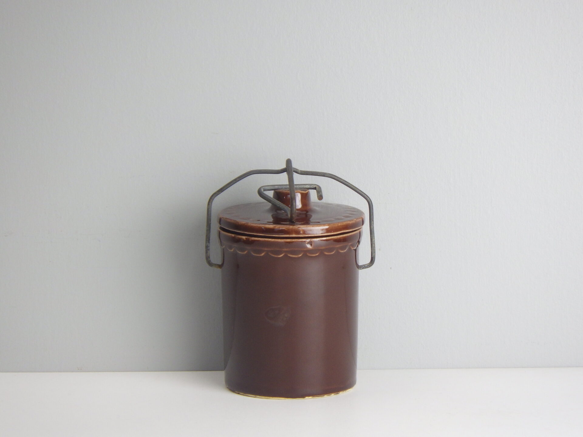 | アメリカより買い付けた、陶器製キャニスターです。 ぽってりしたツヤのあるダークブラウンのボディが、ビンテージらしく良い雰囲気ですね。 上部の金具を持ち上げることにより開閉できます。 食品の保存容器としてはもちろんのこと、小物入れとしてもおすすめです。 |