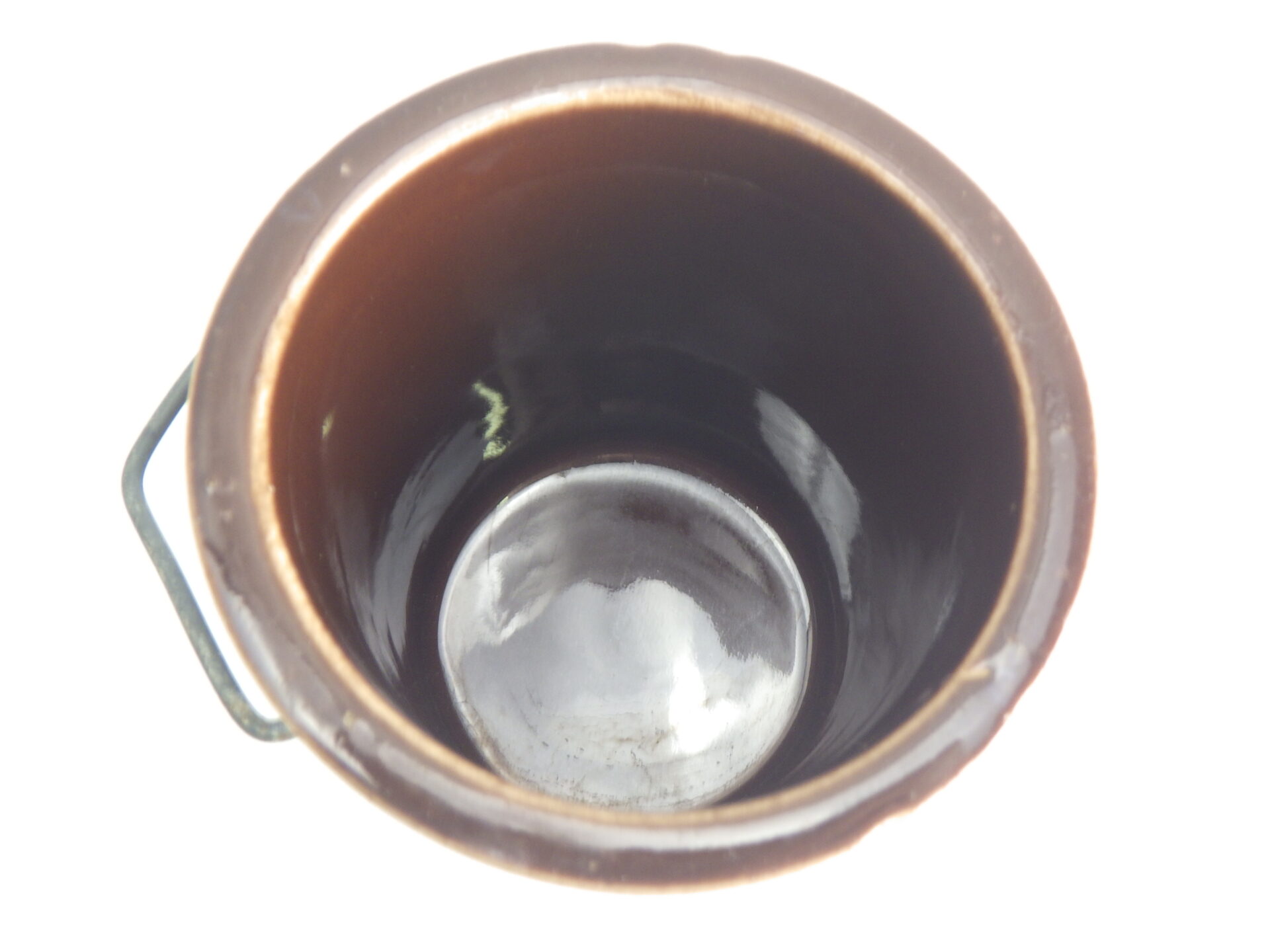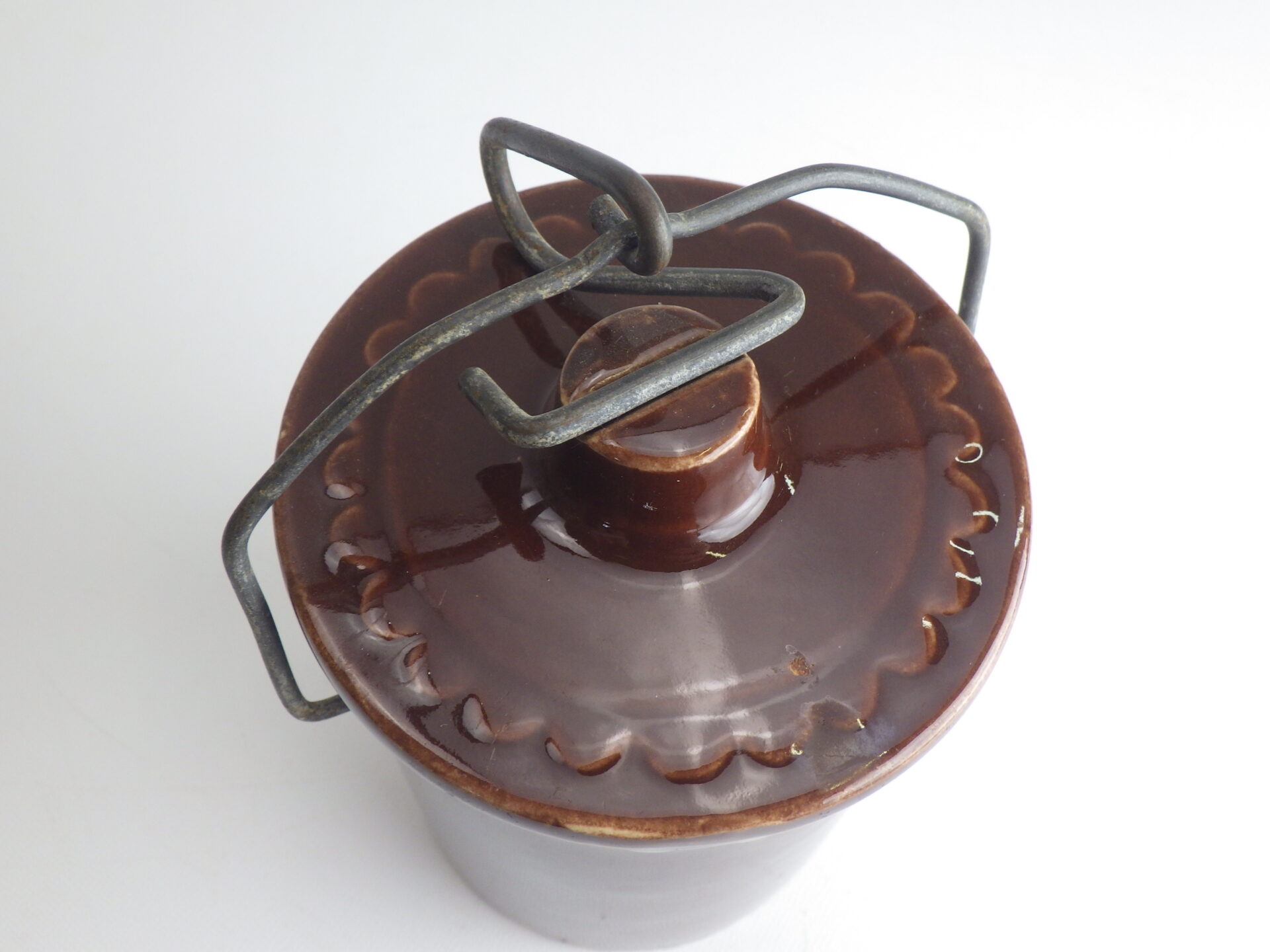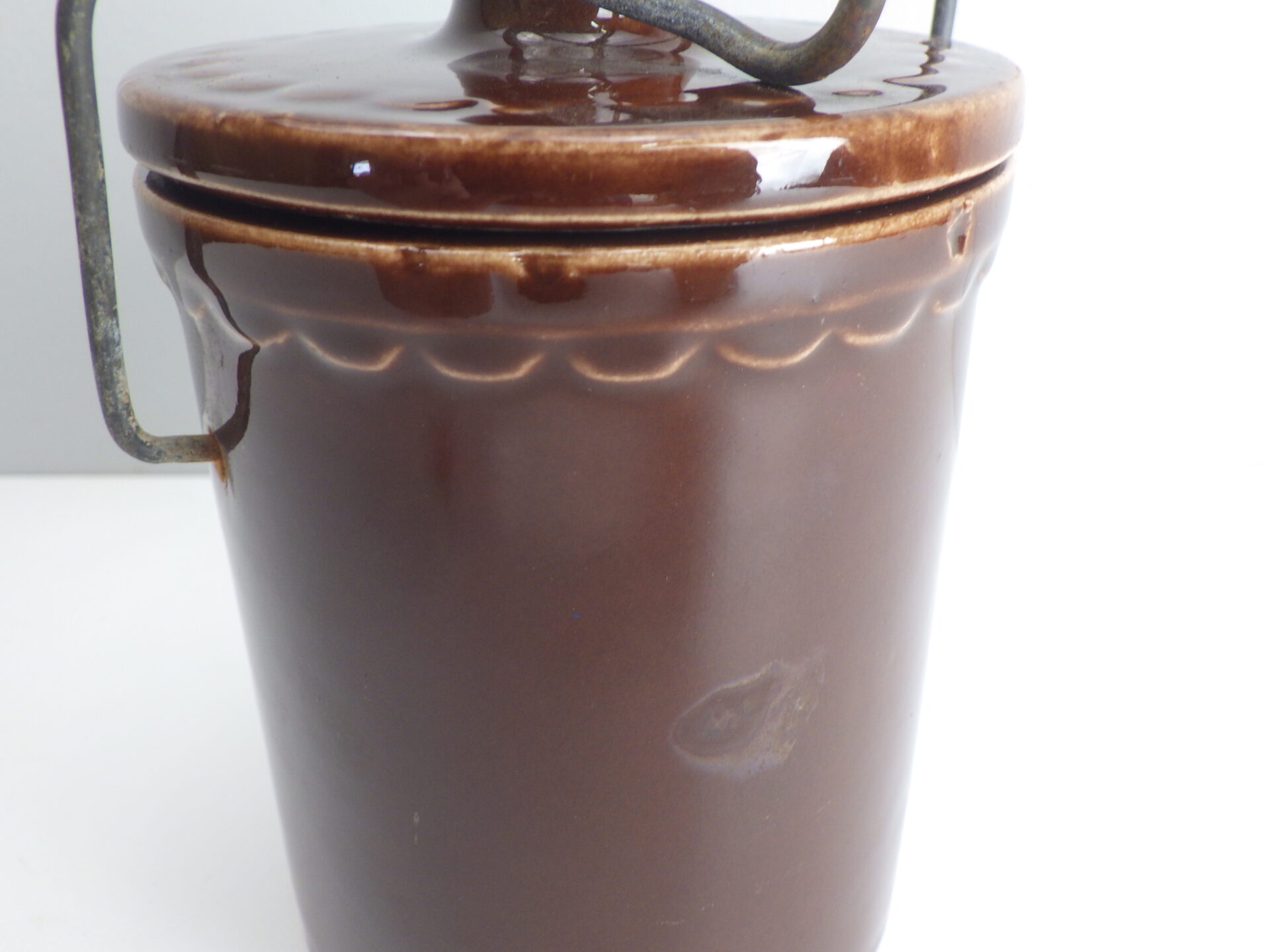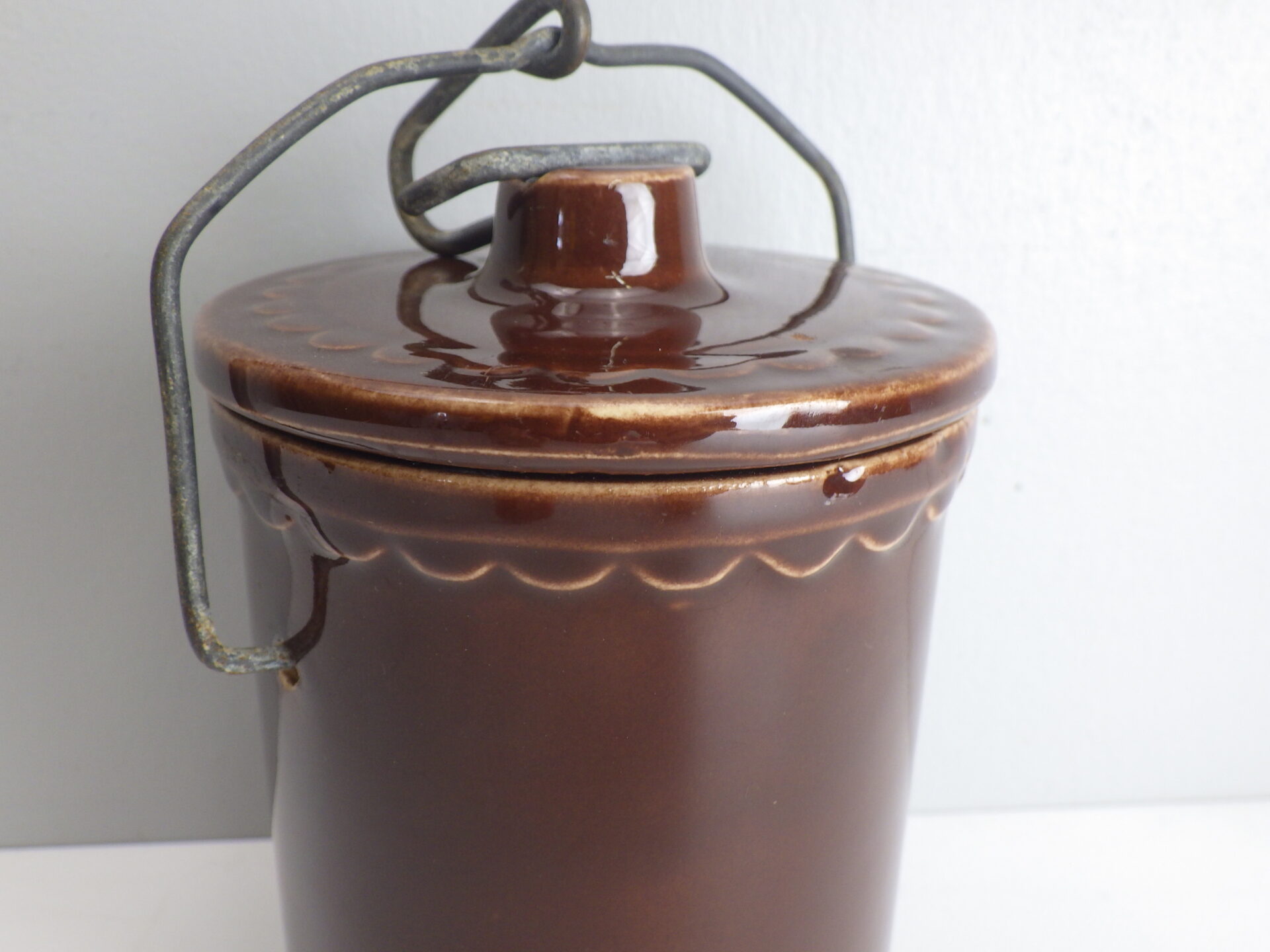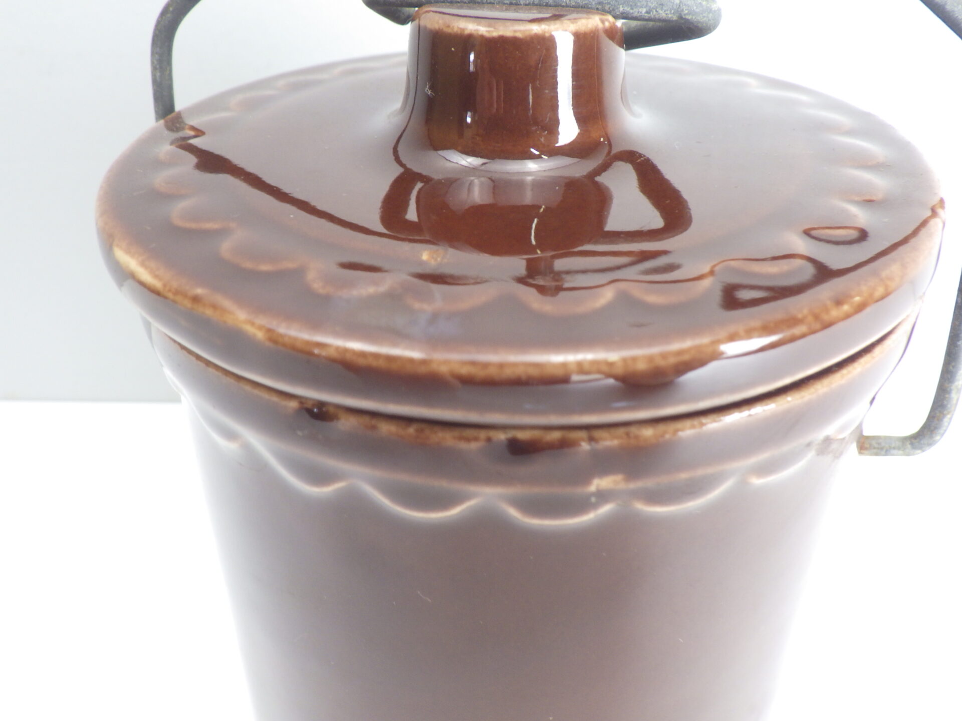 | アメリカより買い付けた、陶器製キャニスターです。 ぽってりしたツヤのあるダークブラウンのボディが、ビンテージらしく良い雰囲気ですね。 上部の金具を持ち上げることにより開閉できます。 食品の保存容器としてはもちろんのこと、小物入れとしてもおすすめです。 |