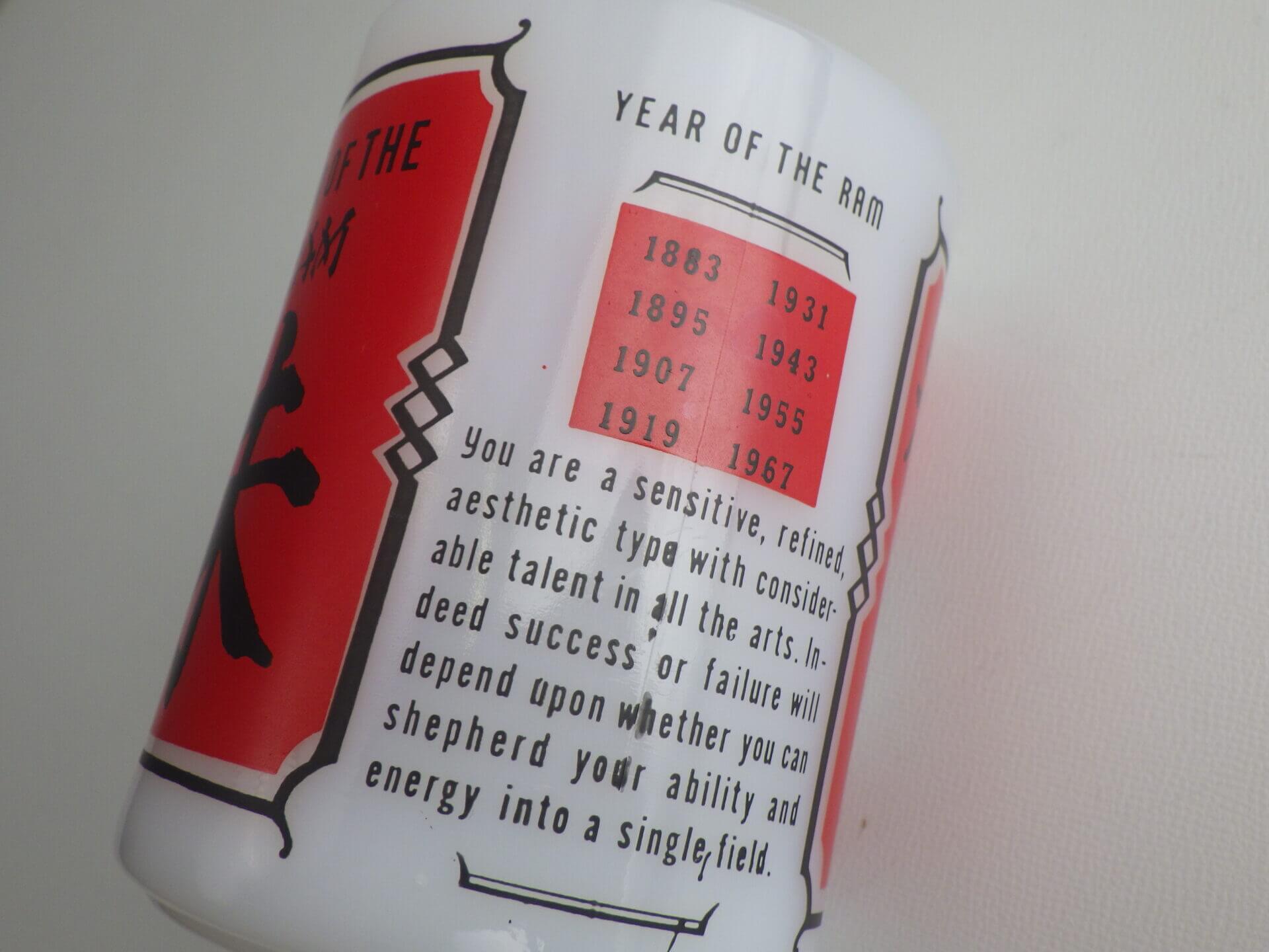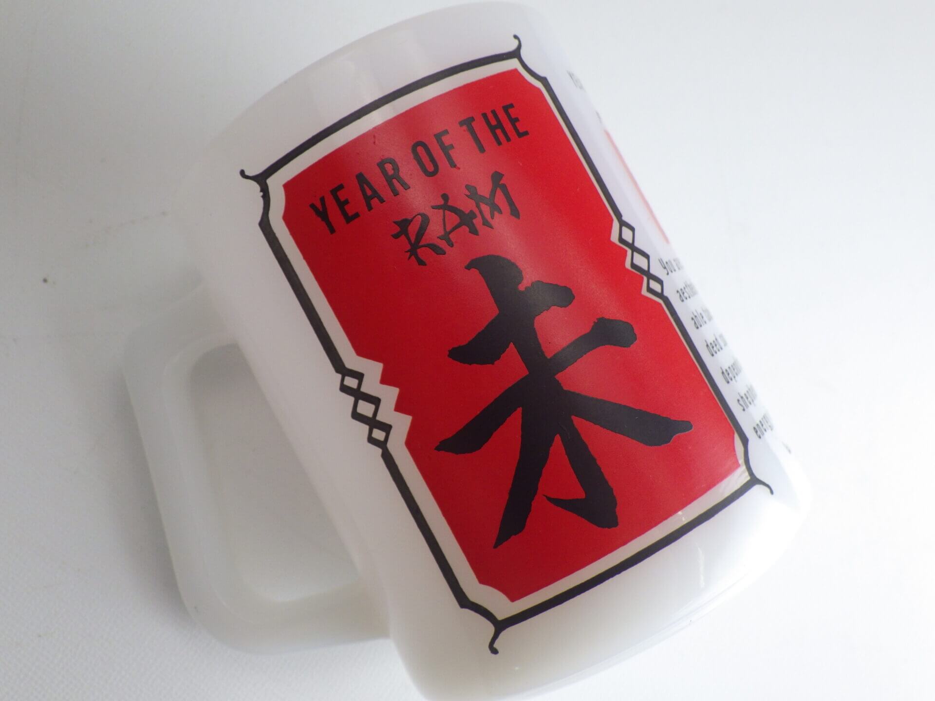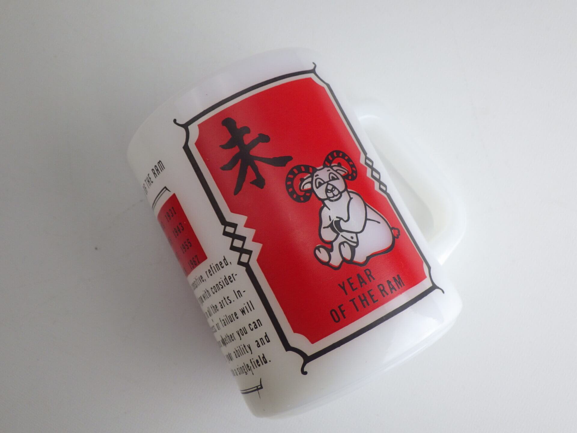 | アメリカでは珍しい十二支モチーフのフェデラルマグです。 干支は「チャイニーズ・ゾディアック」と呼ばれ、アジア系住民の多い地域などでは親しまれているそうですよ。 こちらは未(ひつじ)年のプリントです。 日本人に馴染みのあるもこもこの毛の羊ではなく、ずいぶんと筋肉質な羊さんですね。 |