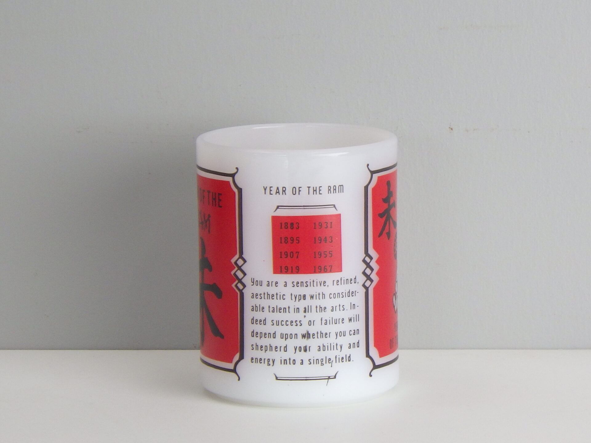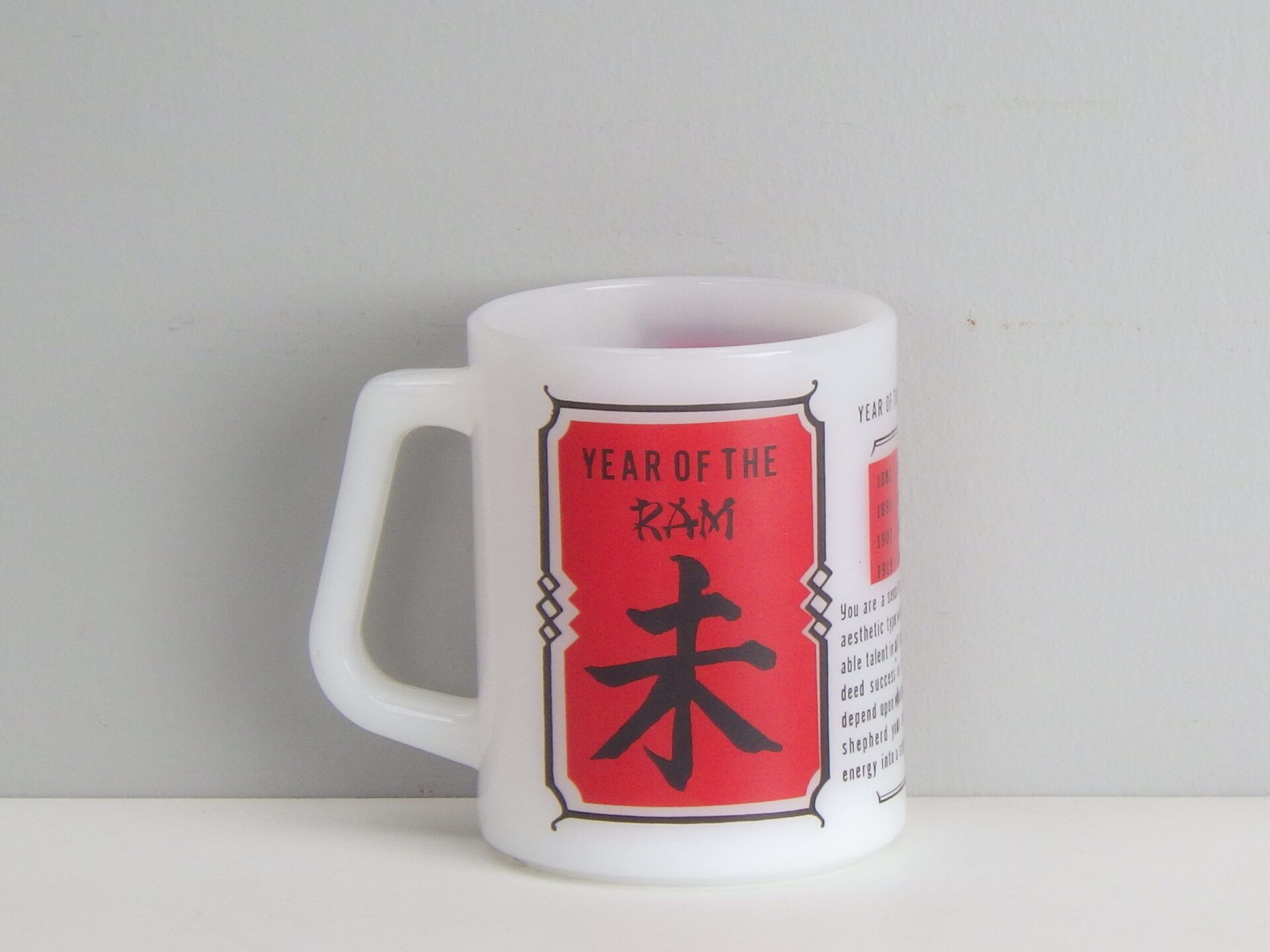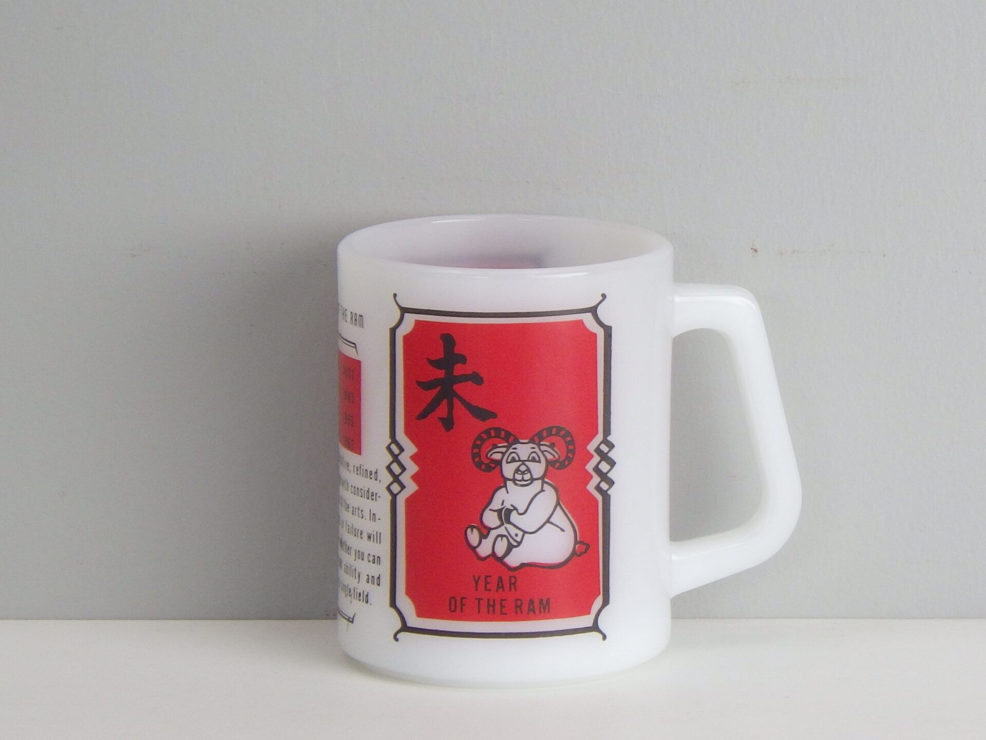 | アメリカでは珍しい十二支モチーフのフェデラルマグです。 干支は「チャイニーズ・ゾディアック」と呼ばれ、アジア系住民の多い地域などでは親しまれているそうですよ。 こちらは未(ひつじ)年のプリントです。 日本人に馴染みのあるもこもこの毛の羊ではなく、ずいぶんと筋肉質な羊さんですね。 |