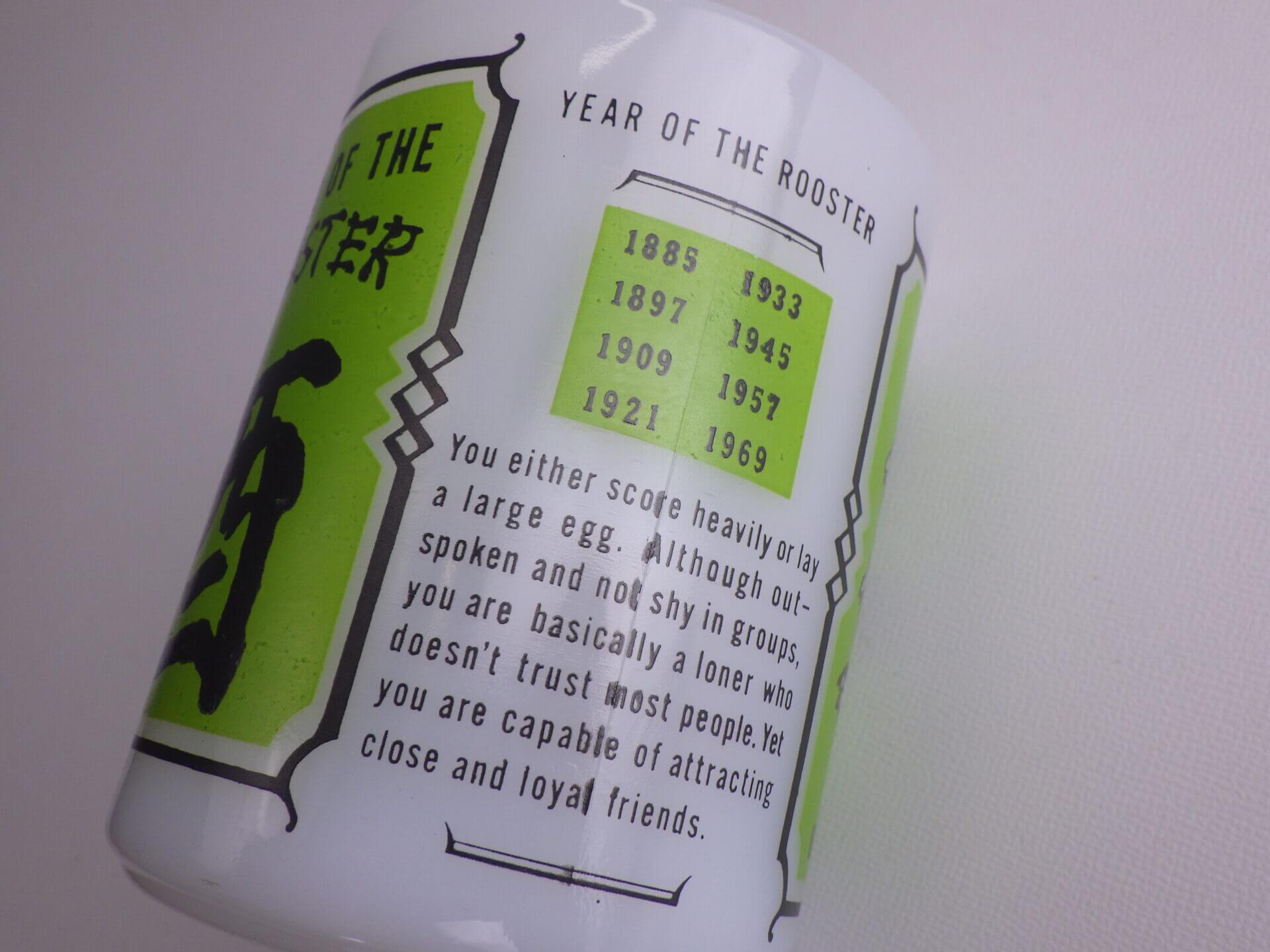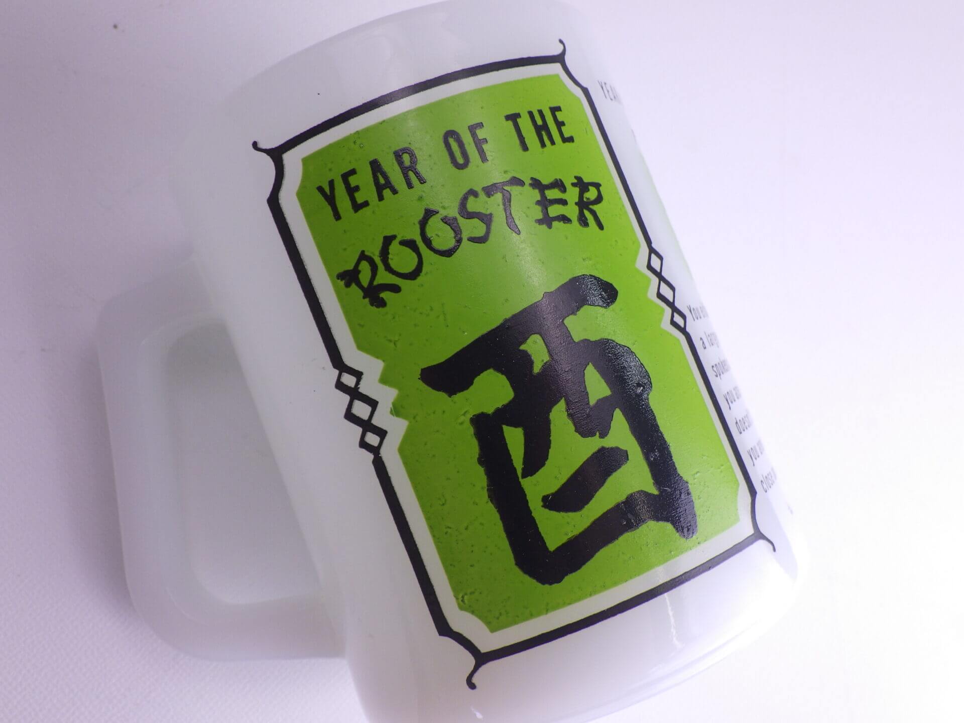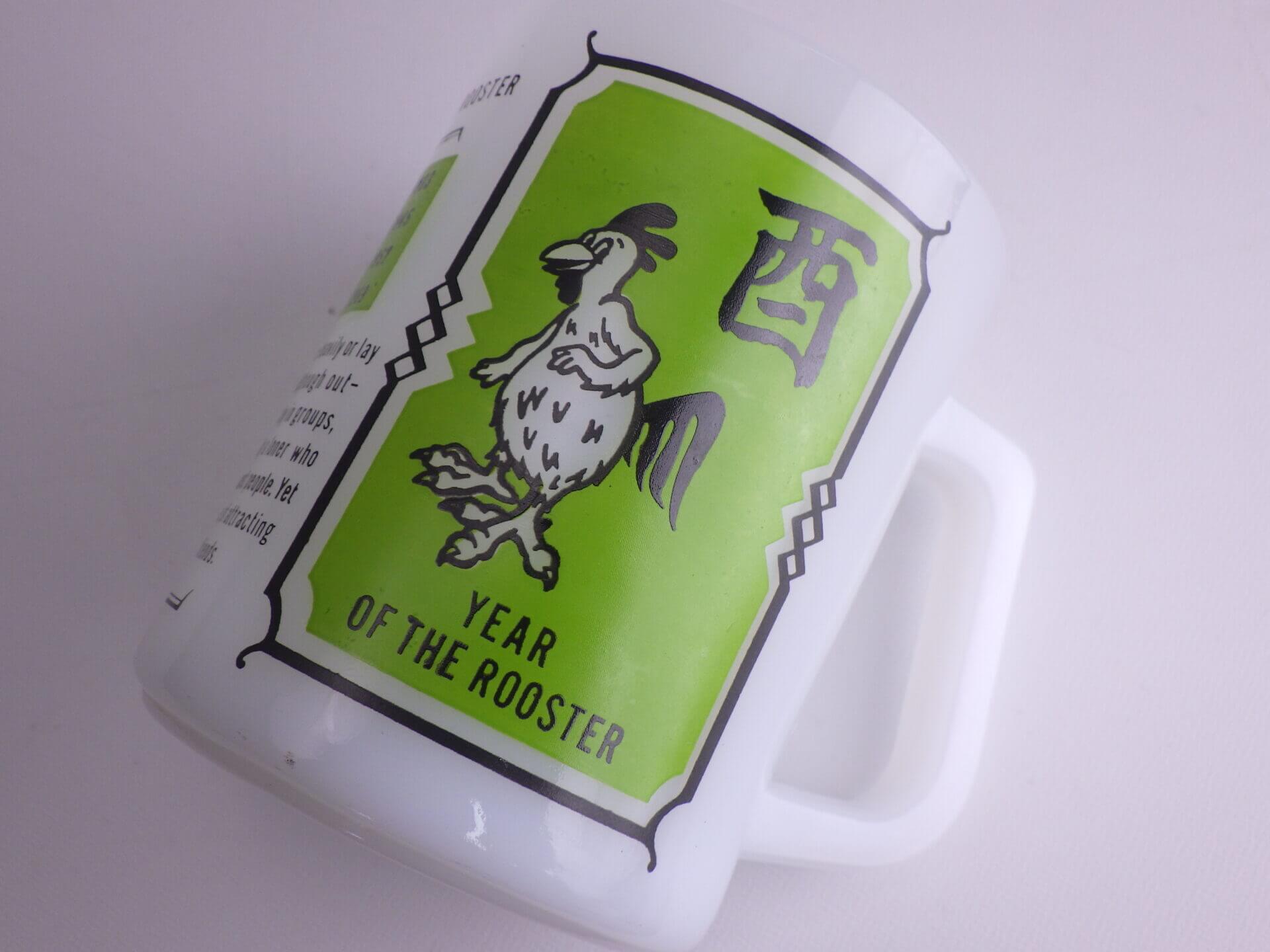 | アメリカでは珍しい十二支モチーフのフェデラルマグです。 干支は「チャイニーズ・ゾディアック」と呼ばれ、アジア系住民の多い地域などでは親しまれているそうですよ。 こちらは酉(とり)年のプリントです。 翼が手の様になっている陽気な雰囲気の雄鶏が可愛いですね。 |