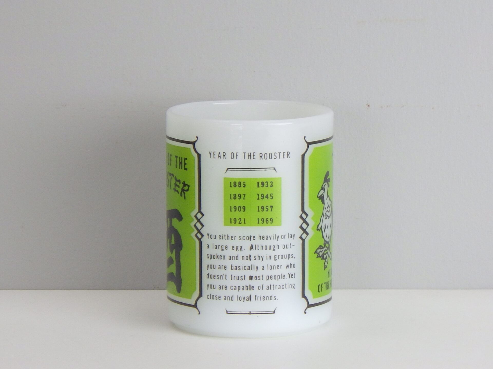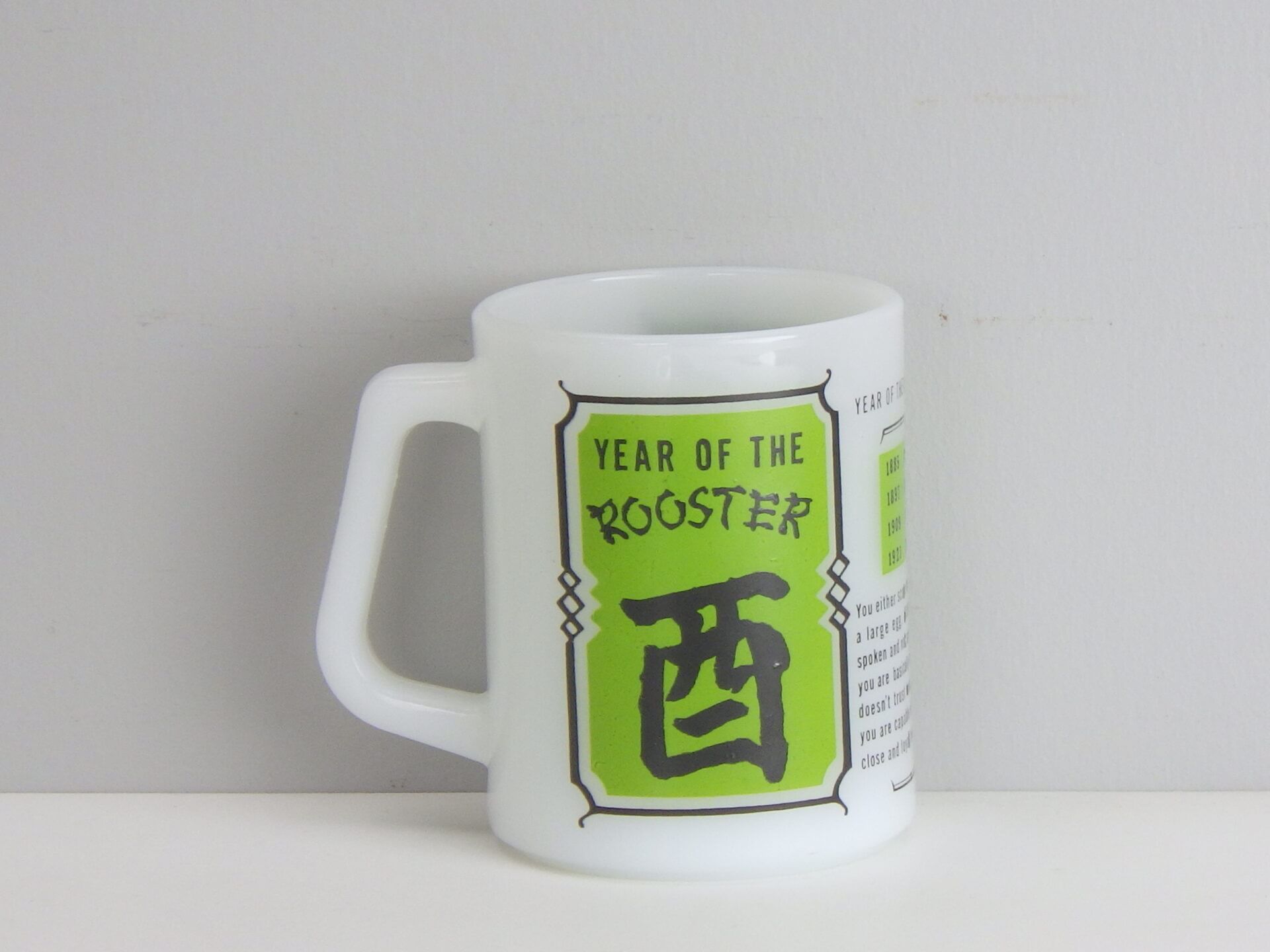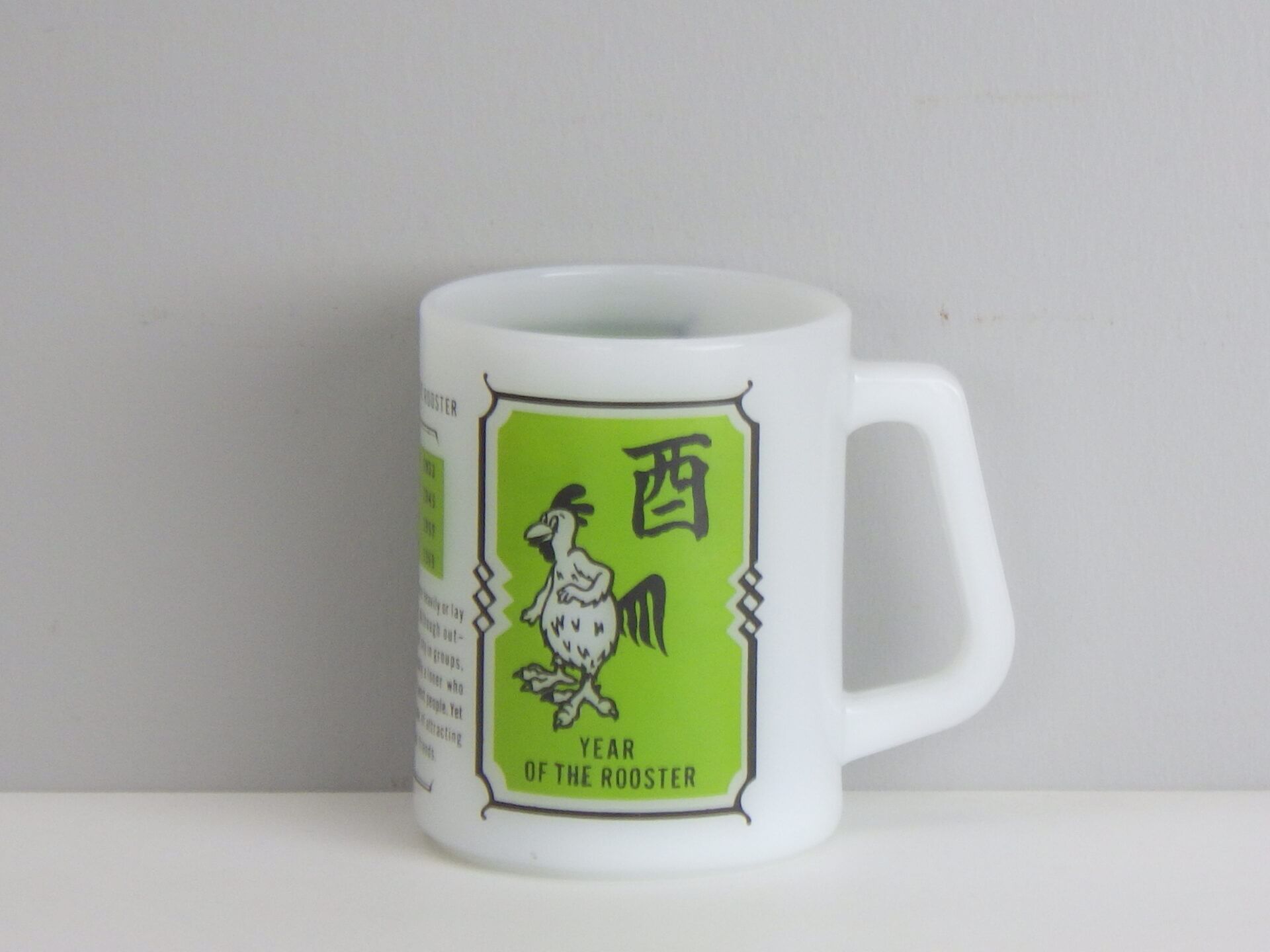 | アメリカでは珍しい十二支モチーフのフェデラルマグです。 干支は「チャイニーズ・ゾディアック」と呼ばれ、アジア系住民の多い地域などでは親しまれているそうですよ。 こちらは酉(とり)年のプリントです。 翼が手の様になっている陽気な雰囲気の雄鶏が可愛いですね。 |