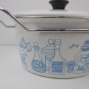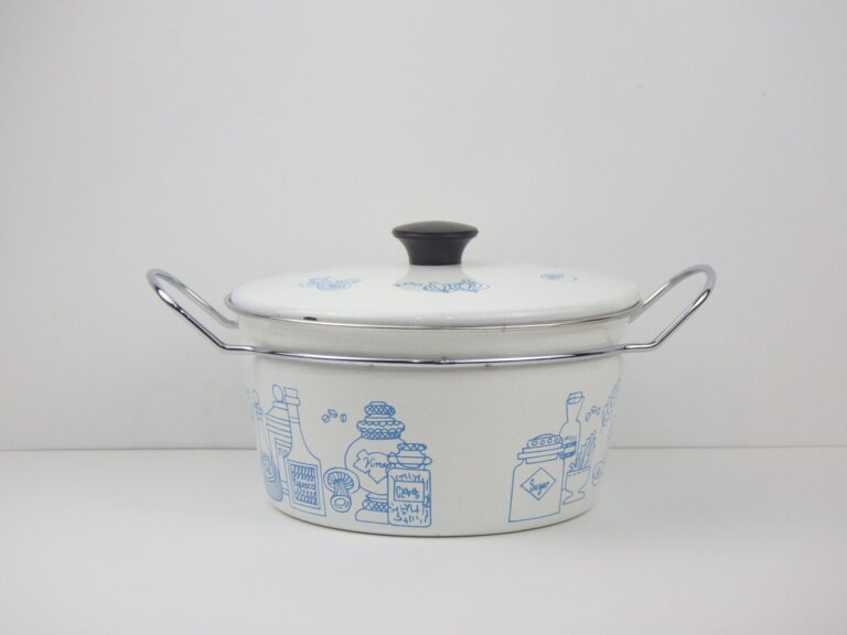 | アメリカで買い付けました。 調理器具などが爽やかなブルーでぐるっと一周描かれており、どちらの面から見ても可愛い両手鍋です。 深めの作りとなっているので、たっぷり煮込み料理に使えそう。 キッチンを華やかにしてくれて、お料理の時間が楽しくなりそうですね。 キャンプなどのアウトドアシーンでもサイトを華やかに彩ってくれるアイテムです。 |