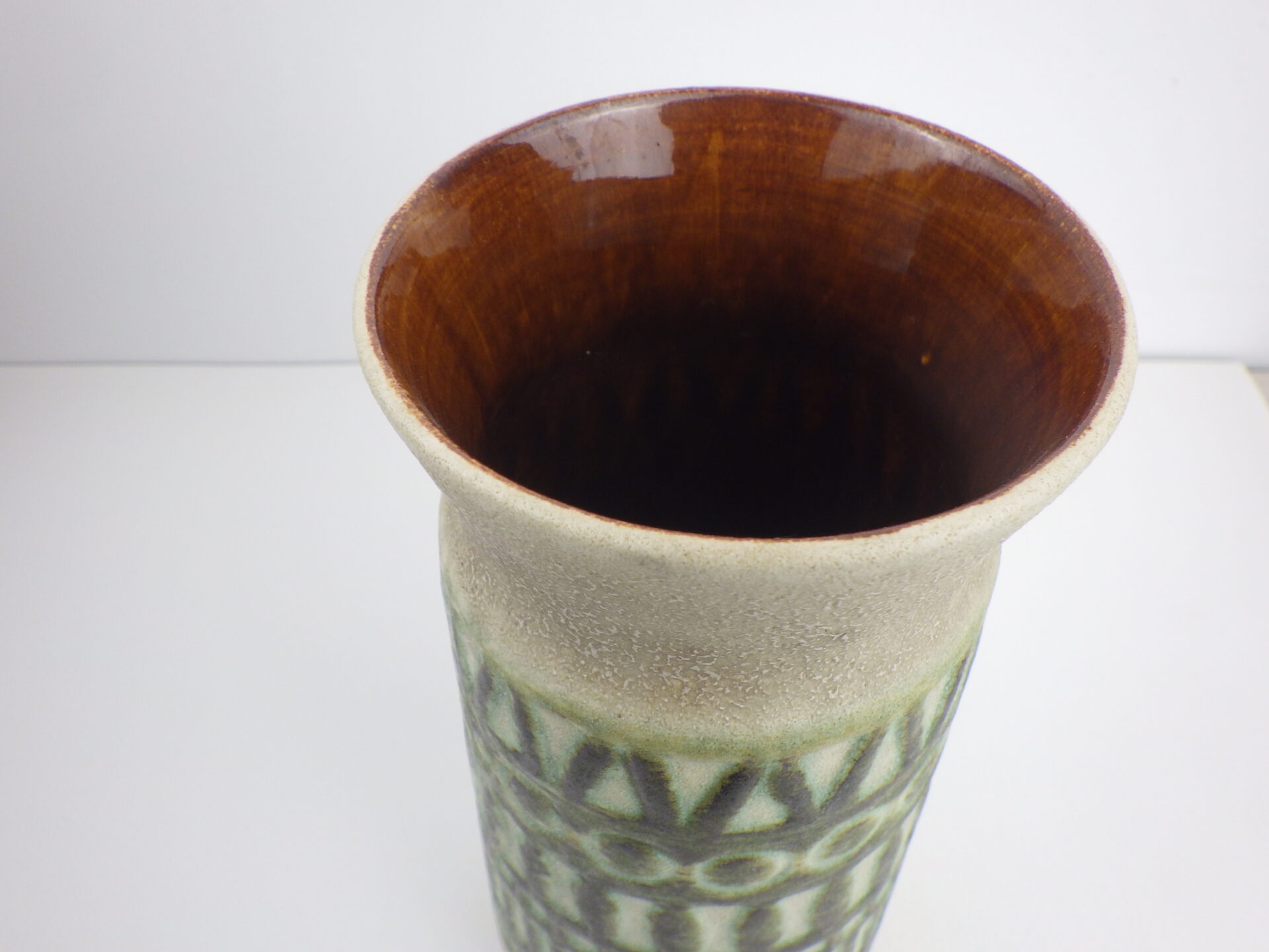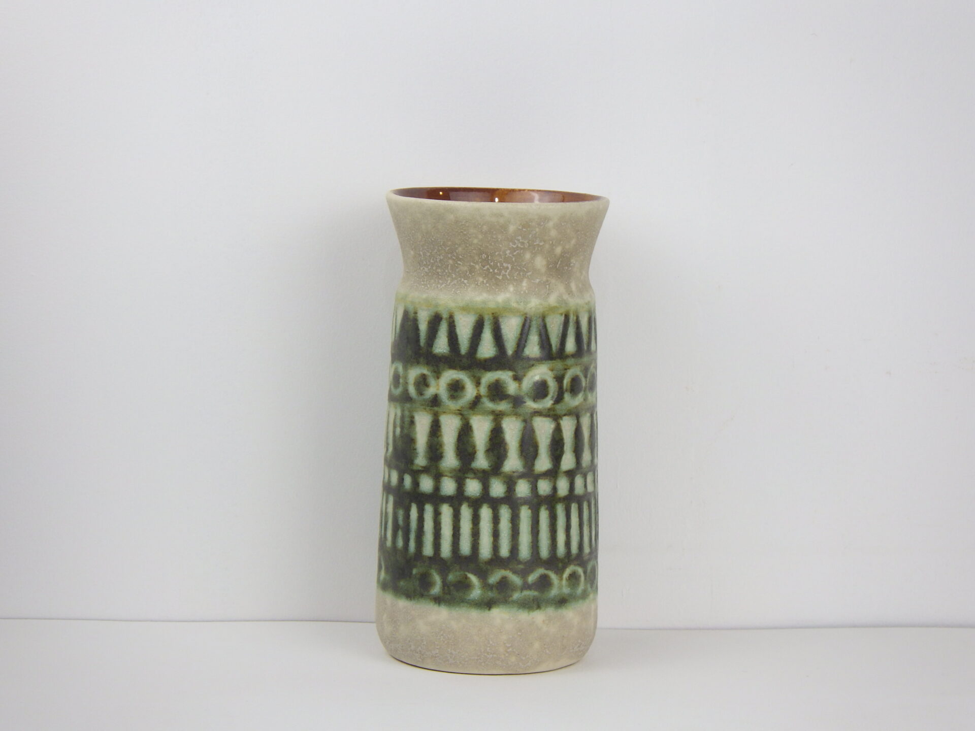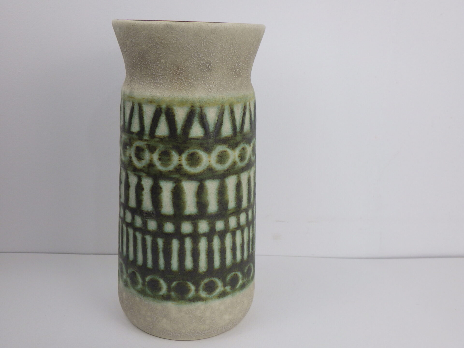 | ヨーロッパで買い付けました。 Jasba Keramik製の陶器のフラワーベースです。 ジャーマン・アートポタリーと呼ばれるこの時代の陶器は、多くが職人による手作業で製作されており、同じシリーズでも一つとして同じ表情のものが存在しません。 落ち着いたグリーンとアイボリーは、日本の住まいにも良く馴染むデザインです。 角度によって見える内部のブラウンカラーが、良いアクセントになってくれそう。 |