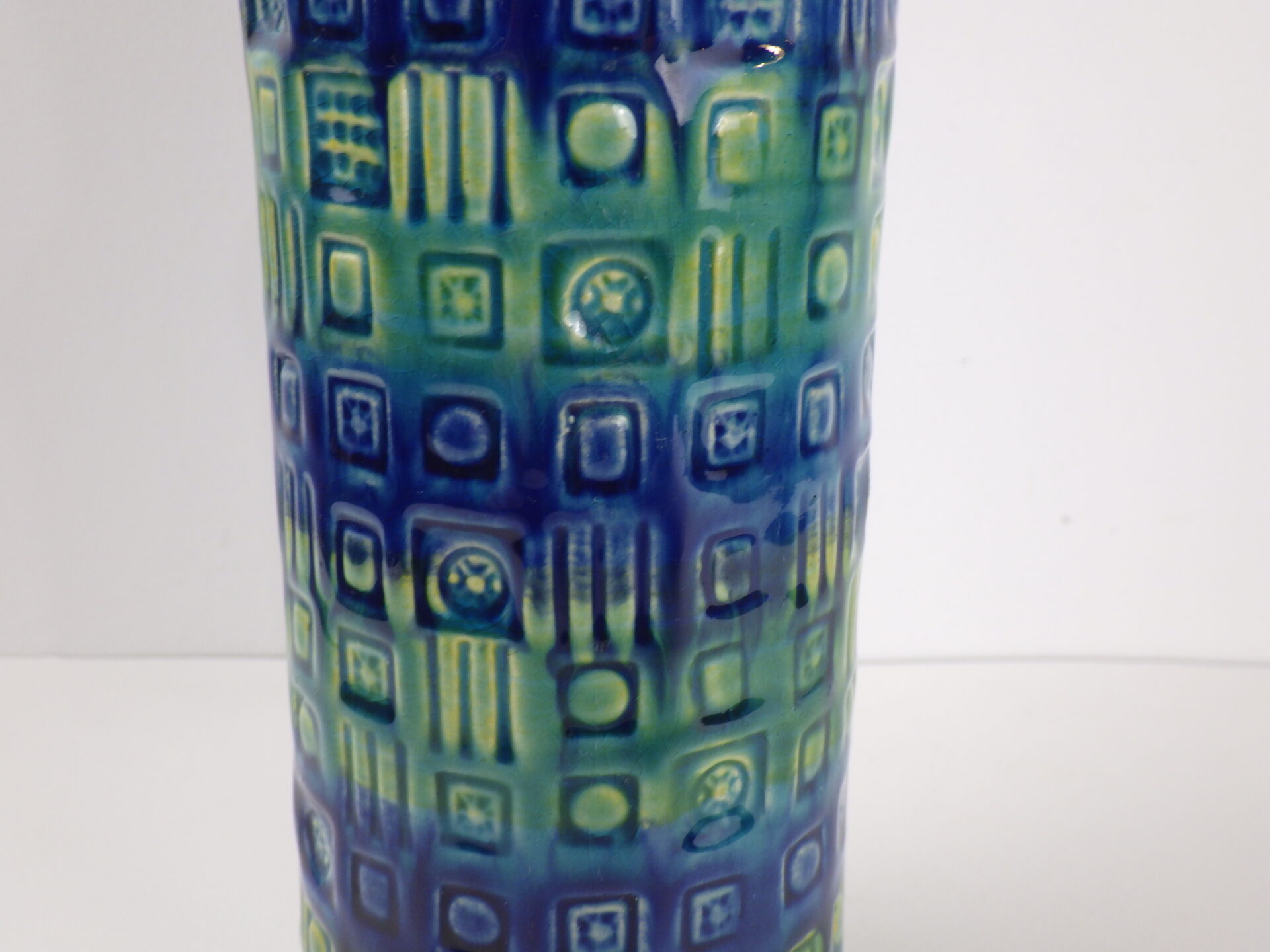 | ヨーロッパで買い付けました。 ジャーマン・アートポタリーと呼ばれるこの時代の陶器は、多くが職人による手作業で製作されており、同じシリーズでも一つとして同じ表情の物が存在しません。 こちらは1933年設立のBay Keramik製です。 古代北欧風なパターンの型押しと、ブルーとグリーンのグラデーションが魅力的なアイテムですね。 背の高い花も余裕で飾れるだけの大きさもあり、インテリアとしてお部屋に色どりを加えてくれそうです。 |