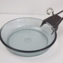 | コーニング社から発売されていた、直火にかけられるシリーズです。 こちらは珍しいスキレット。 ハンドルが付け替え可能で、もう少し深めの2サイズと3点セットで販売されていたようです。 ガラスボタンが割れやすいため、こちらのように残っているのは非常に希少です。 また、青みがかったガラスが使用されていることと、刻印されているエンボスから、古い時代のアイテムであることが伺えます。 調理してそのまま食卓に運んでもオシャレなスキレット。 普段使いやキャンプなどに持ち出すのにおすすめしています。 ※ご使用上の注意点・・・ガラス製スキレットの為、熱した直後に冷まさず冷水につけると温度差で割れてしまいます。洗う際はしっかり冷ましてから水におつけ下さい。 |