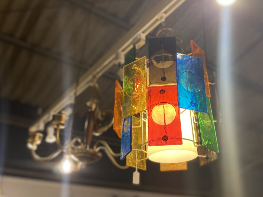 赤、青、黄色・・・カラフルなルーサイトパネルが互い違いに装飾されたペンダントライト。