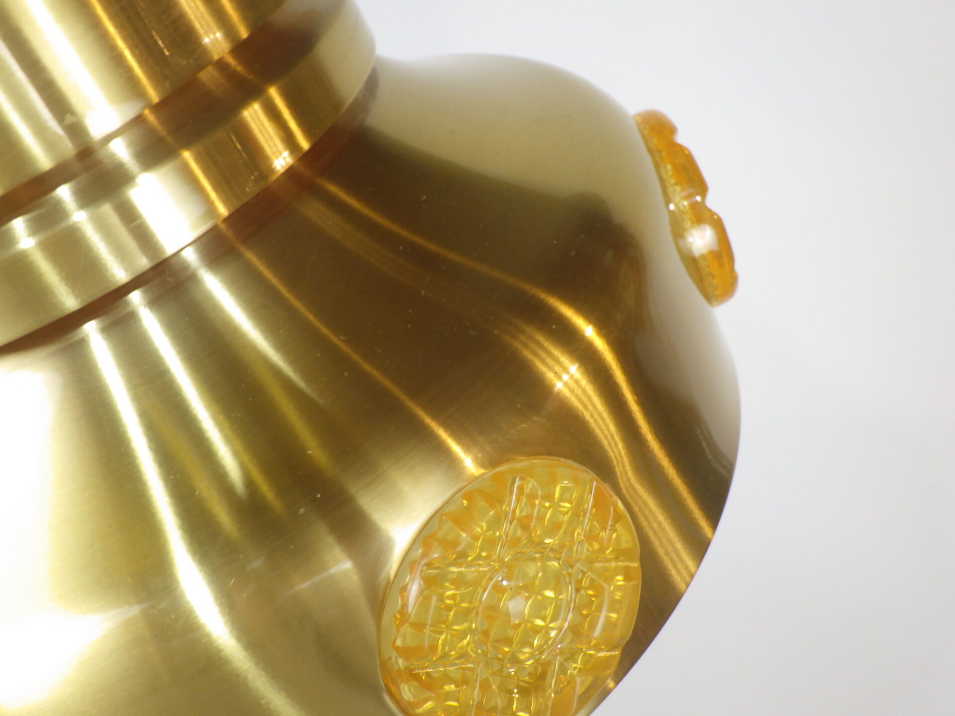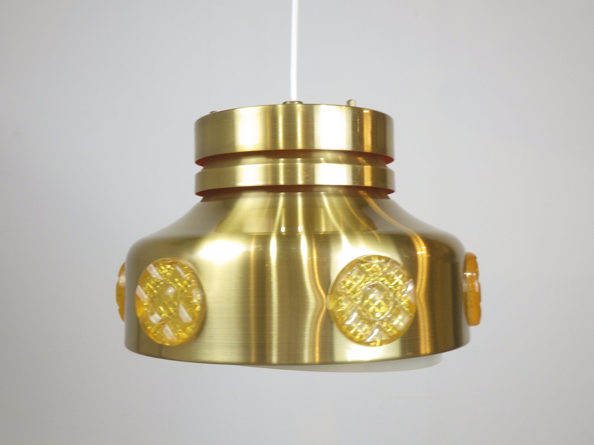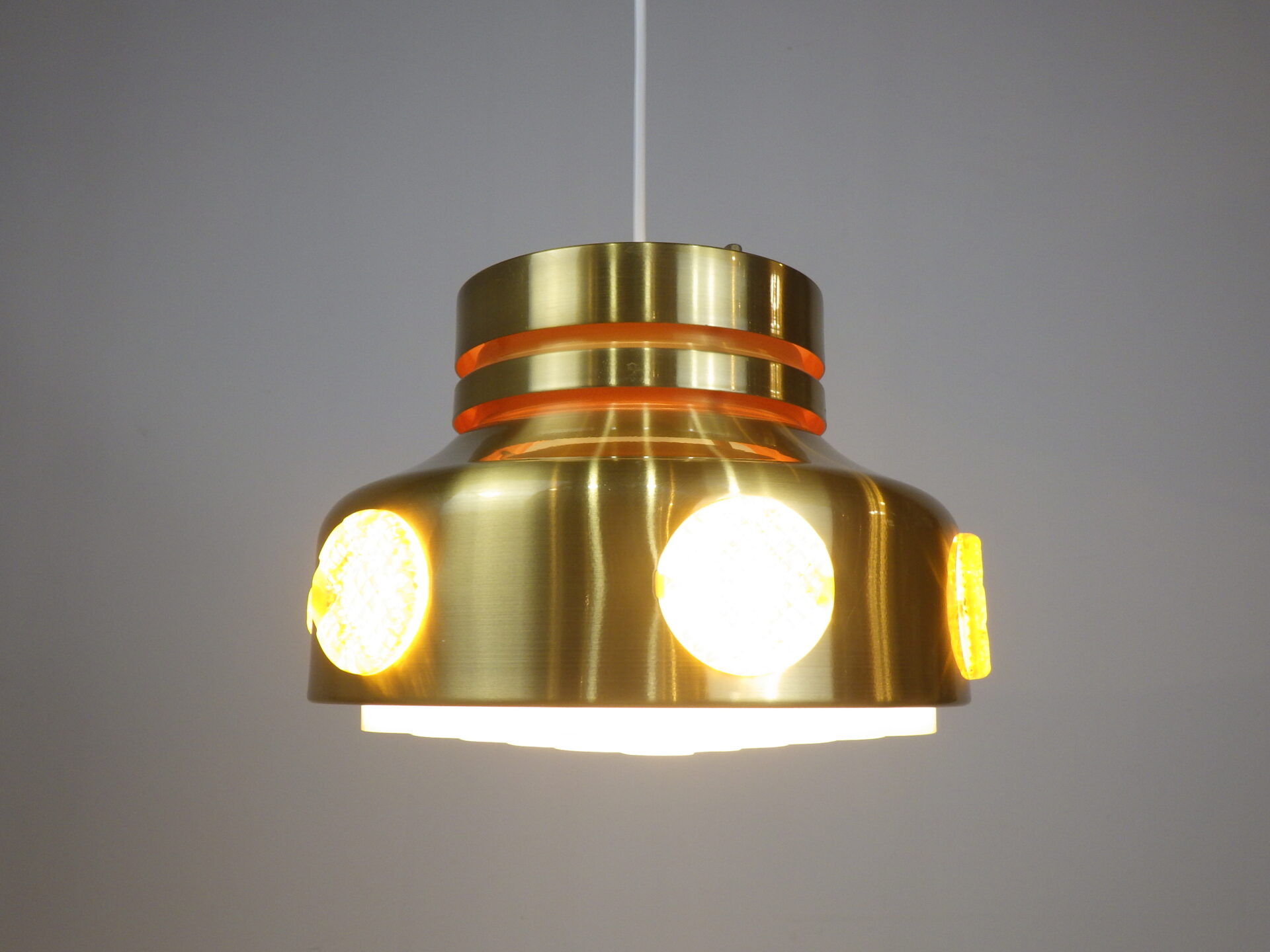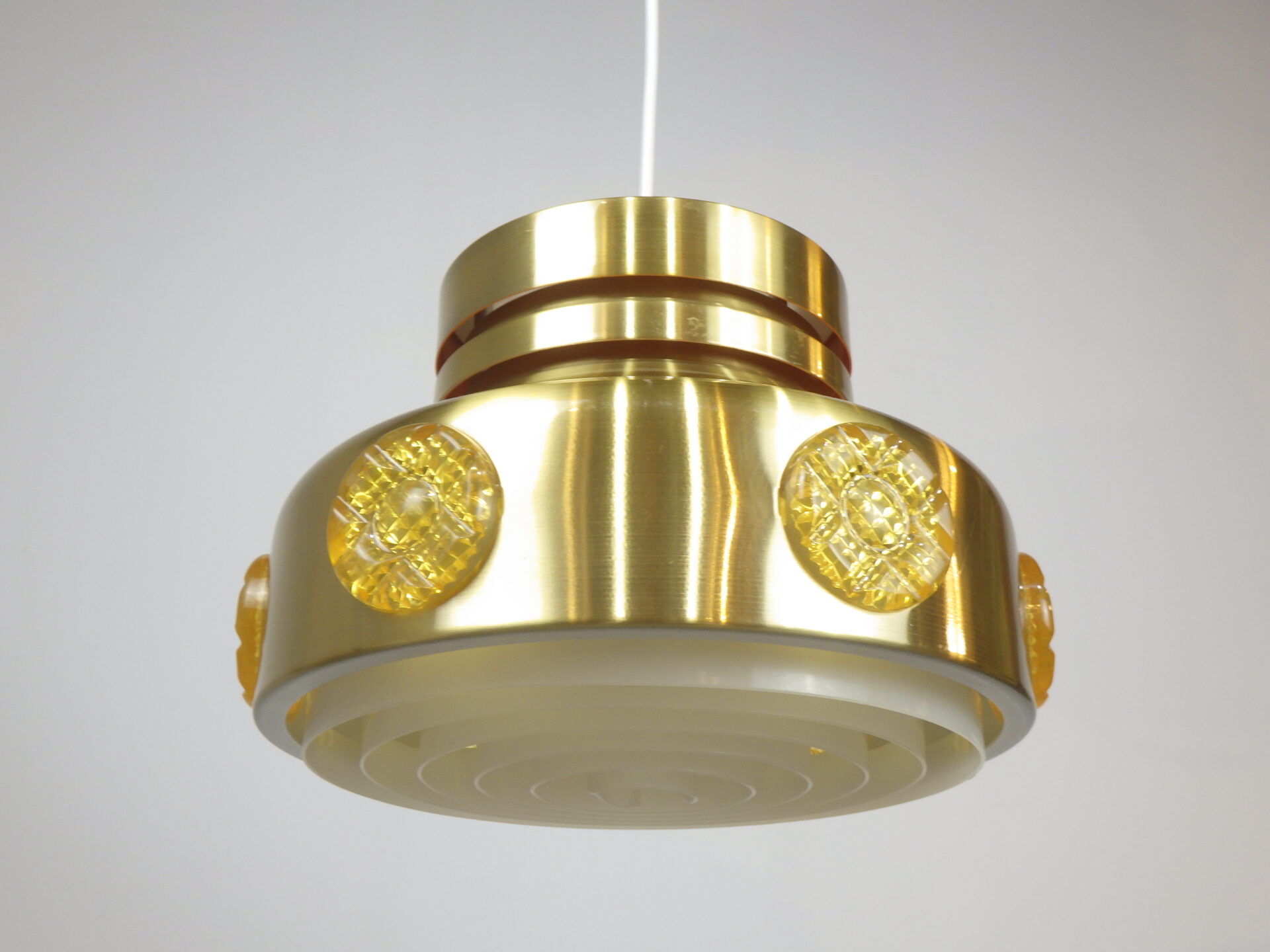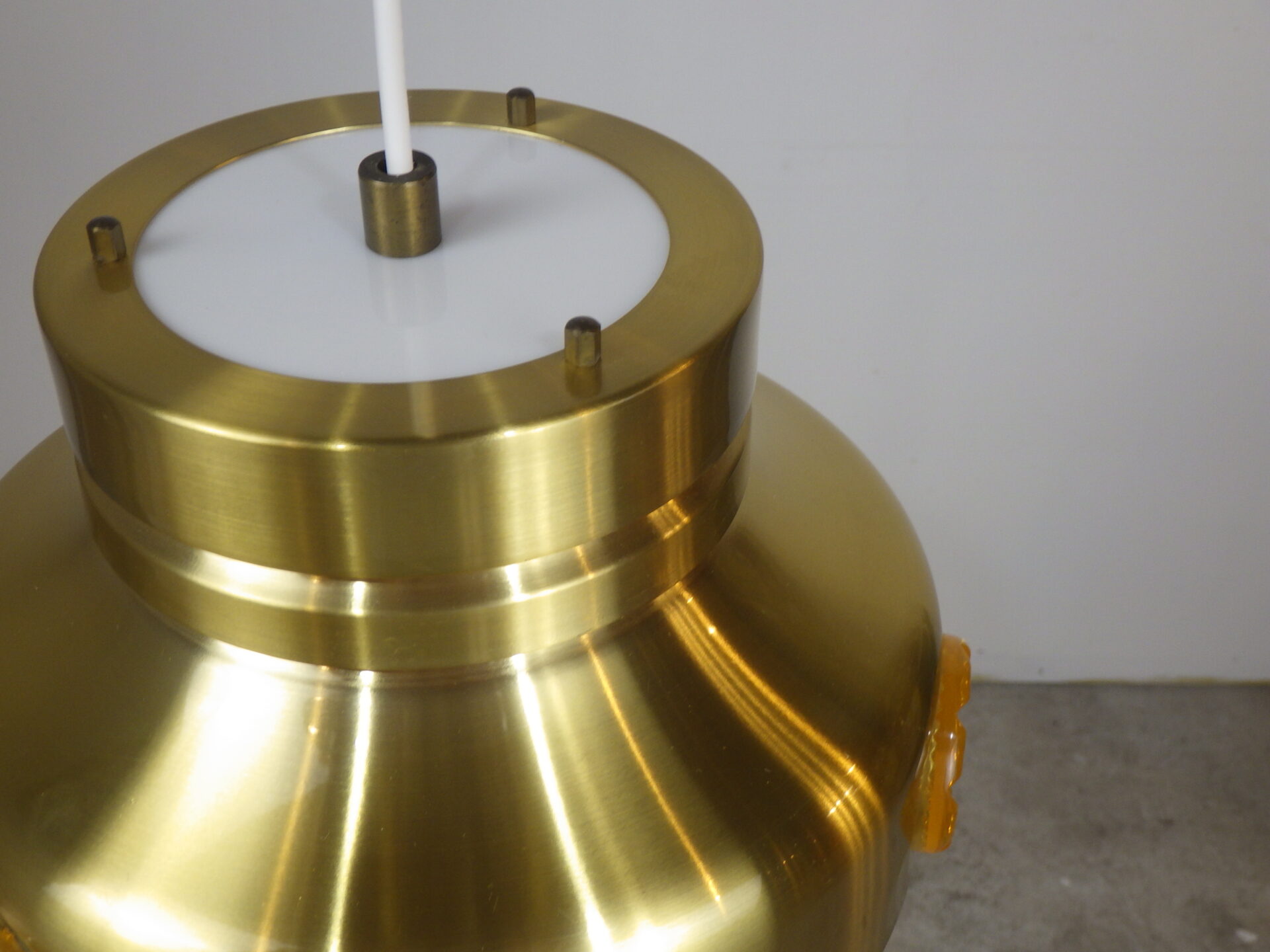 | ヨーロッパで買い付けました。 デンマーク製、UFOペンダントランプです。 北欧やヨーロッパのランプに良く見られるルーバーランプ。ルーバーは過剰な光の拡散を抑え、柔らかく優しい光の波を演出してくれる効果があります。 メタリックゴールドと、サイドのイエロー、そして上部からは内側の塗装のオレンジが光の反射でわずかに漏れ、とても良いカラーバランス。 空間をクールにも、可愛くも出来る、印象的なアイテムです。 お部屋のアクセントに、また店舗什器としても活躍してくれそうです。 |