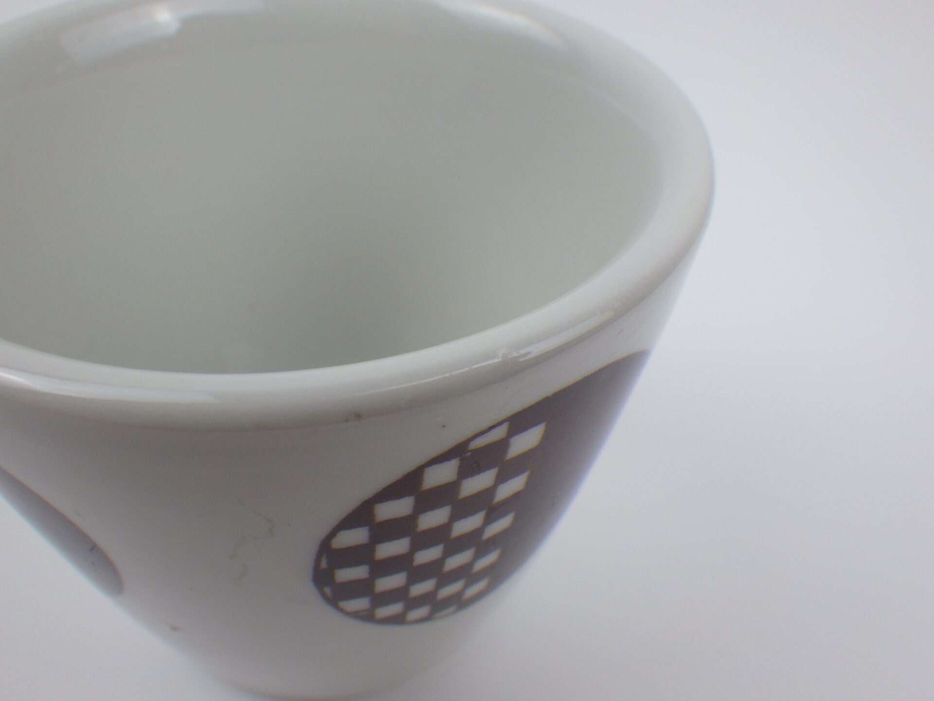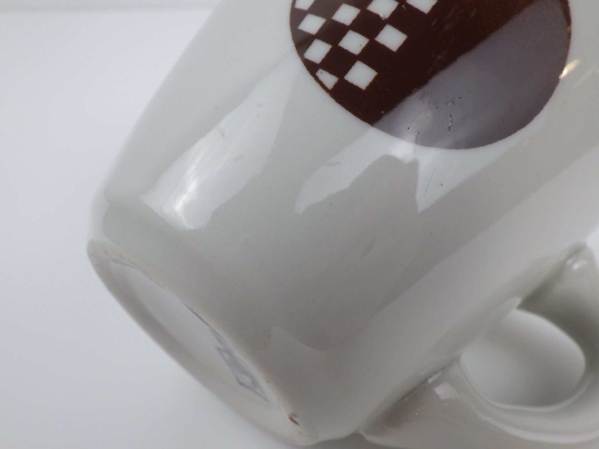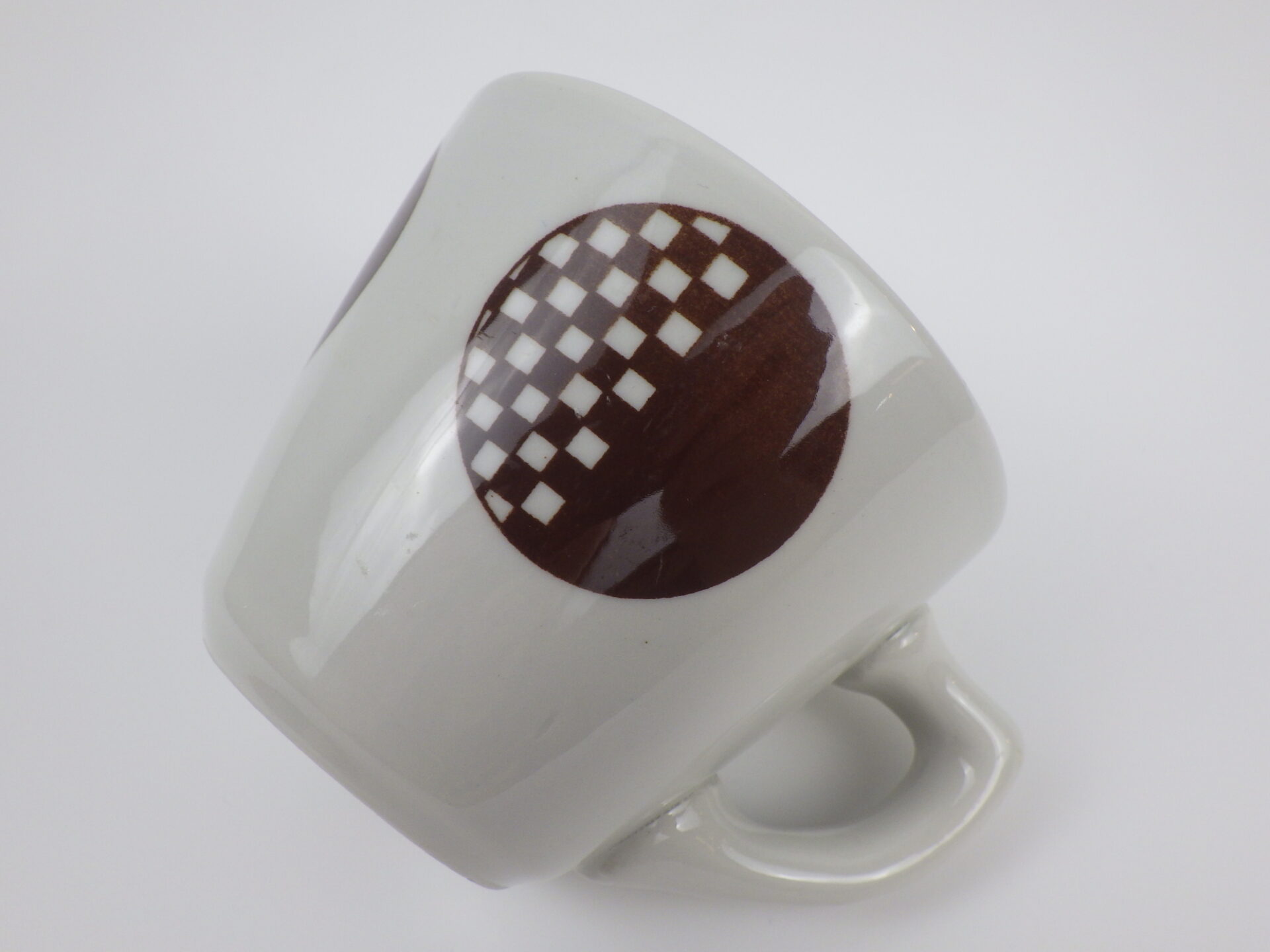 | アメリカより買い付けました、磁器製のマグです。 陶器よりも割れにくく丈夫な作りですので、レストラン、ダイナー等で使われていました。 半分が格子柄になっている円がぐるりと一周プリントされたこちらのマグ。 朝のコーヒータイムにいかがですか? |