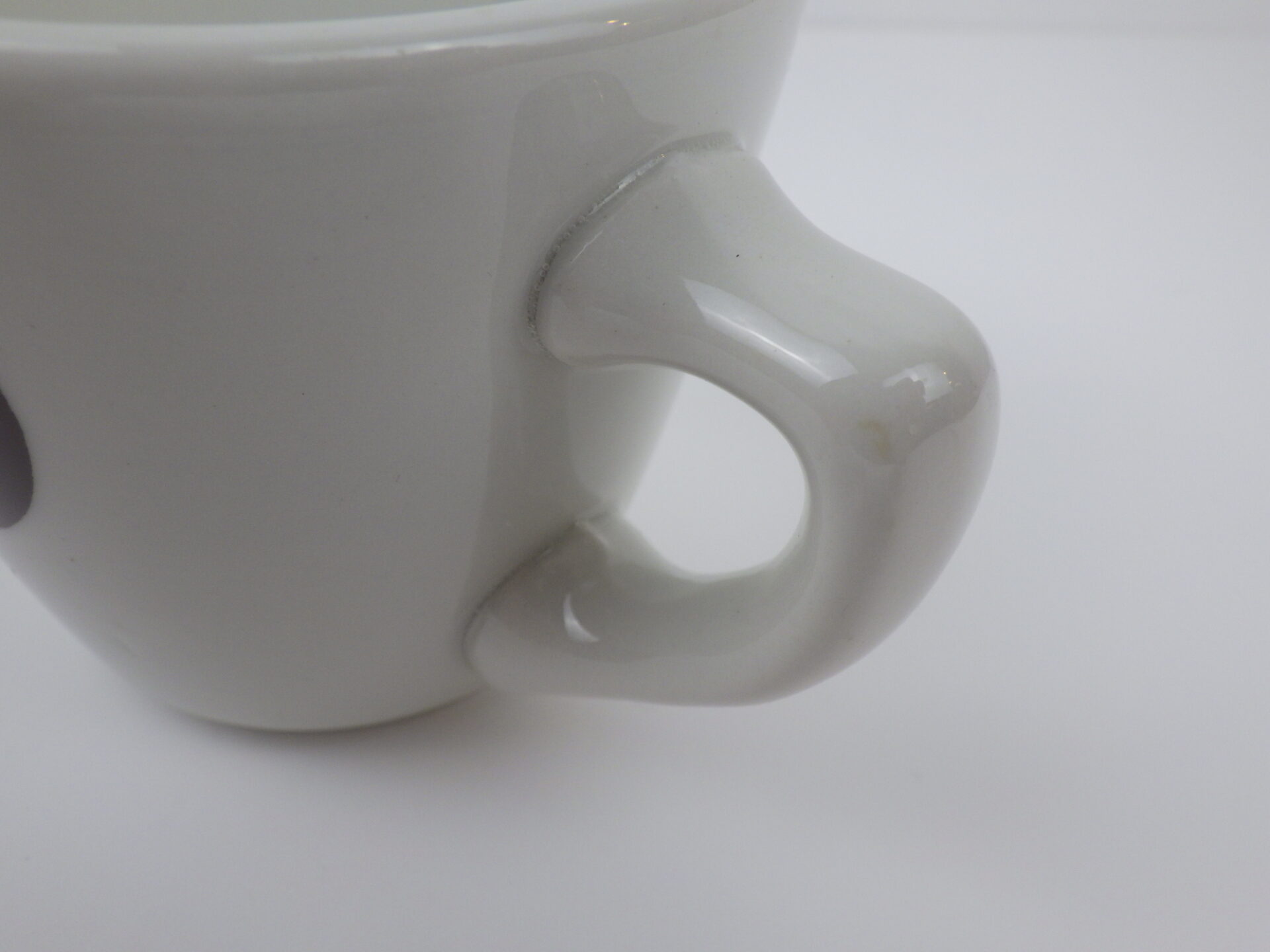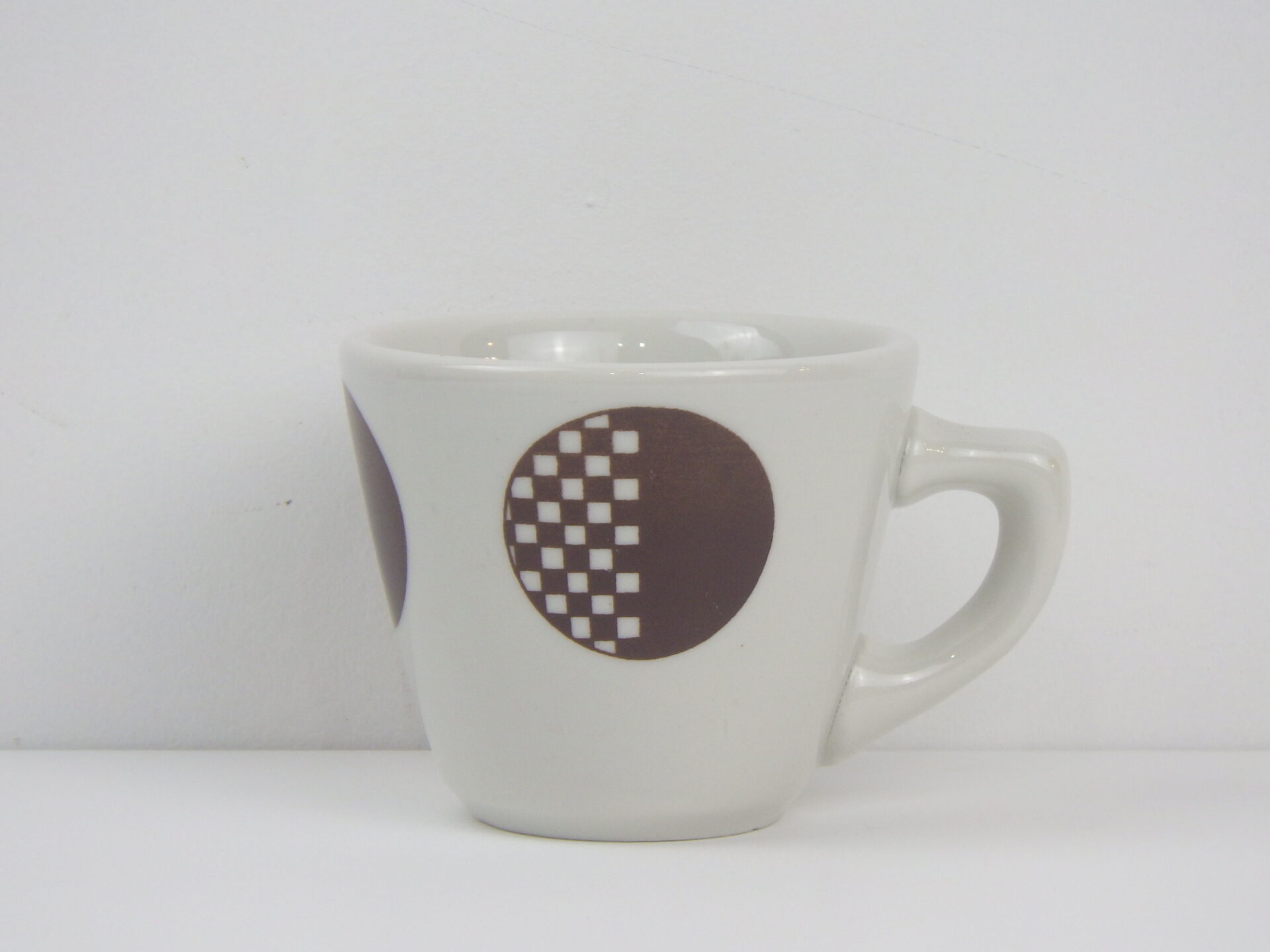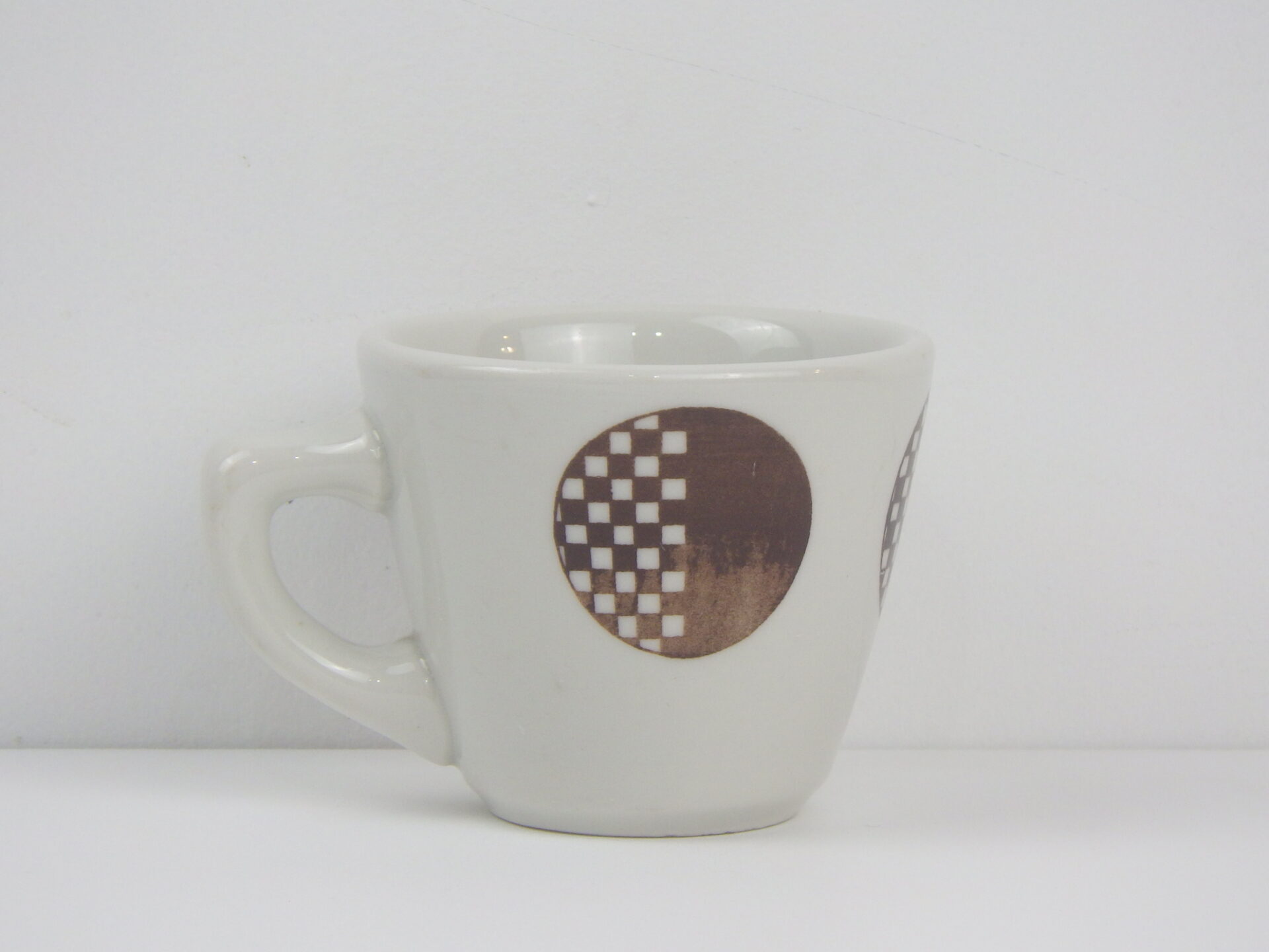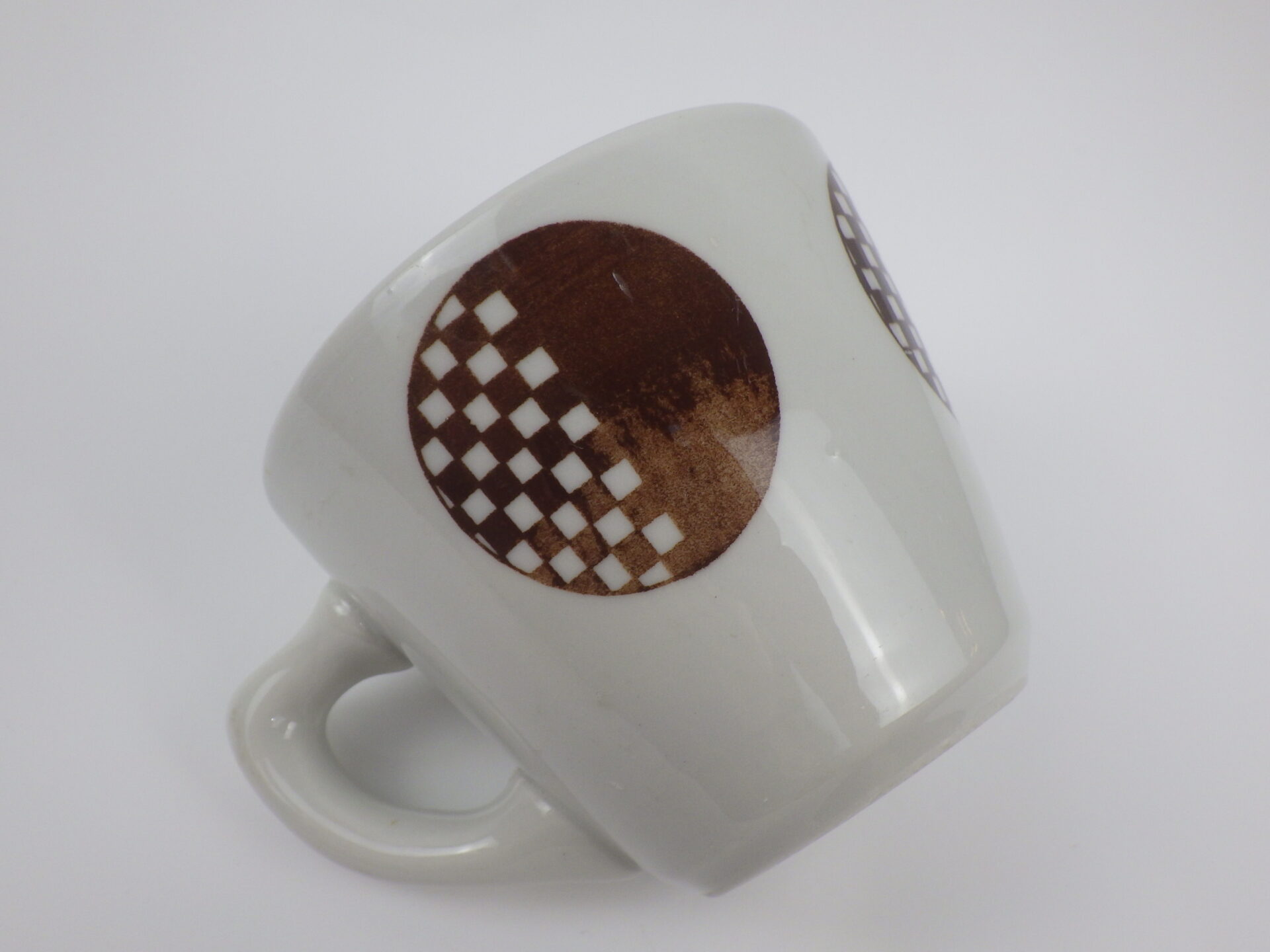 | アメリカより買い付けました、磁器製のマグです。 陶器よりも割れにくく丈夫な作りですので、レストラン、ダイナー等で使われていました。 半分が格子柄になっている円がぐるりと一周プリントされたこちらのマグ。 朝のコーヒータイムにいかがですか? |