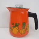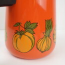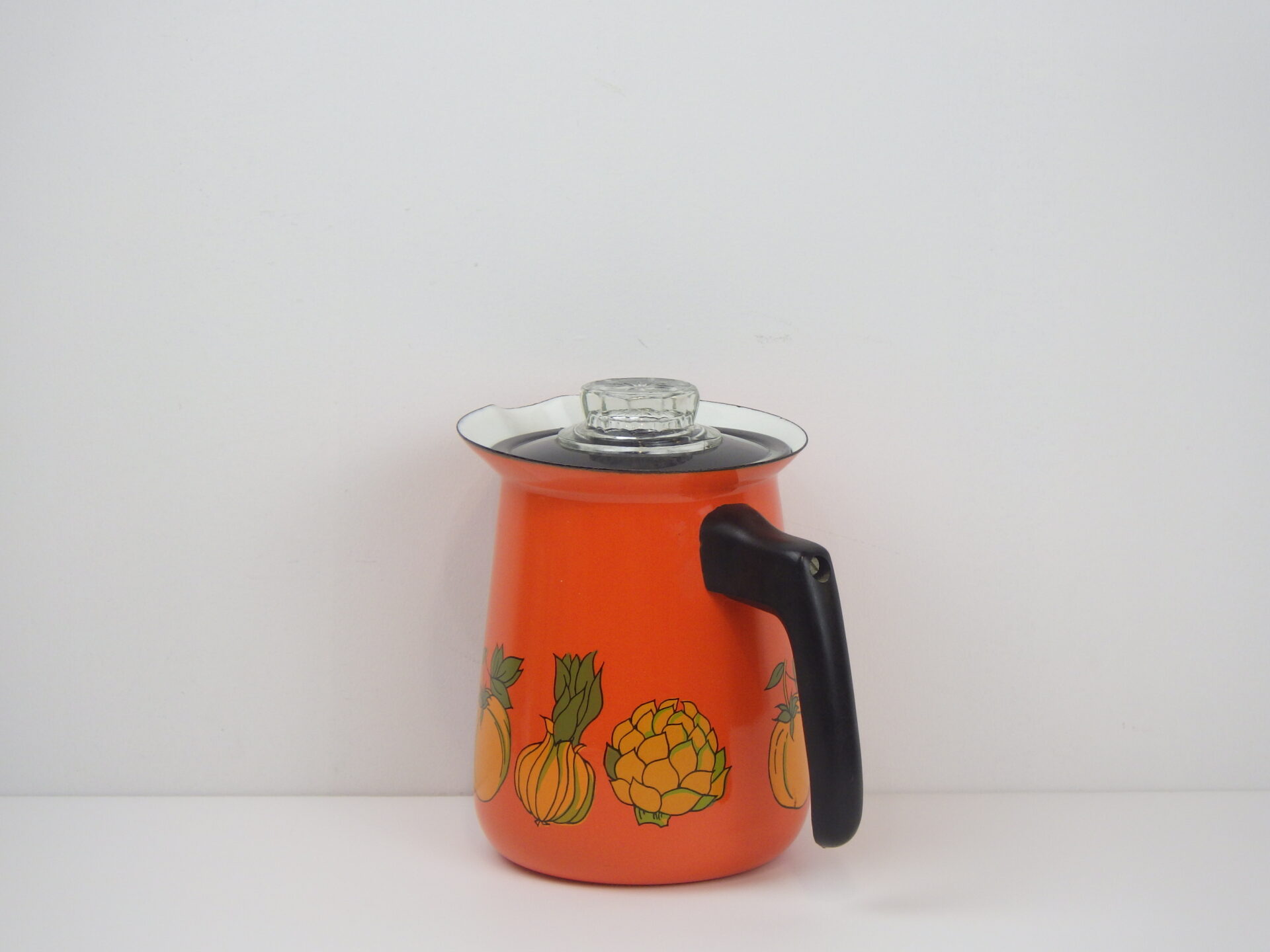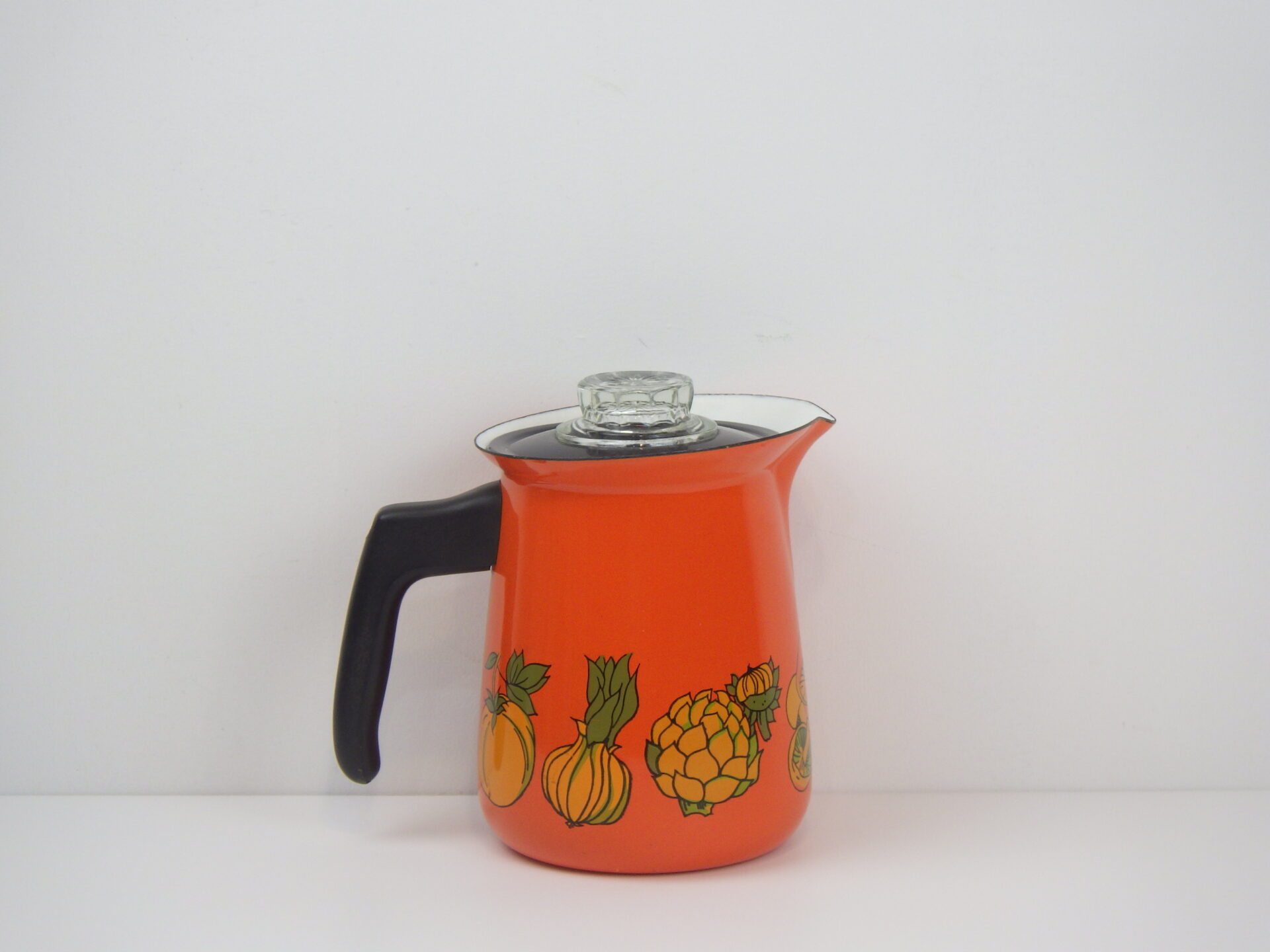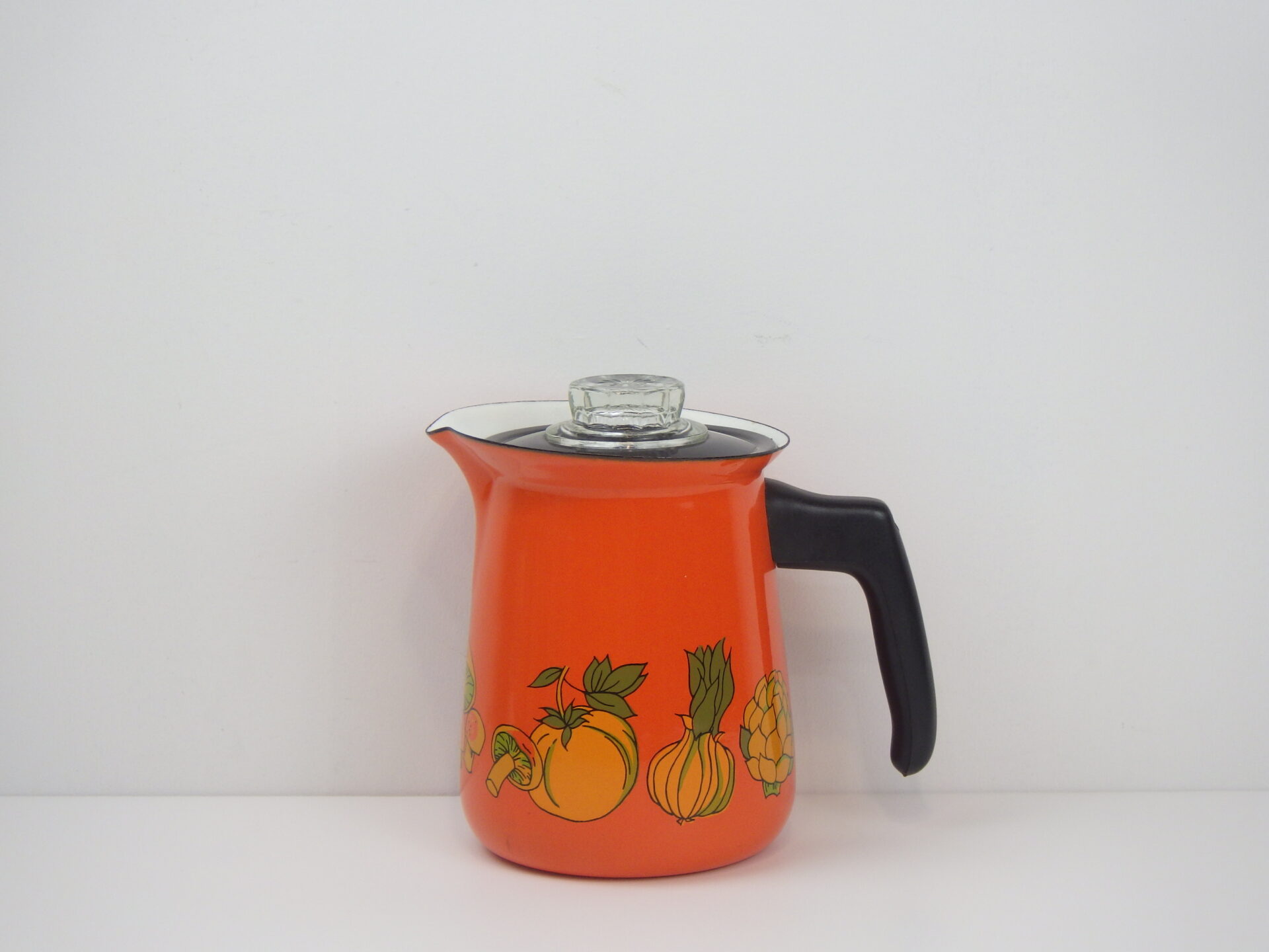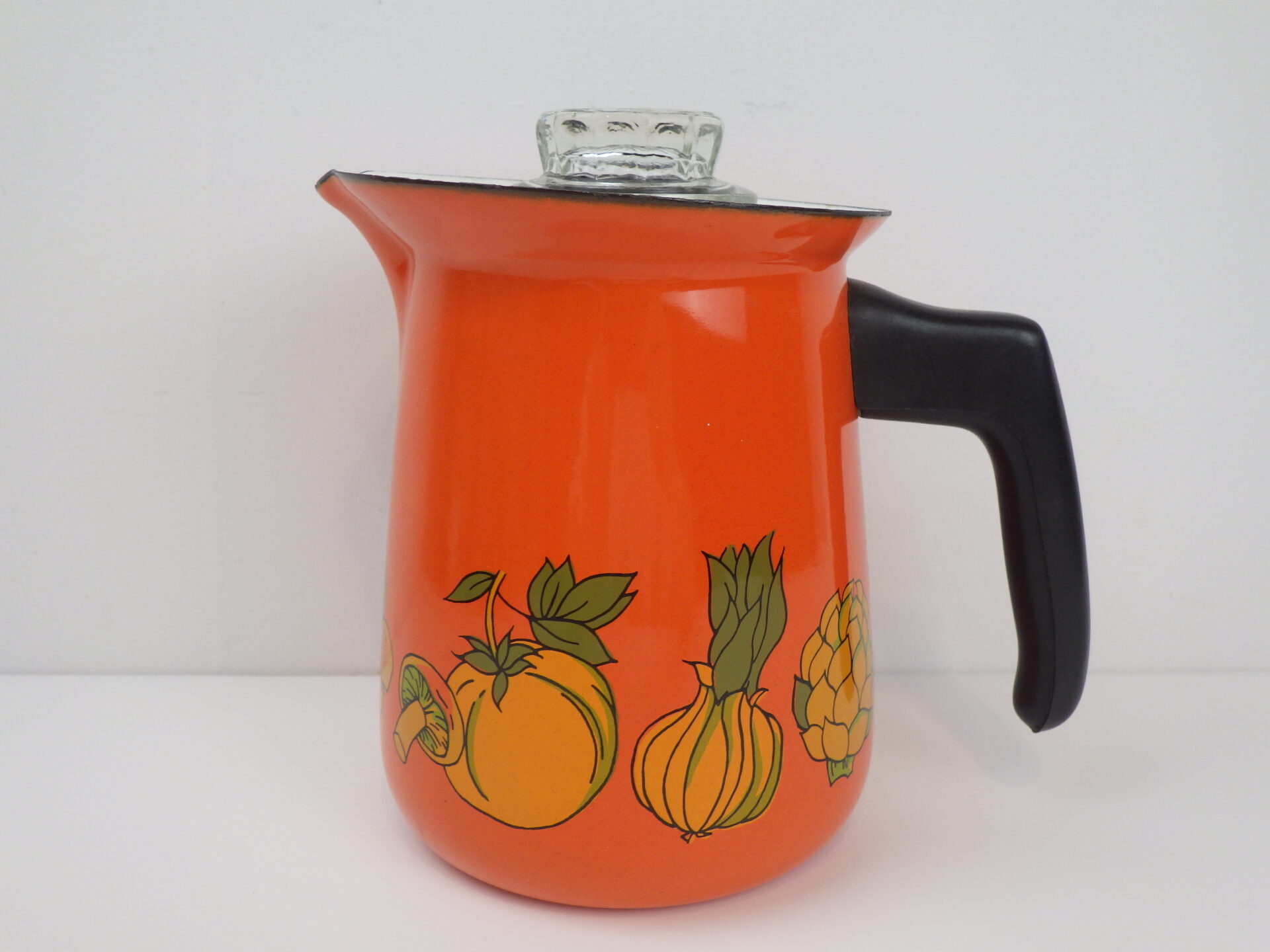 | アメリカで買い付けました。 ビンテージのエナメルパーコレーターです。 鮮やかなオレンジのボディに、野菜やマッシュルームがアクセントとして描かれているレトロなアイテム。 中を抜いてピッチャーとしてご使用も可能です。 キャンプなどに持ち出すのにも良いサイズ感です。 (写真では分かりづらいですが、蓋はプラスチック製です) |