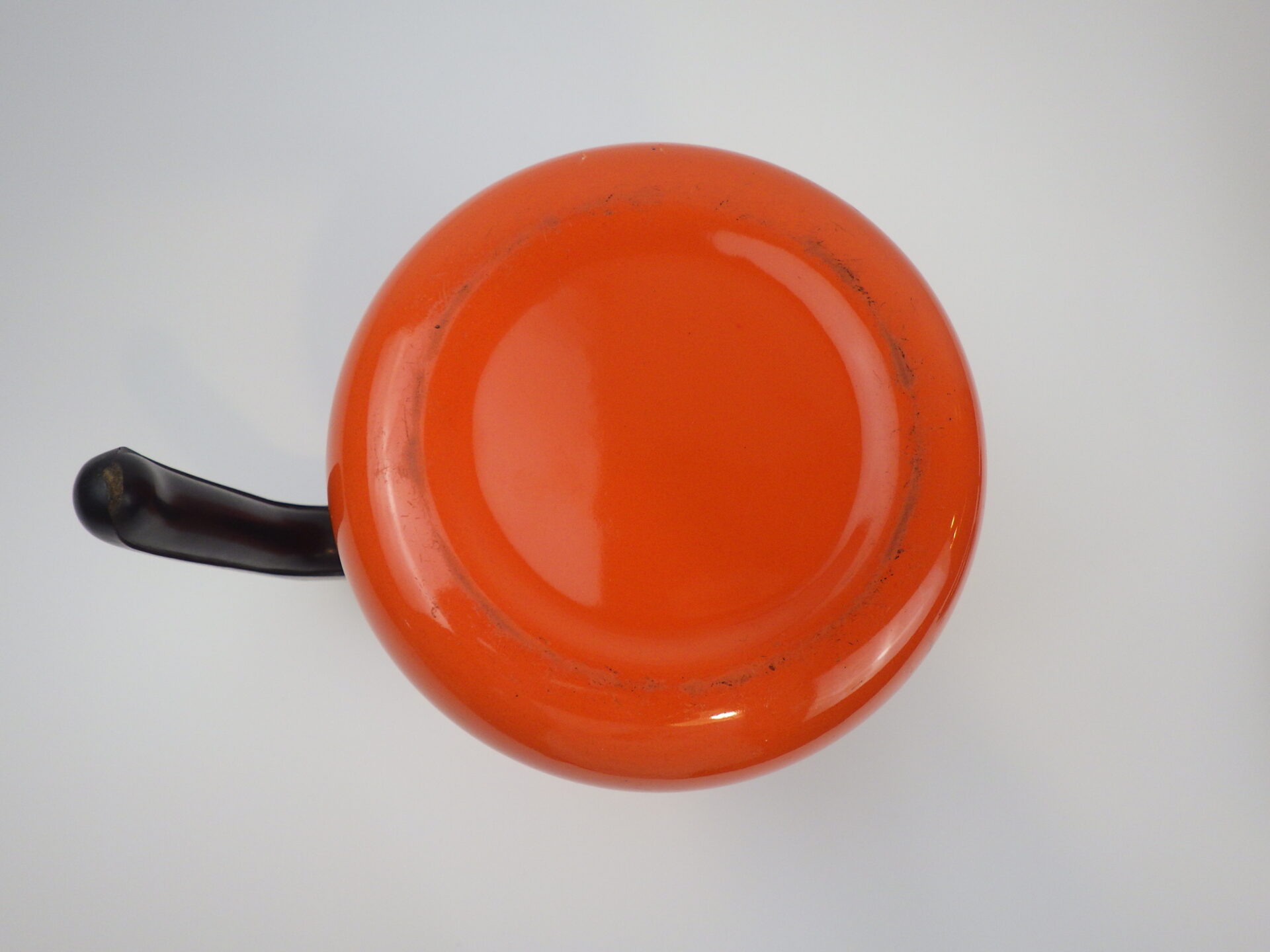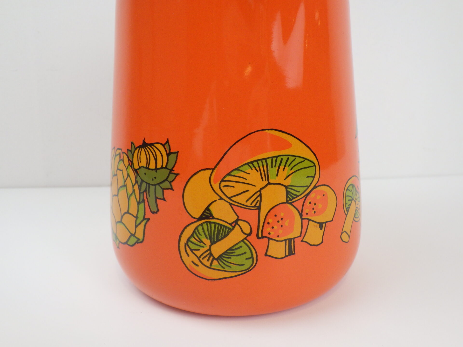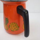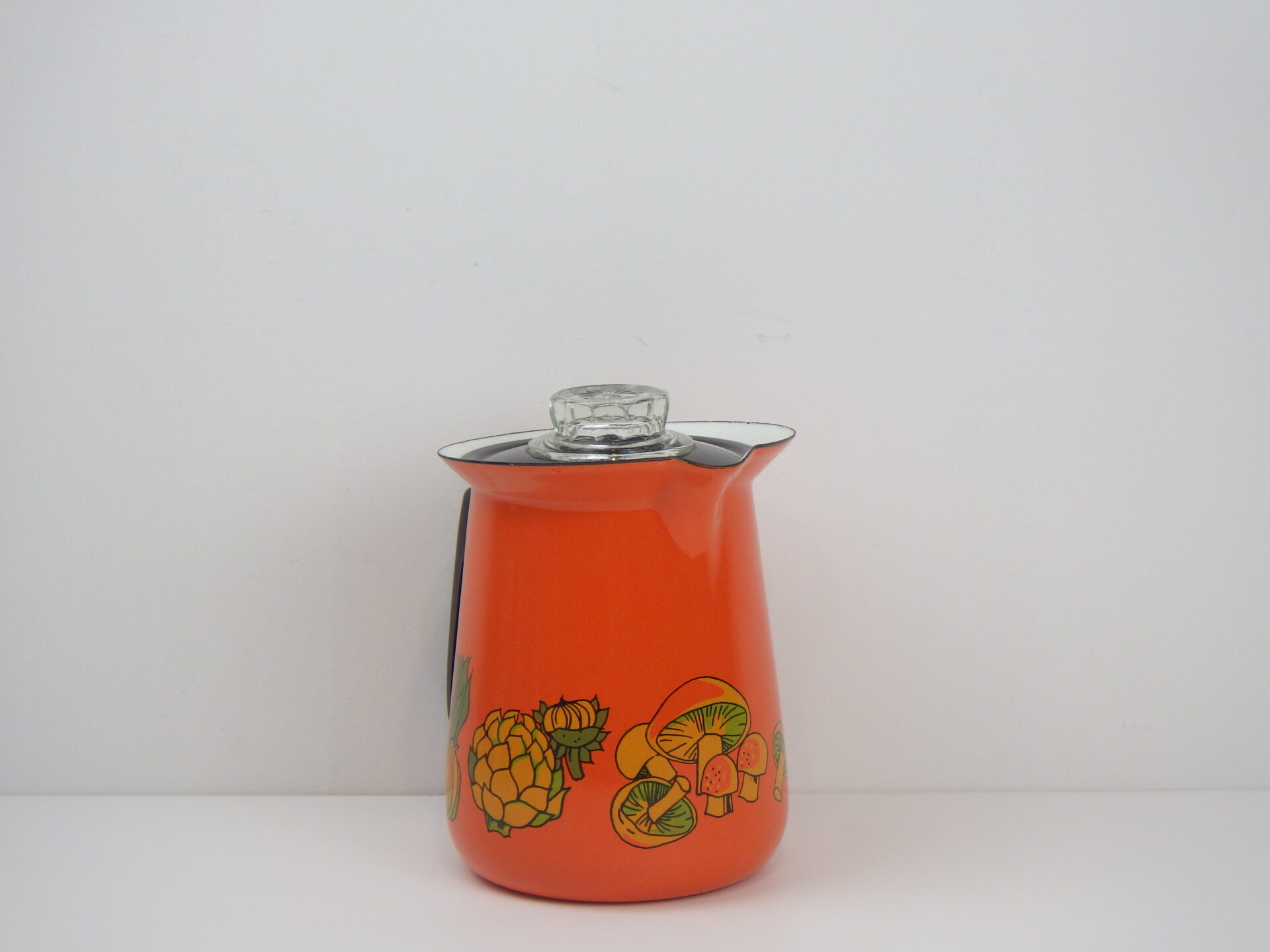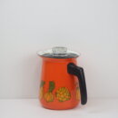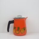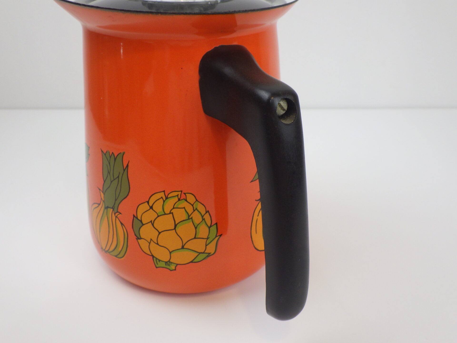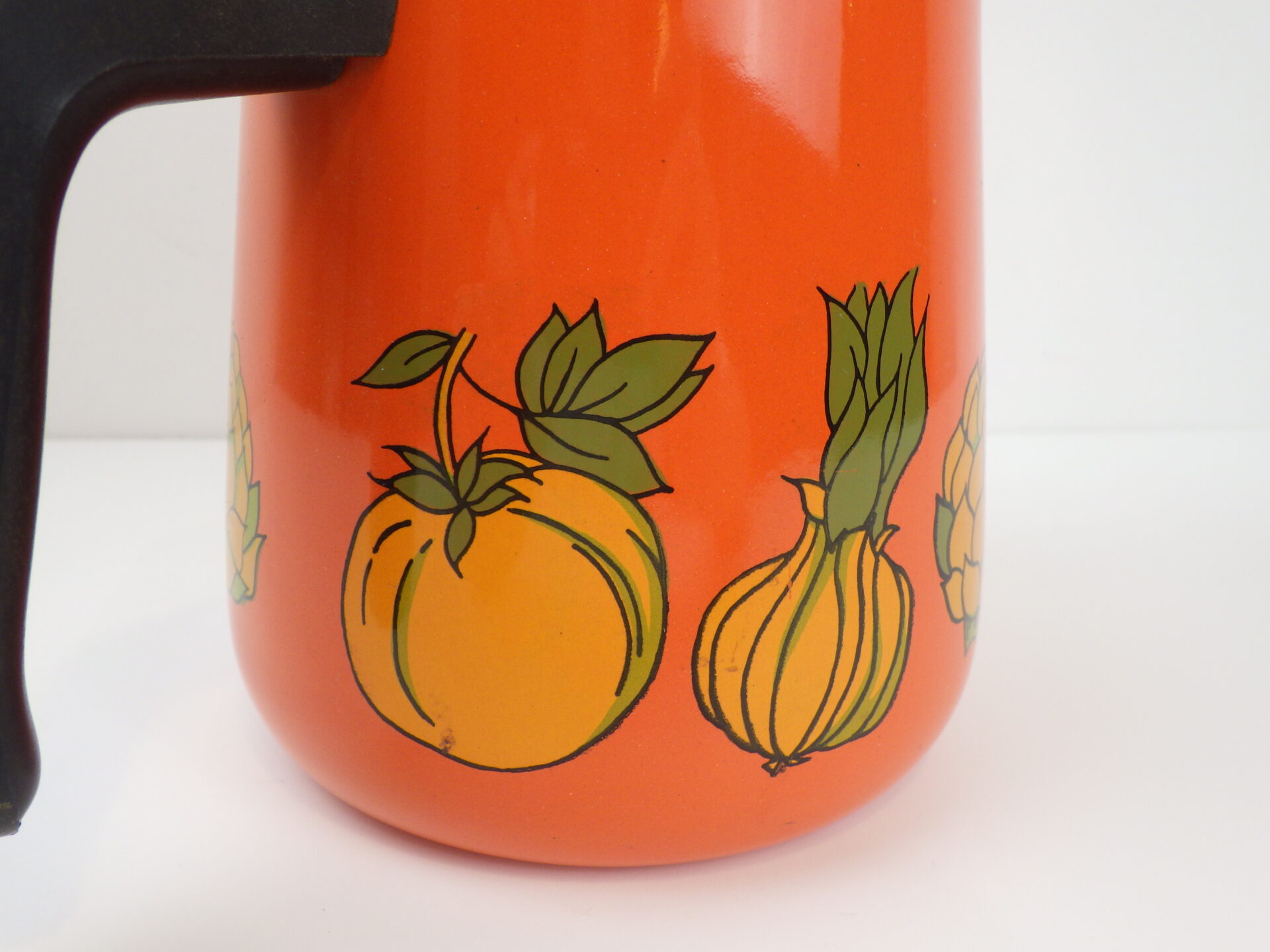 | アメリカで買い付けました。 ビンテージのエナメルパーコレーターです。 鮮やかなオレンジのボディに、野菜やマッシュルームがアクセントとして描かれているレトロなアイテム。 中を抜いてピッチャーとしてご使用も可能です。 キャンプなどに持ち出すのにも良いサイズ感です。 (写真では分かりづらいですが、蓋はプラスチック製です) |
