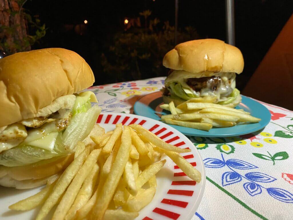 夜のメインは具材たっぷりハンバーガー。