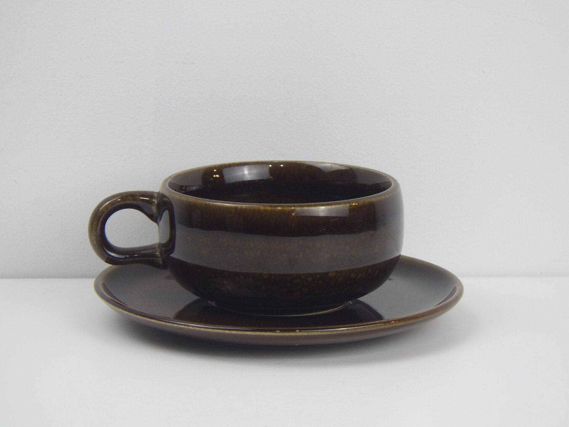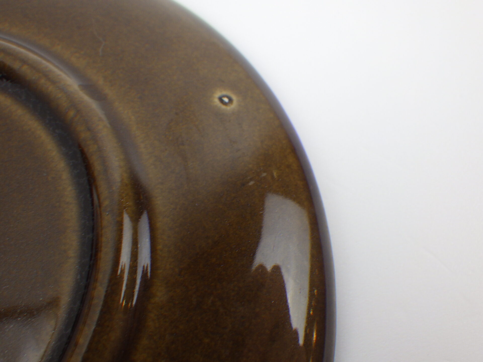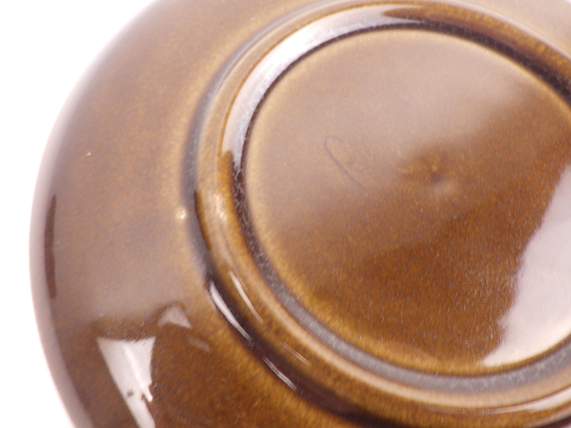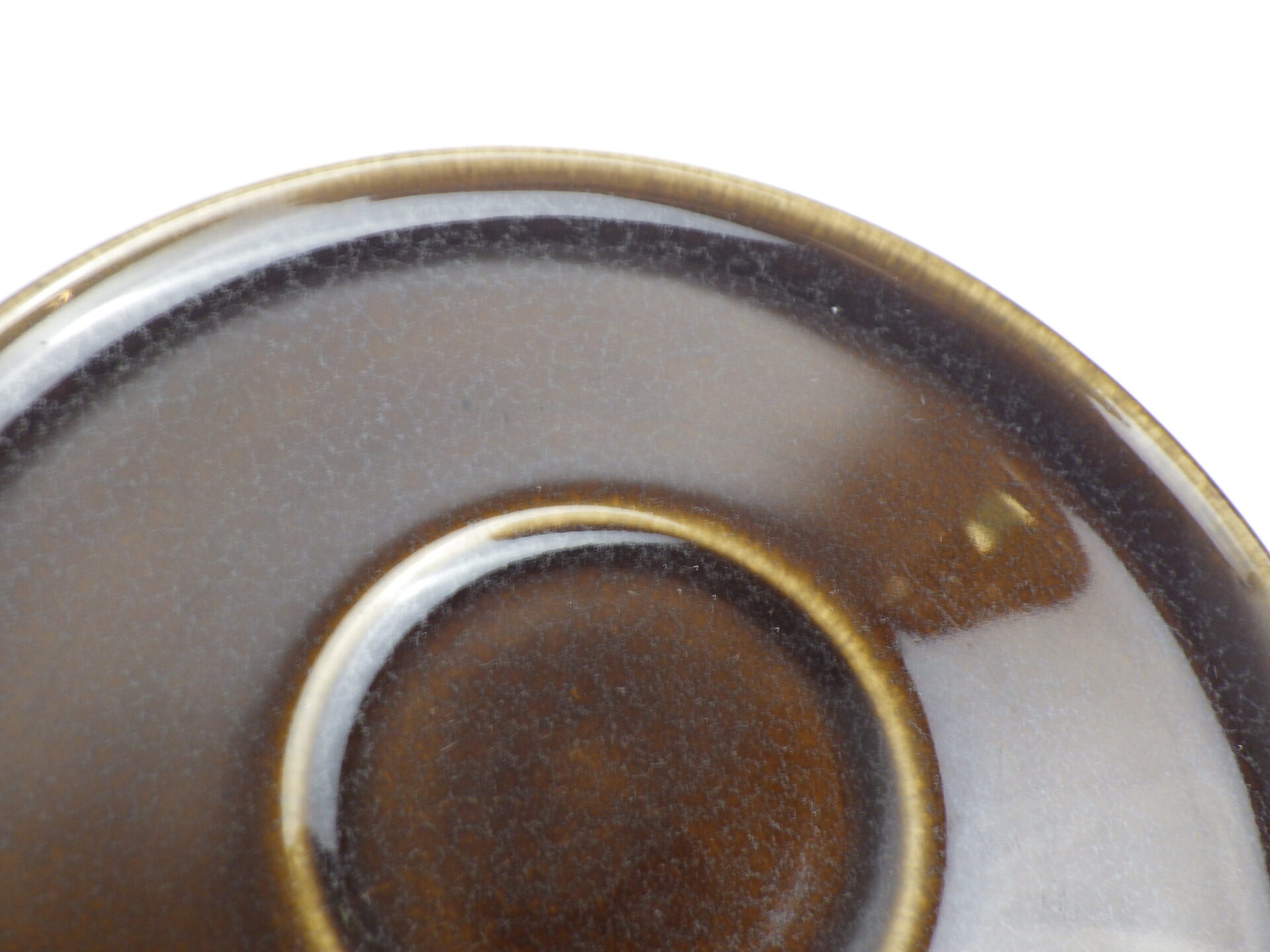 | アメリカを代表する工業デザイナー「ラッセル・ライト」デザインによる、1939年から1959年に製造されたSteubenville(スチューベンヴィル)社製のアメリカンモダンシリーズです。 ラッセル・ライトは、それまでの時代の主流であった華美な装飾を廃し、機能的でシンプル、それでいてデザイン的で安価な食器を生み出し、当時のアメリカにおける食器の価値観を大きく変えました。 こちらのC&Sはラッセルライトらしい丸みがあり、縁がぽってりしているデザインで、時代を経ても全く古めかしさを感じません。 ブラウンカラーは濃い部分と薄い部分があり、それが個体によって表情を変えるため、同じものが一つとして存在しないところも心をくすぐられますね。 |