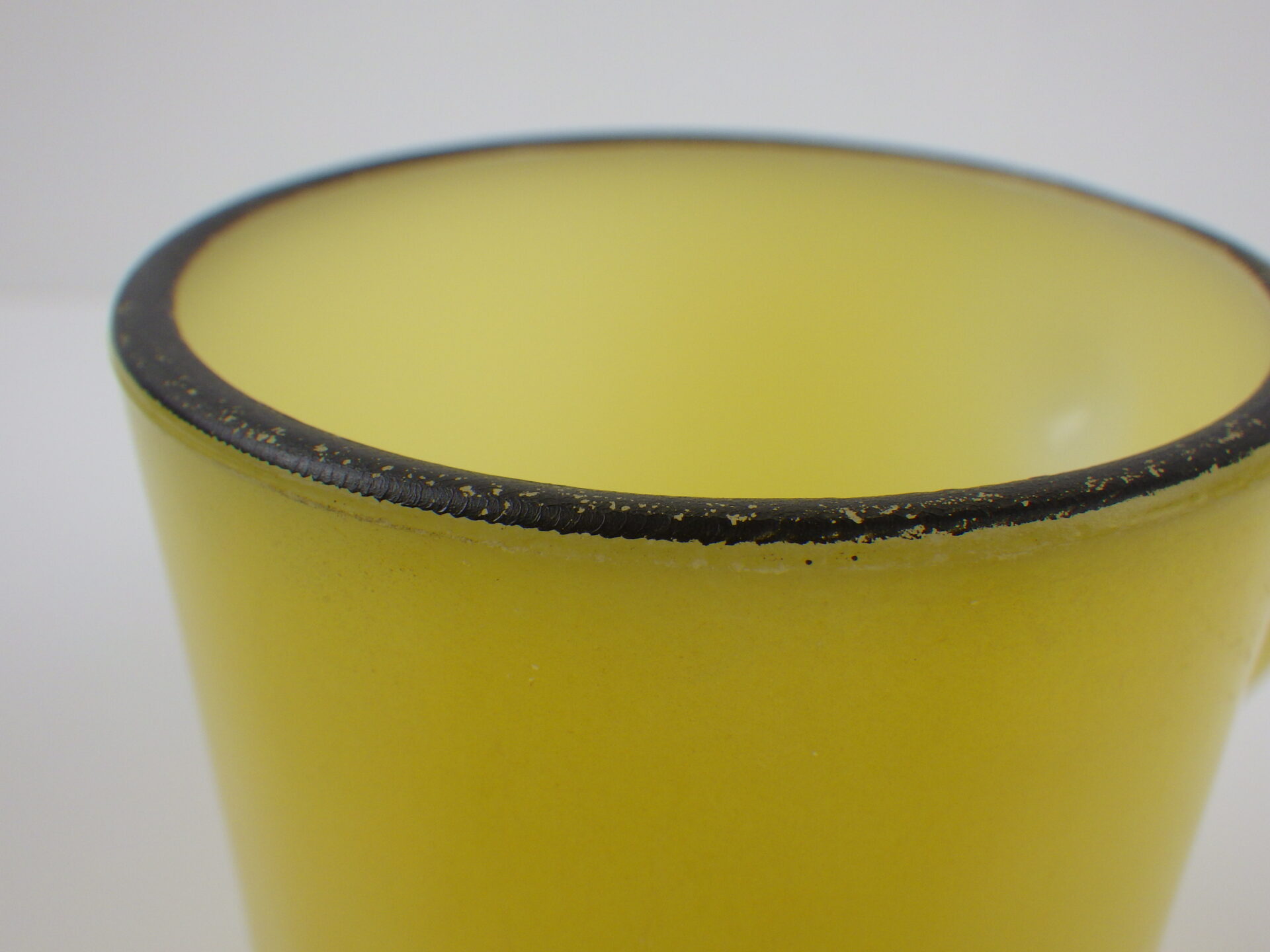 | スタッキング(積み重ね)出来るタイプのマグです。 こちらはリムにブラックペイントが施された「BOLD COLORS」シリーズのものです。 当時、アメリカの一般家庭で使用されていたものなので、比較的お手頃価格で気兼ねなく使っていただけます。 飾って良し、使って良しのアイテムです。 |