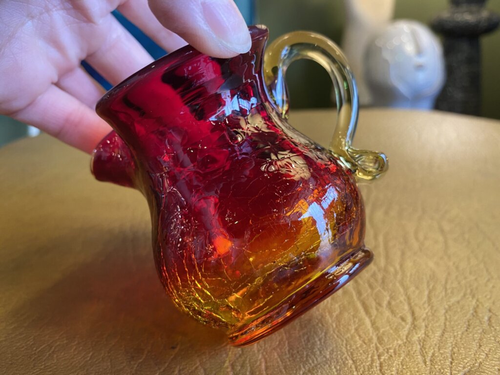 持ち手はイエロー(アンバー?)で、ボディは上の方が濃い赤、下につれてグラデーションっぽくオレンジになっていきますが、見る角度によって色が変わって見えます。