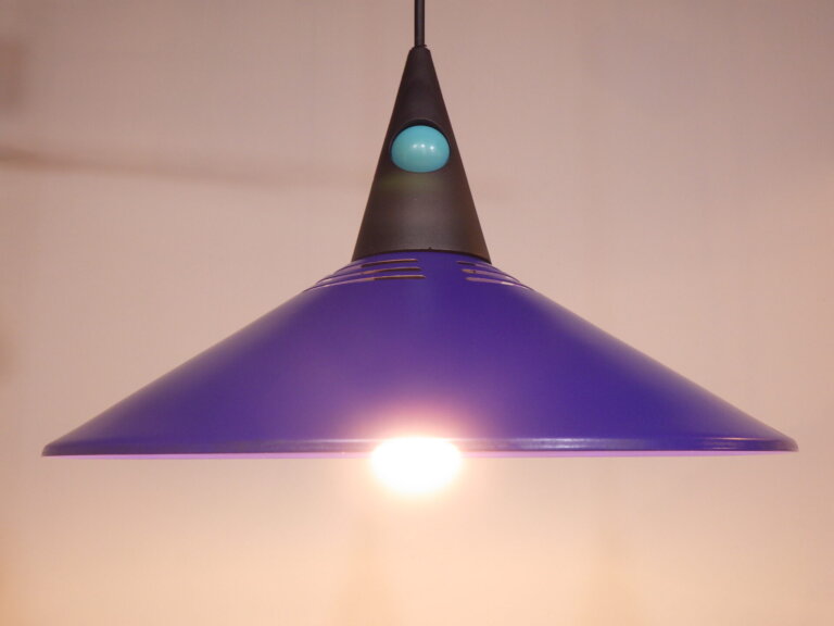 | ヨーロッパで買い付けました。 西ドイツ、Brilliant Leuchten社製、メンフィススタイル ペンダントランプです。 レトロリバイバルとして注目されているポップアート「メンフィススタイル」。 ビビットカラーとランダムな幾何学パターンが特徴ですが、こちらのペンダントランプはまさにメンフィススタイルを象徴するデザインですね。 明かりを灯していない姿も印象的なブルーカラーが、お部屋のアクセントになってくれそう。 スペースエイジな印象もあるので、モダンスタイルにもよく合いそうです。 |