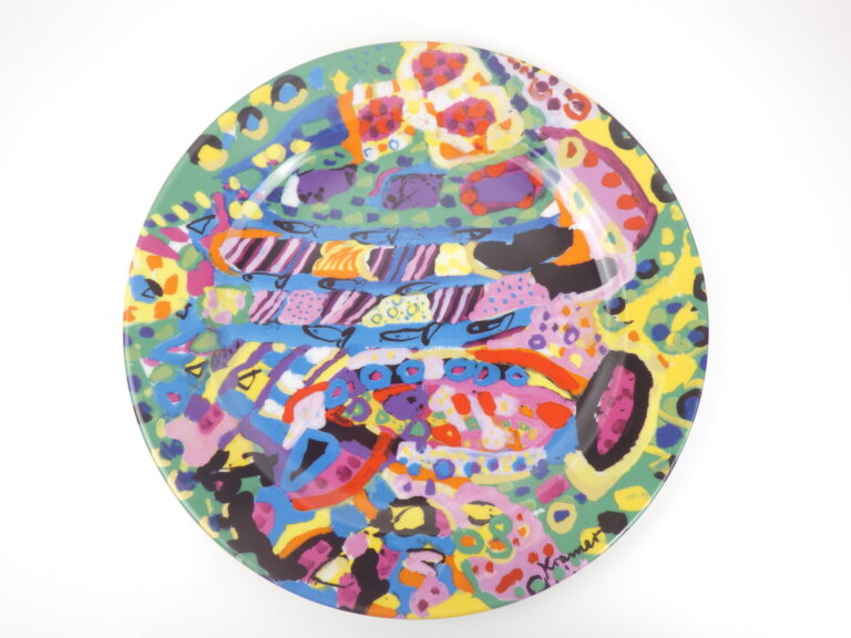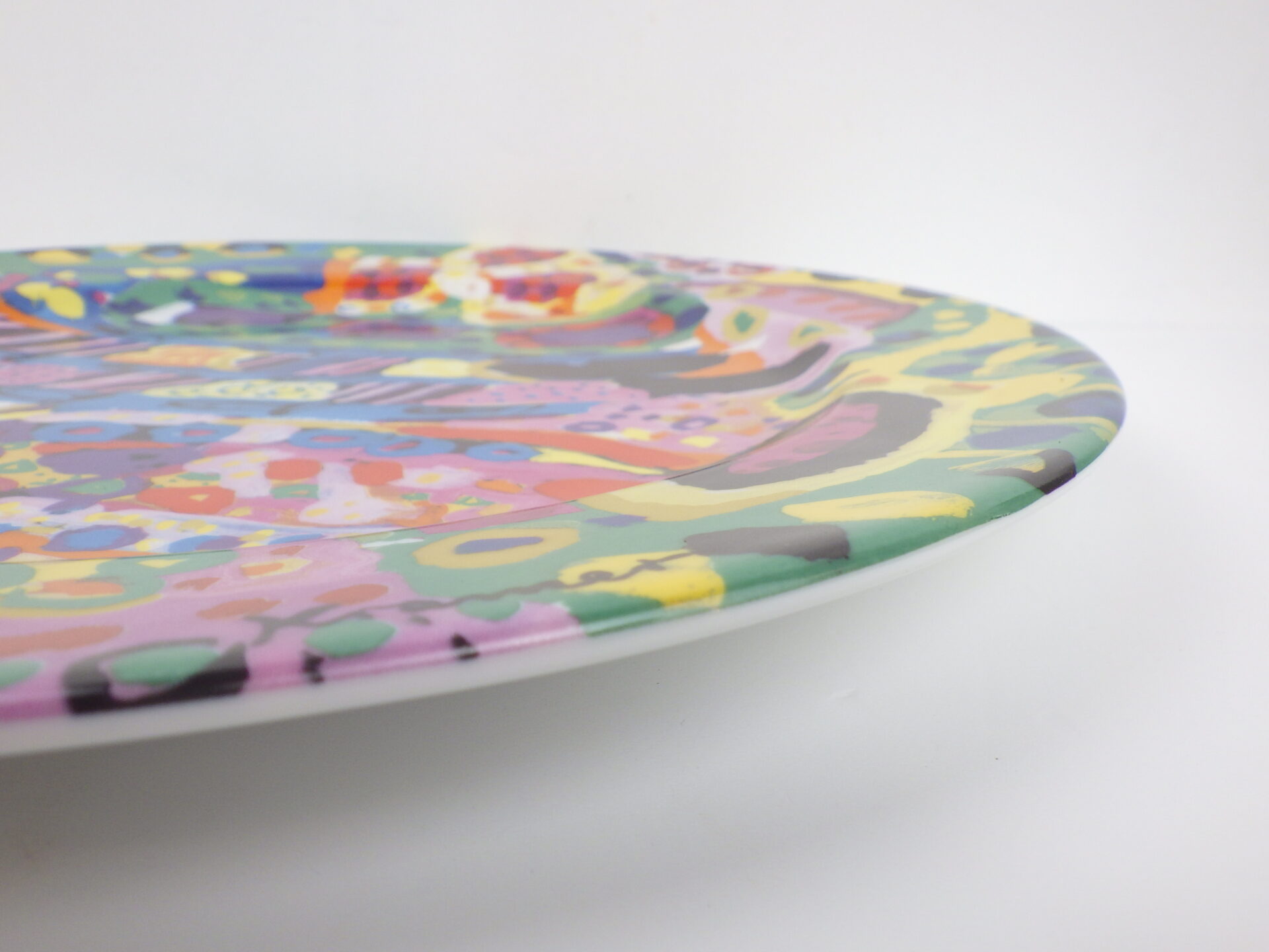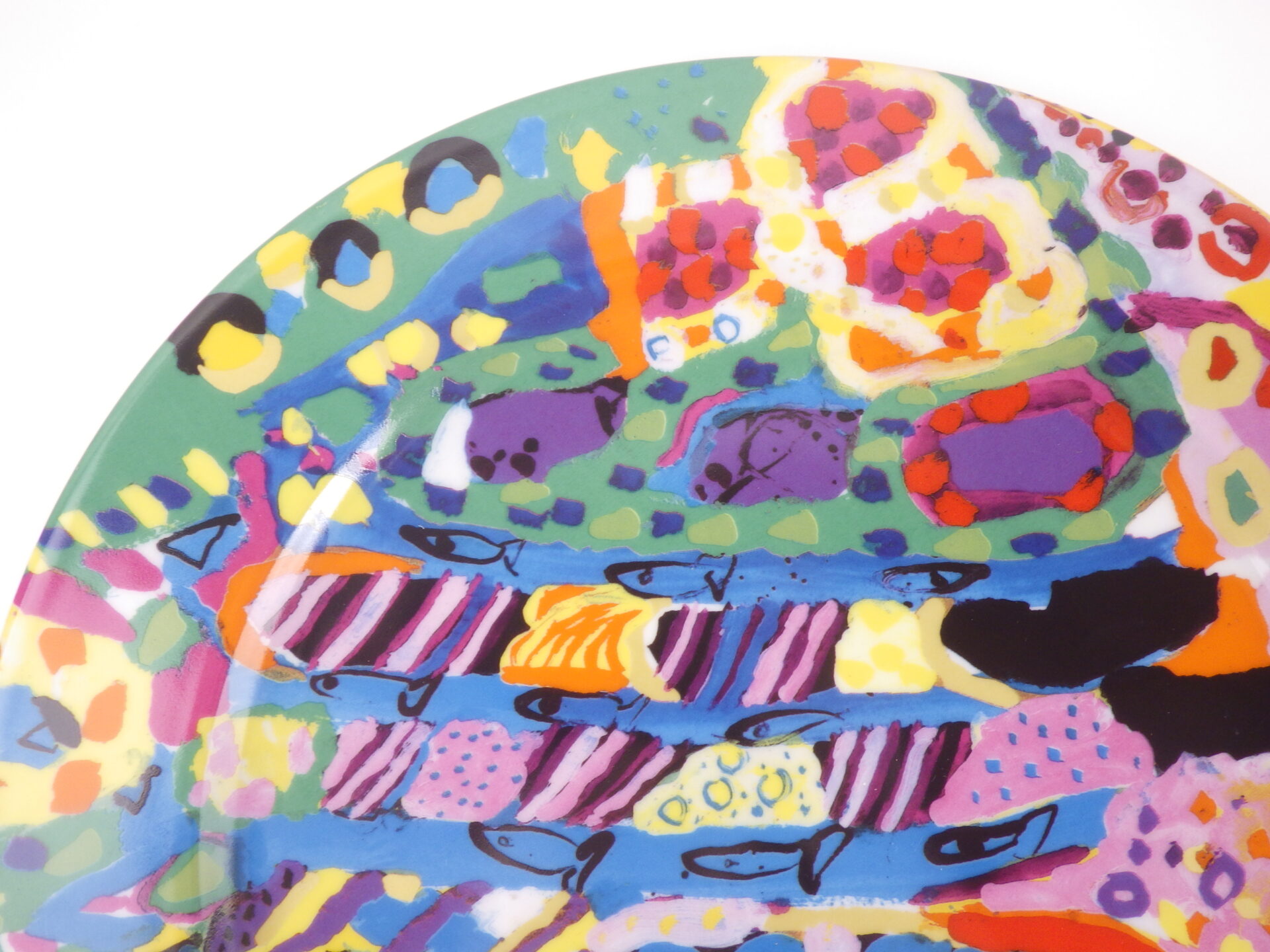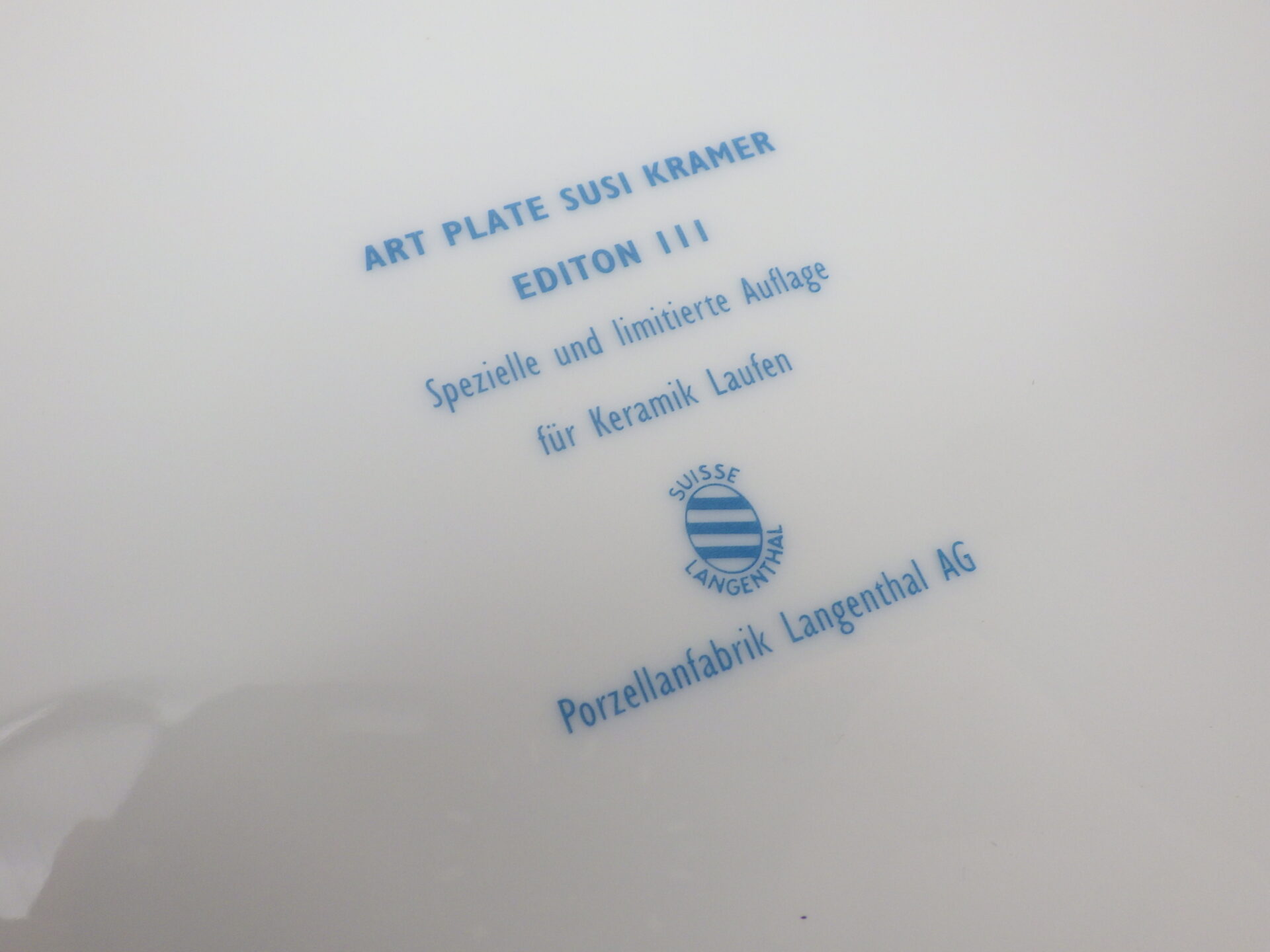 | アメリカで買い付けました。 スイスの老舗陶磁器メーカーLangenthal社のアートプレートです。 こちらは1947年生まれのスイス人アーティストSusi Kramerがデザインを手がけた限定プレートになります。 カラフルで独創的な作品の多い彼女らしいデザインですね。 抽象的に見えるアートの中に、良く見ると川を泳ぐ魚の姿が確認出来、可愛らしいです。 絵画作品として飾ってもインテリアのアクセントになるアイテムです。 |