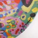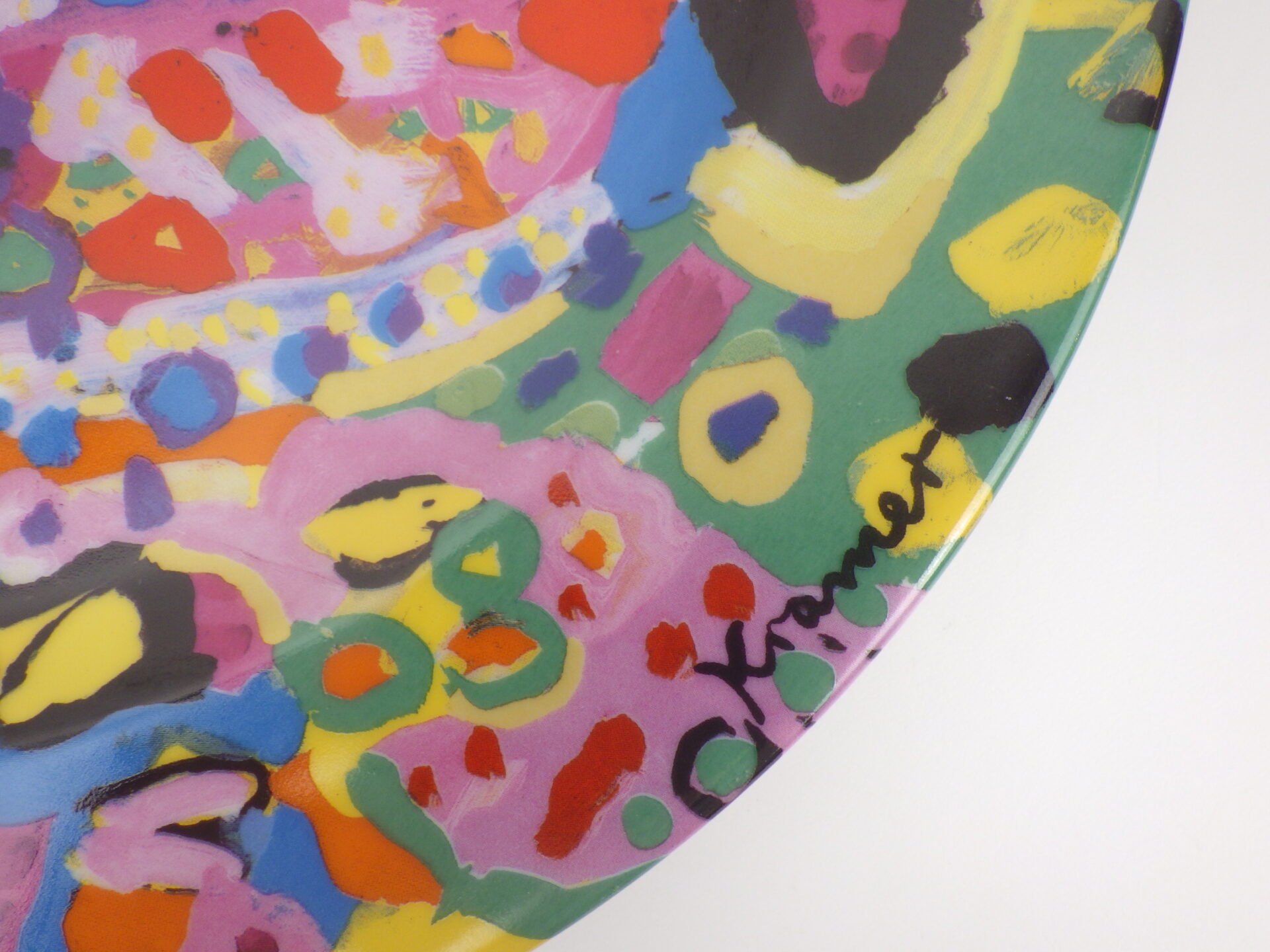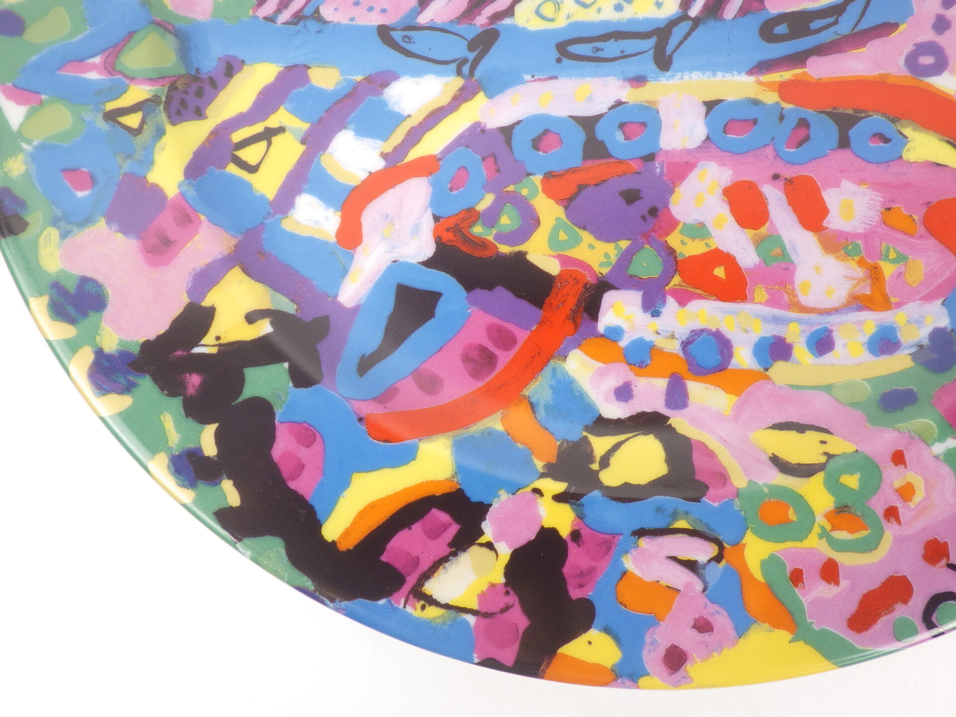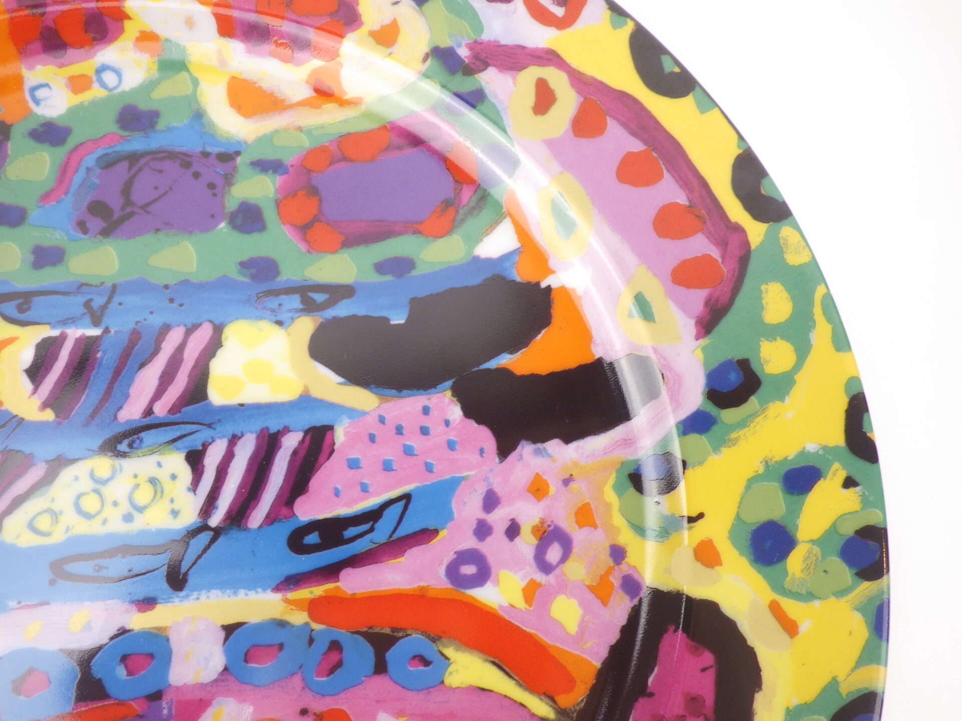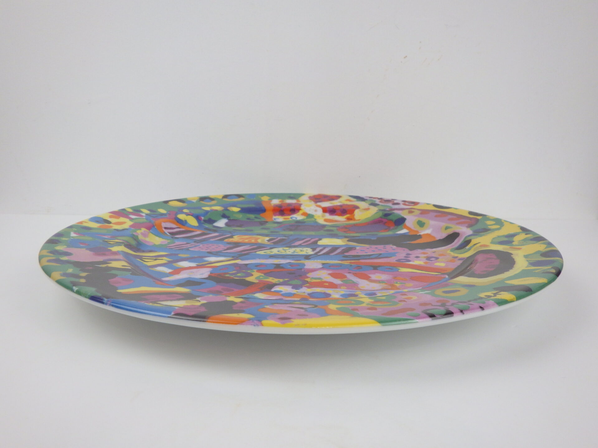 | アメリカで買い付けました。 スイスの老舗陶磁器メーカーLangenthal社のアートプレートです。 こちらは1947年生まれのスイス人アーティストSusi Kramerがデザインを手がけた限定プレートになります。 カラフルで独創的な作品の多い彼女らしいデザインですね。 抽象的に見えるアートの中に、良く見ると川を泳ぐ魚の姿が確認出来、可愛らしいです。 絵画作品として飾ってもインテリアのアクセントになるアイテムです。 |