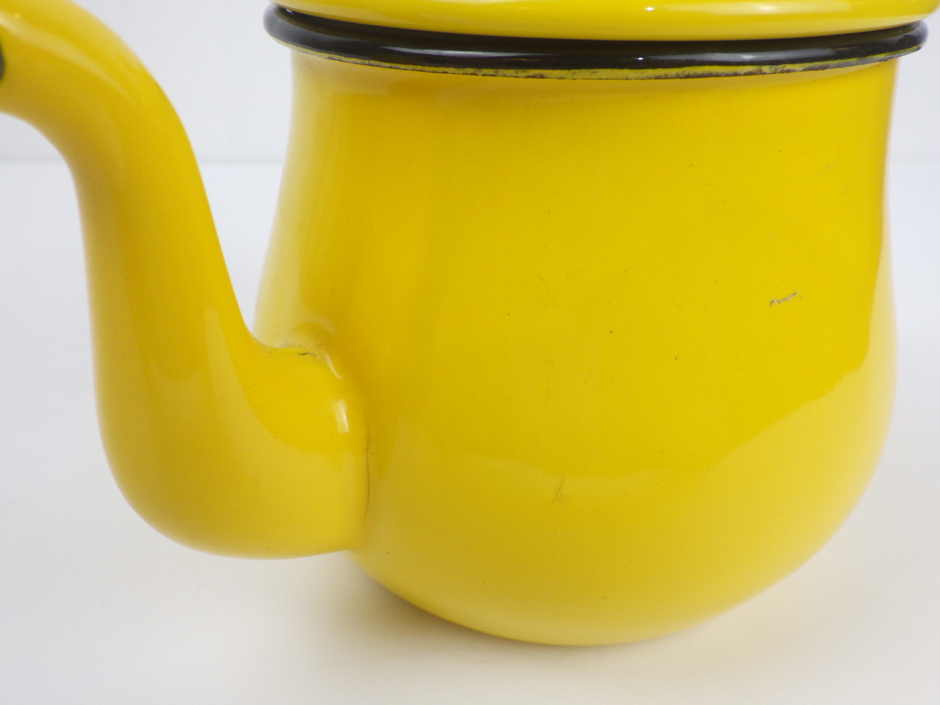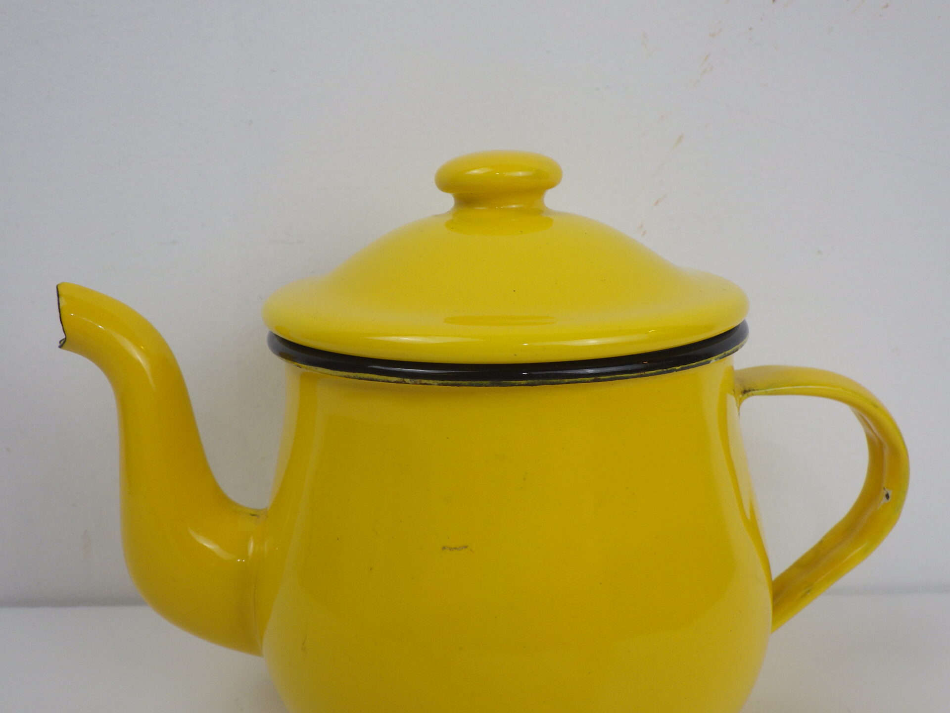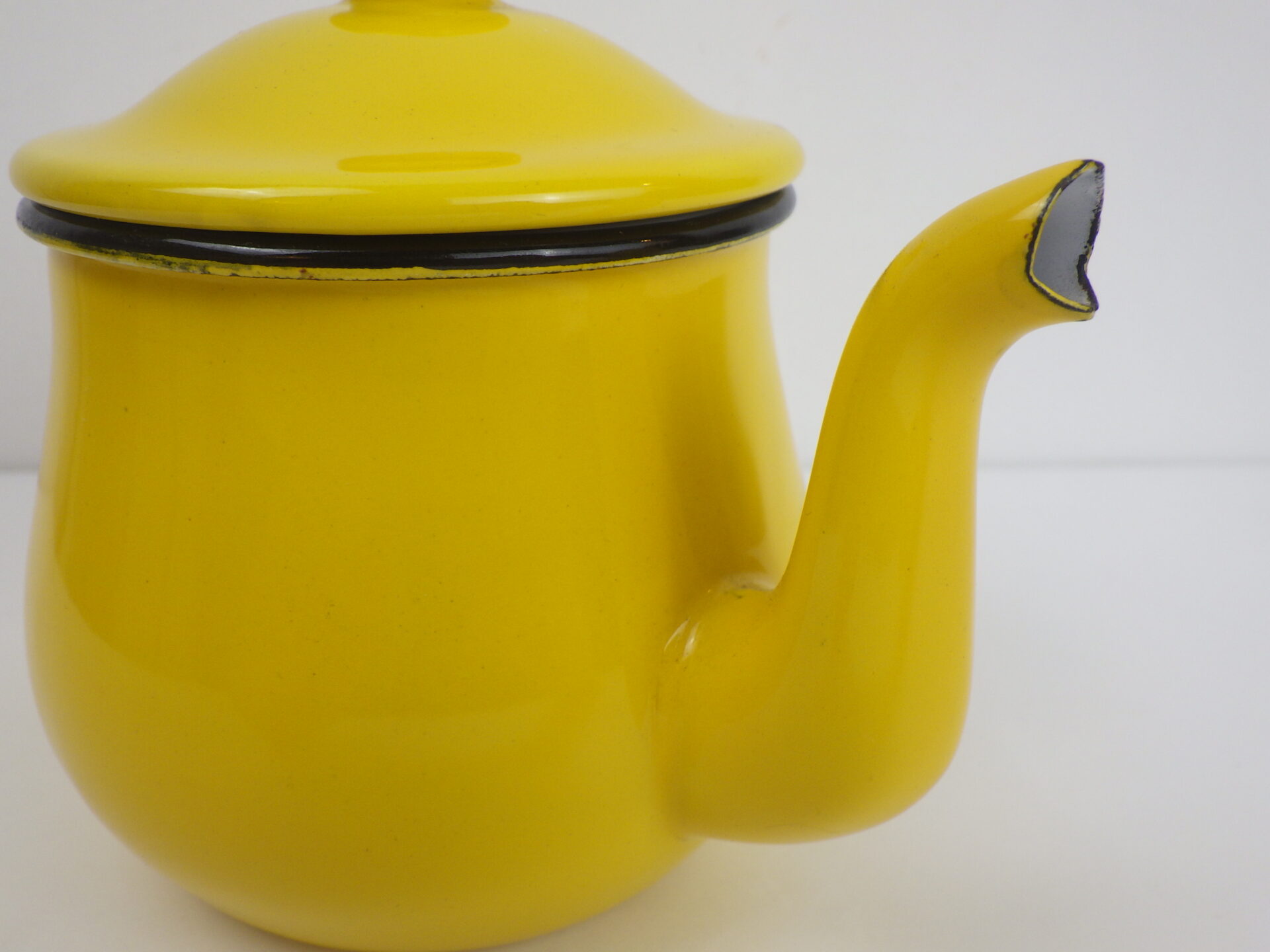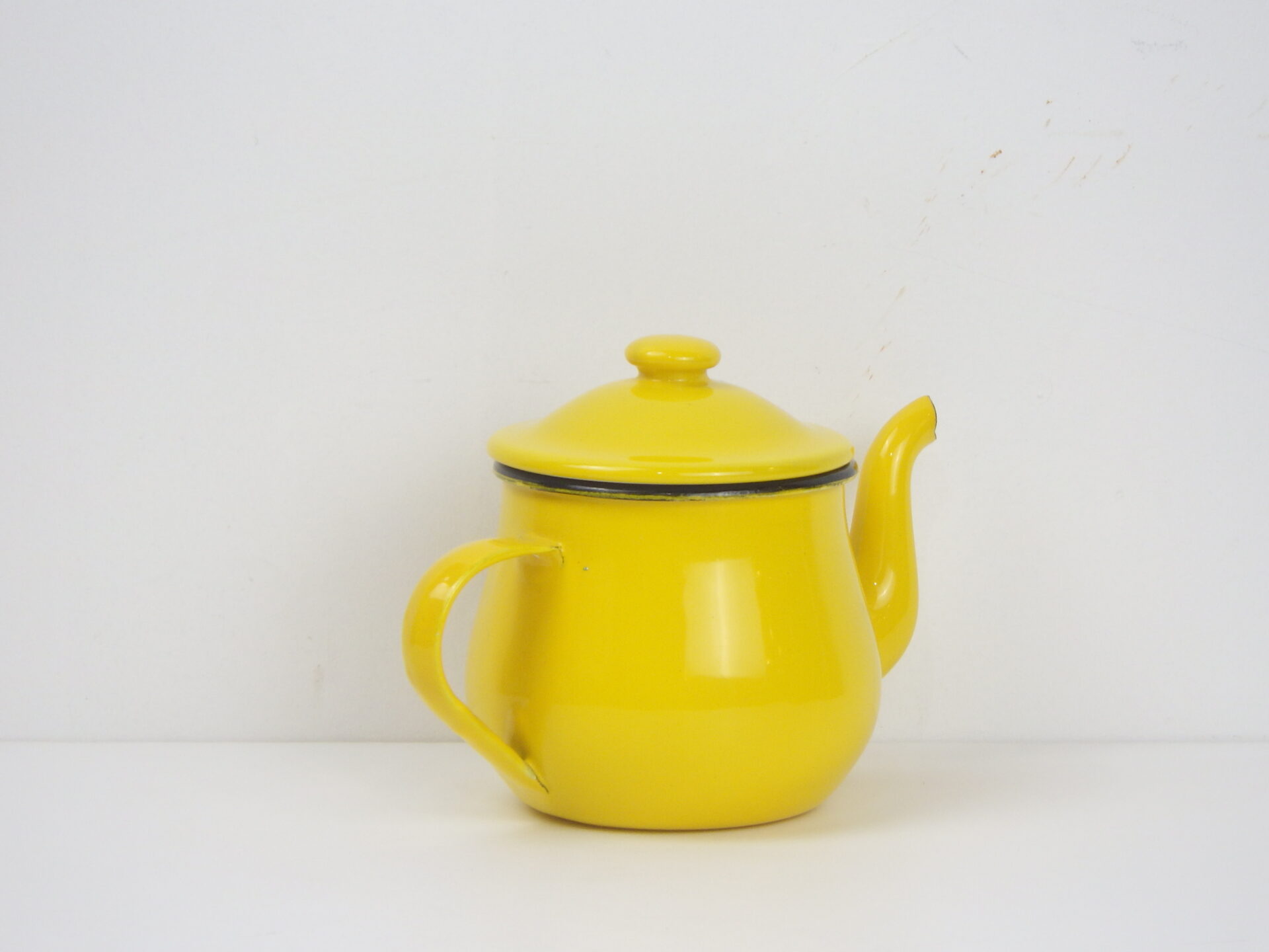 | アメリカで買い付けました。 ビンテージのエナメルティーポットです。 手のひらサイズの小ささと、発色の良いイエロー×ブラックのツートンカラーが可愛いですね。 昼下がりのティータイムに一人分の紅茶を沸かすのに良いサイズ感です。 ソロキャンプでも重宝しそう。 蓋をはずしてお花を生けてみたり、ディフューザースティックをさしてインテリアのアクセントにしてみても面白いかもしれません。 |