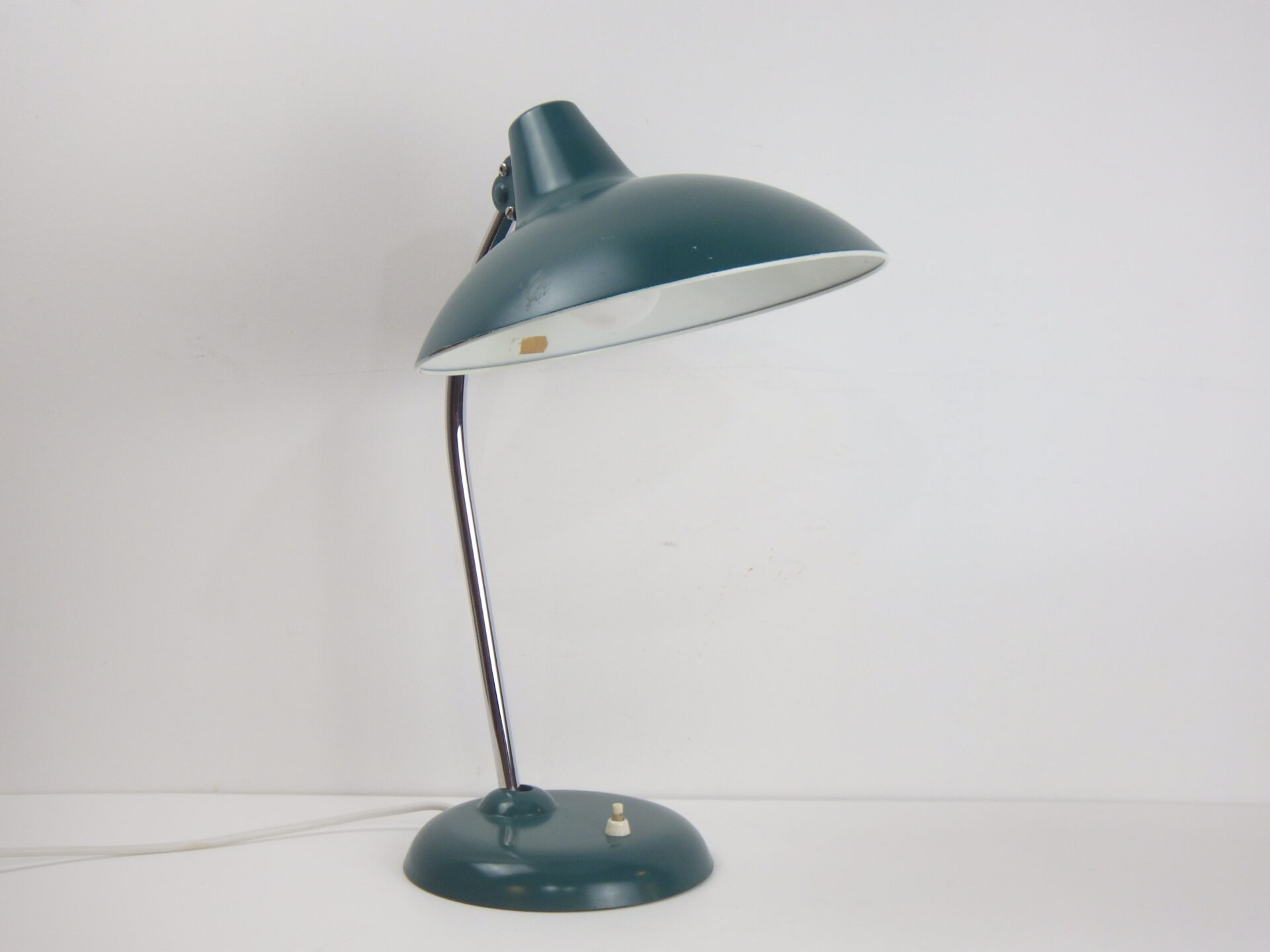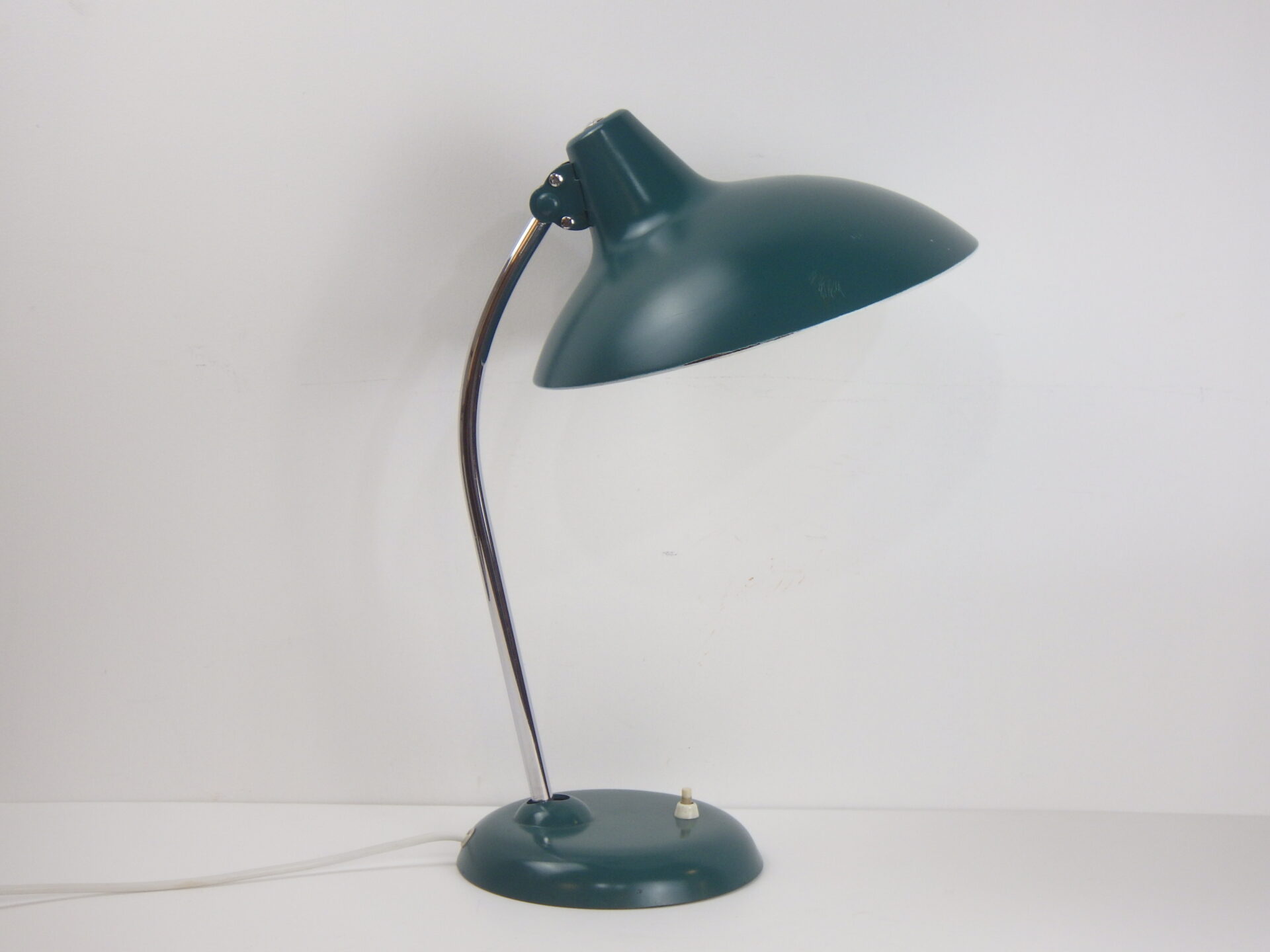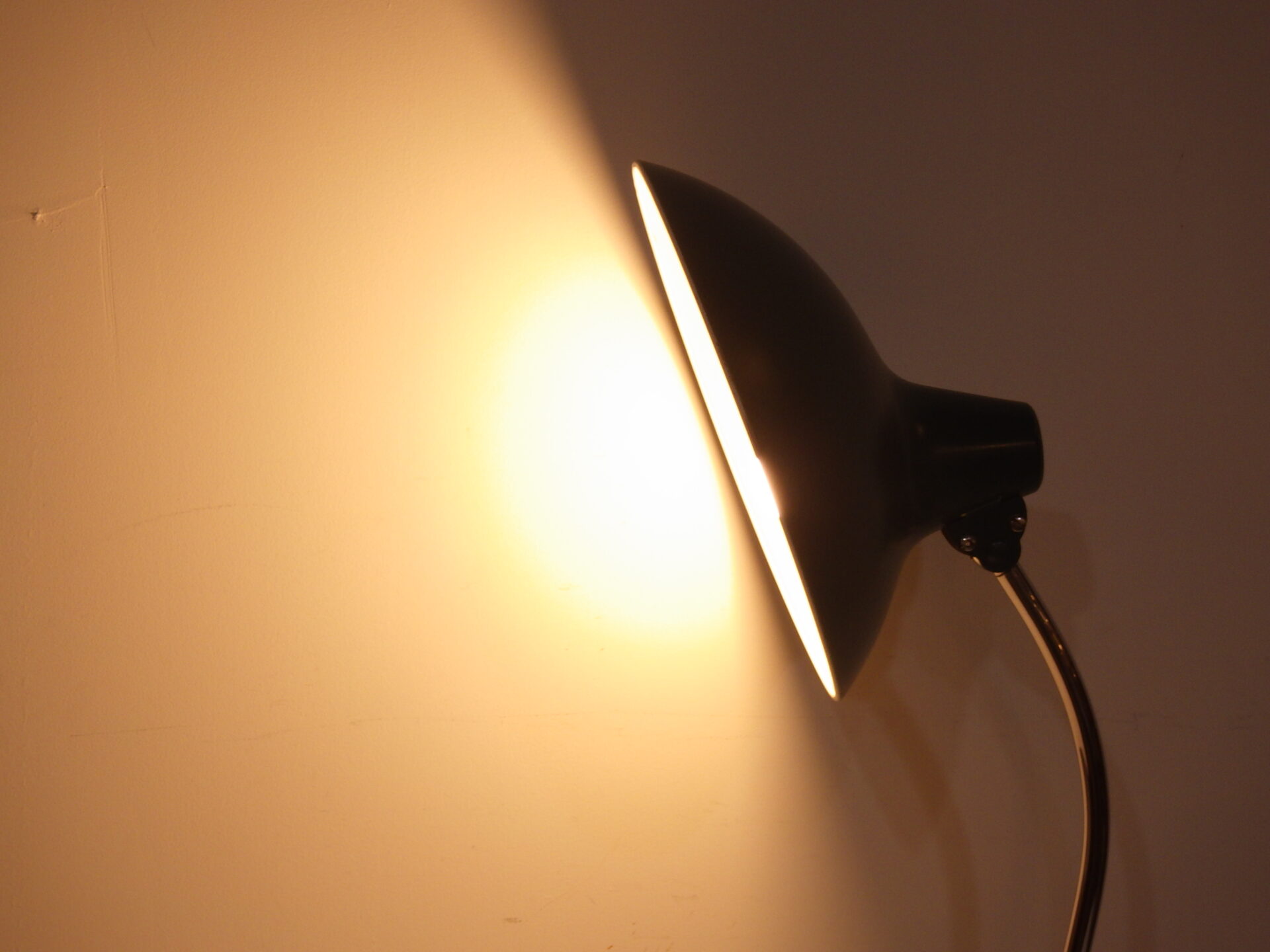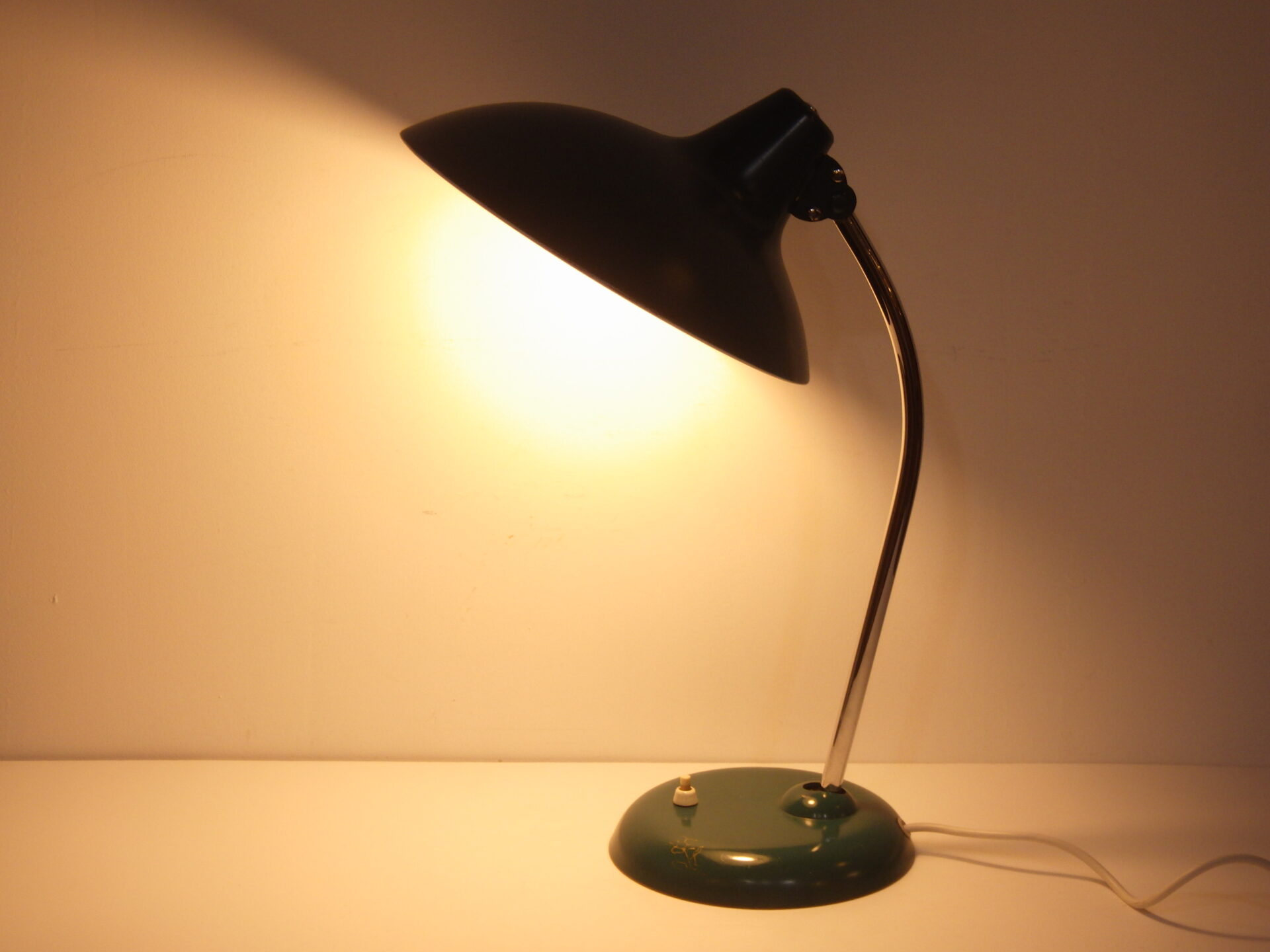 | ヨーロッパで買い付けました。 こちらは「Kaiser Leuchten」のモデル6786、デザイナーはChristian Dellです。 こちらはBuhausのアイコンであるモデル6556の後継アイテムとして作られたようです。 土台部分とシェードの付け根部分のボールがそれぞれ稼働するので、二か所で角度を変えることが出来ます。 サテングリーンのボディにクロームメッキのネックのコントラストと、幾何学的なフォルムが大変印象的で美しいデザインとなっています。 お部屋や店舗のインテリアのアクセントにおすすめしています。 土台部分のスイッチでON/OFFが切り替えられます。 (電球の口金サイズ:E26 LED対応) |