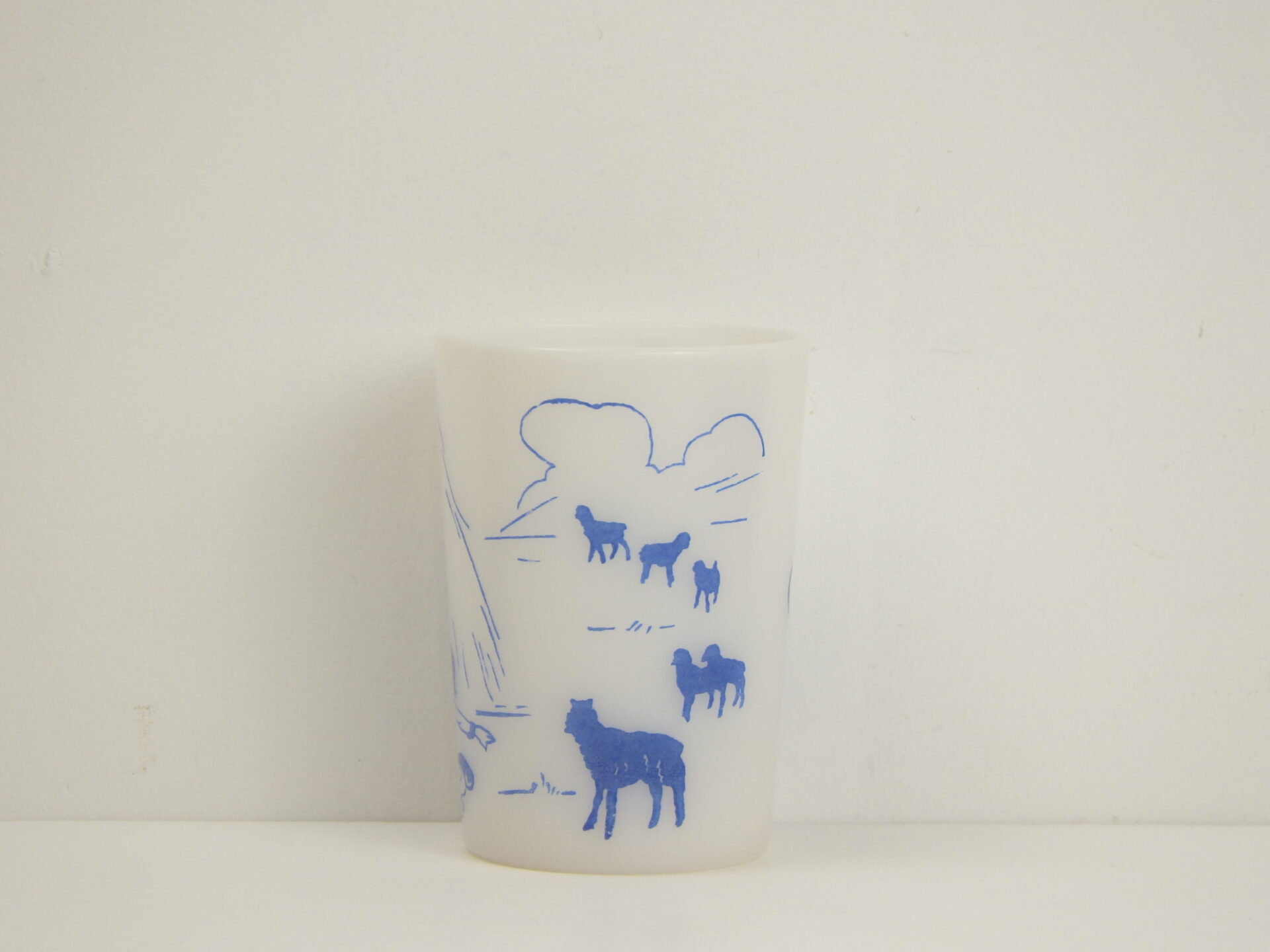 | アメリカで買い付けました。 マザーグースの「リトル・ボーイ・ブルー」がモチーフとなっているチャイルドタンブラーです。 泣き虫な羊飼いの男の子が干し草の山の下で眠っていますが、起こすと泣くに決まってるから起こさないよ!という内容の一場面がプリントされています。 チャイルドシリーズはその名の通り、当時お子様の為に製造されていました。 現在コンディション良く残っているものは、希少価値の高いコレクターズアイテムとなっています。 |