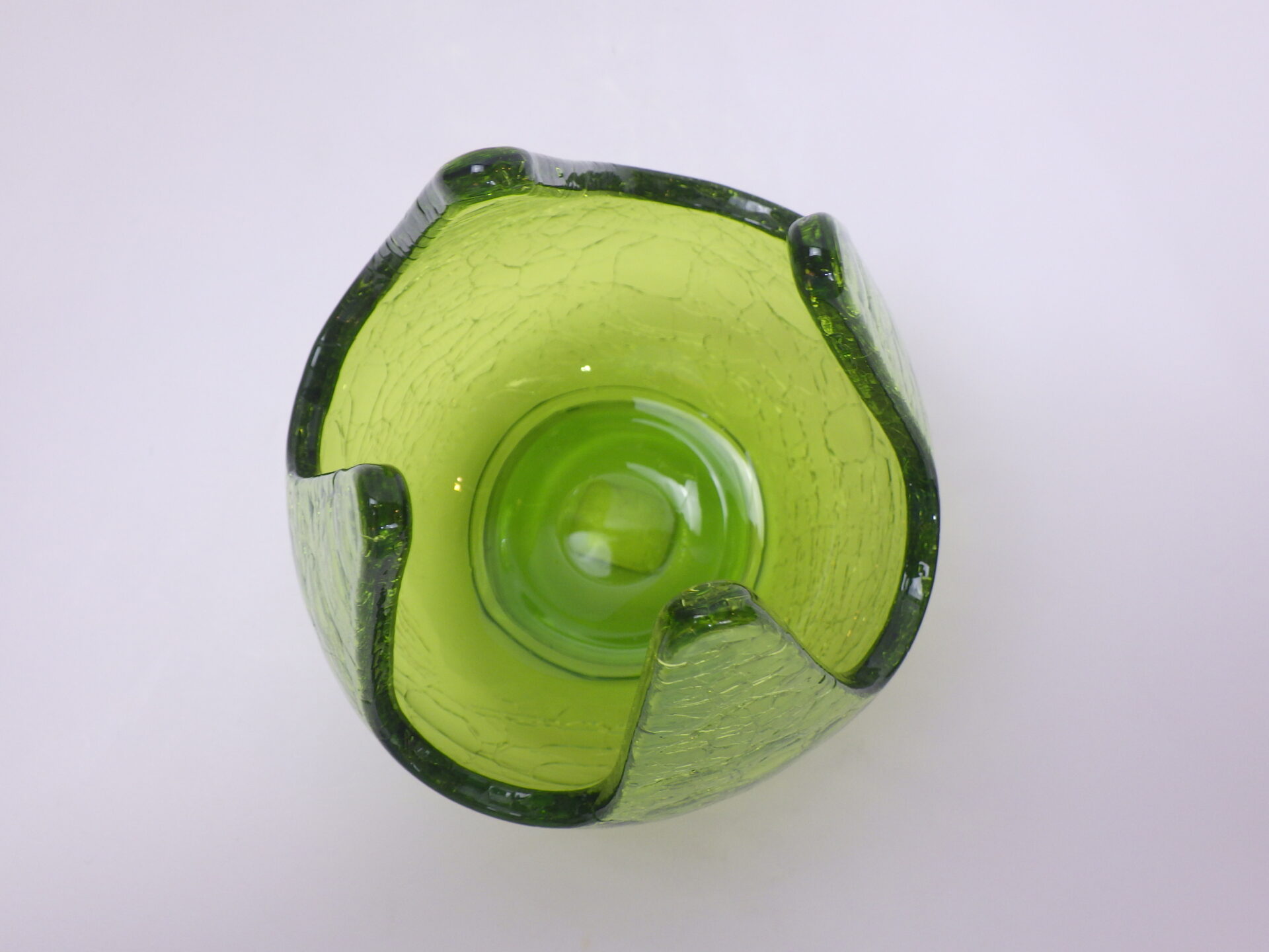| アメリカで買い付けました。 ガラスメーカー「バイキング社」のフラワーベースです。 表面は貫入が施されており、光が入ると大変綺麗に輝きます。 チューリップのような可愛らしいフォルムですが、落ち着いたグリーンが大人な印象を与えてくれますね。 インテリアのアクセントとしておすすめしています。 |