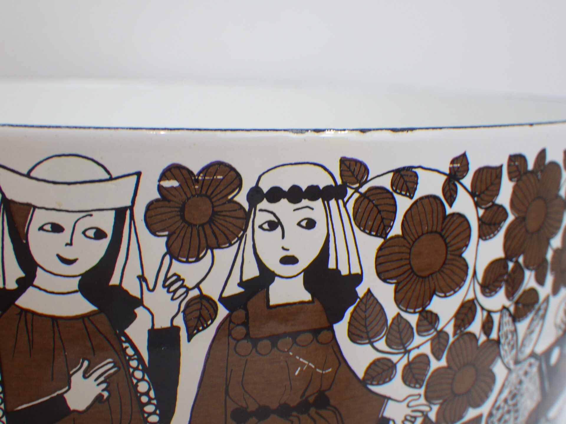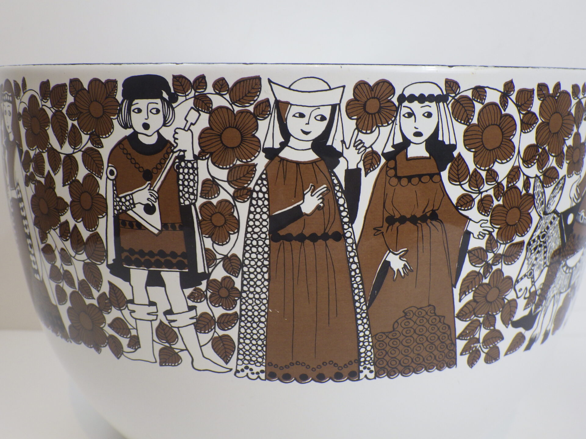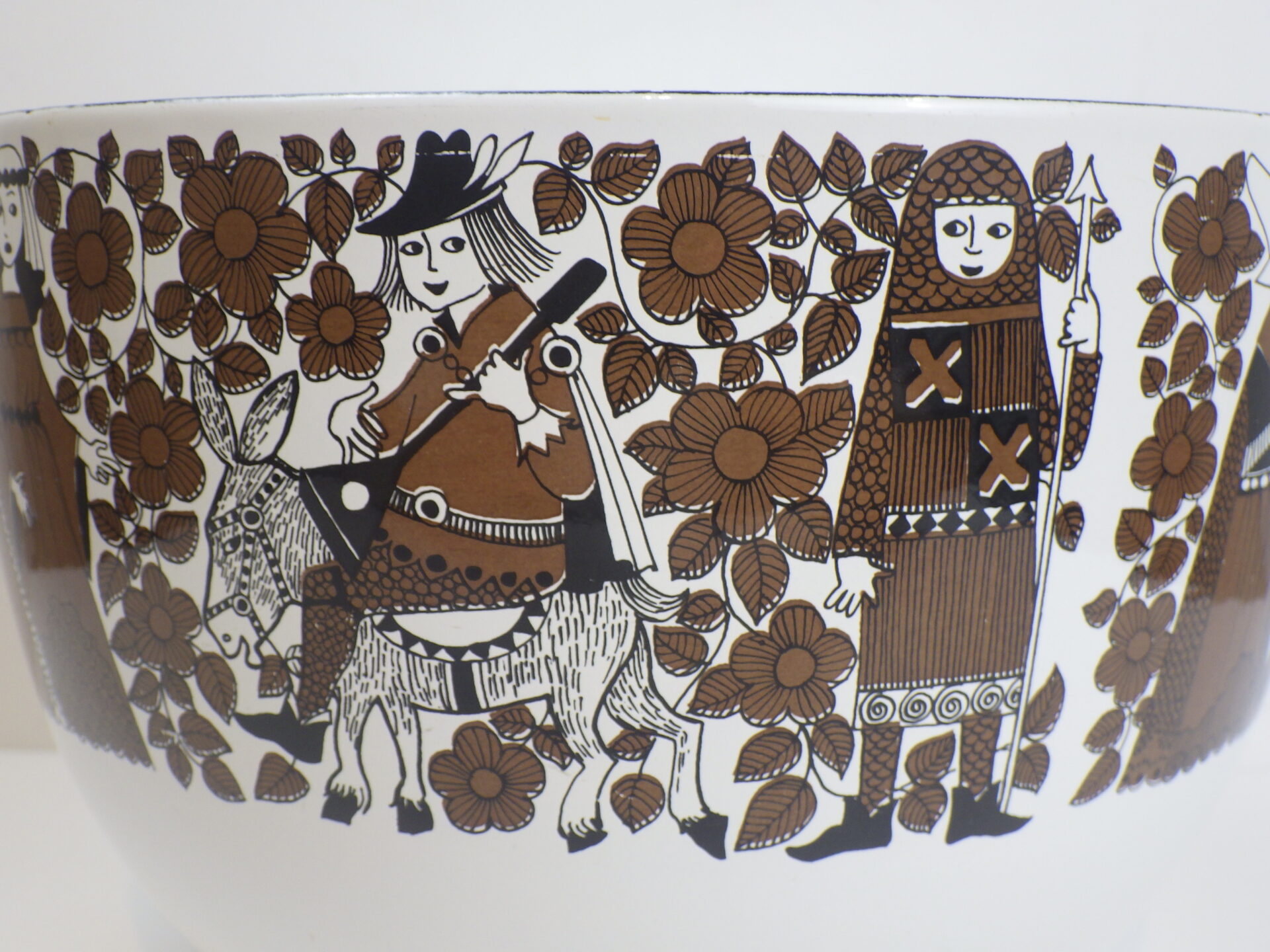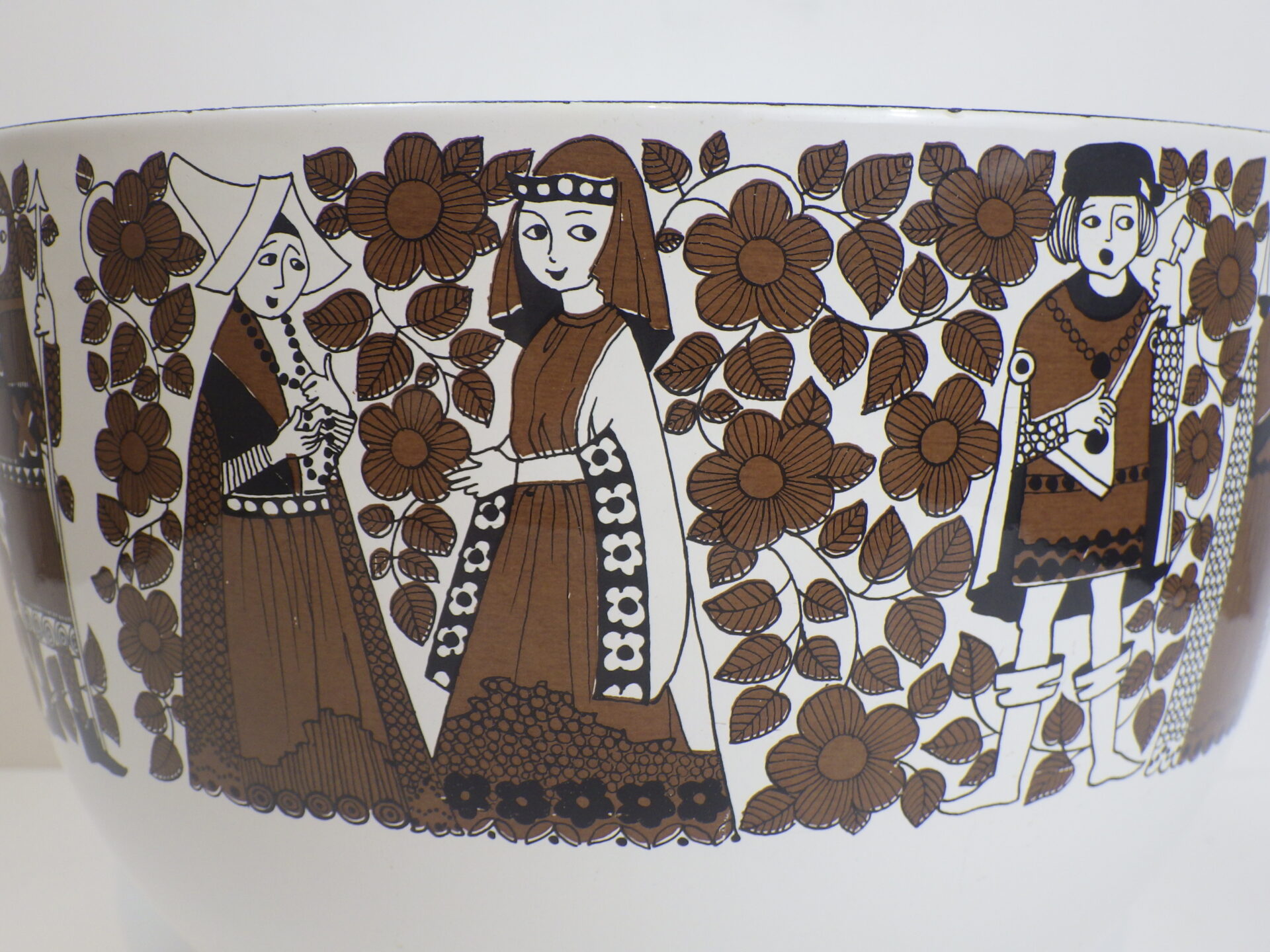 | フィンランドのFINEL/ARABIAのRitariのエナメルボウルです。 「Ritari」はフィンランド語で「騎士・騎士物語」と言う意味。 その名の通り中世の騎士や女性、吟遊詩人、花などがデザインされています。 フォルムはKaj Franck、デコレートデザインは「Raija Uosikkinen」が手掛けています。 大振りのボウルなので、お菓子作りやお料理の際にミキシングボウルとして活躍してくれそうです。 可愛いらしいフォルムとデザインなので、キッチンに飾るコレクターも多く、「使って」「見て」楽しめるアイテムですね。 |