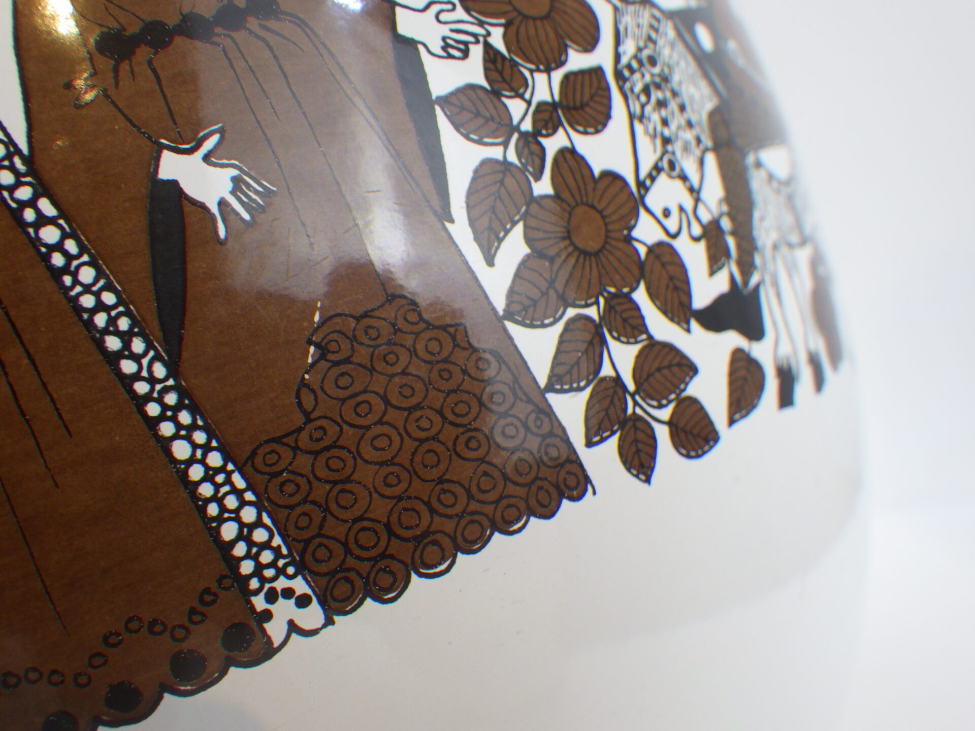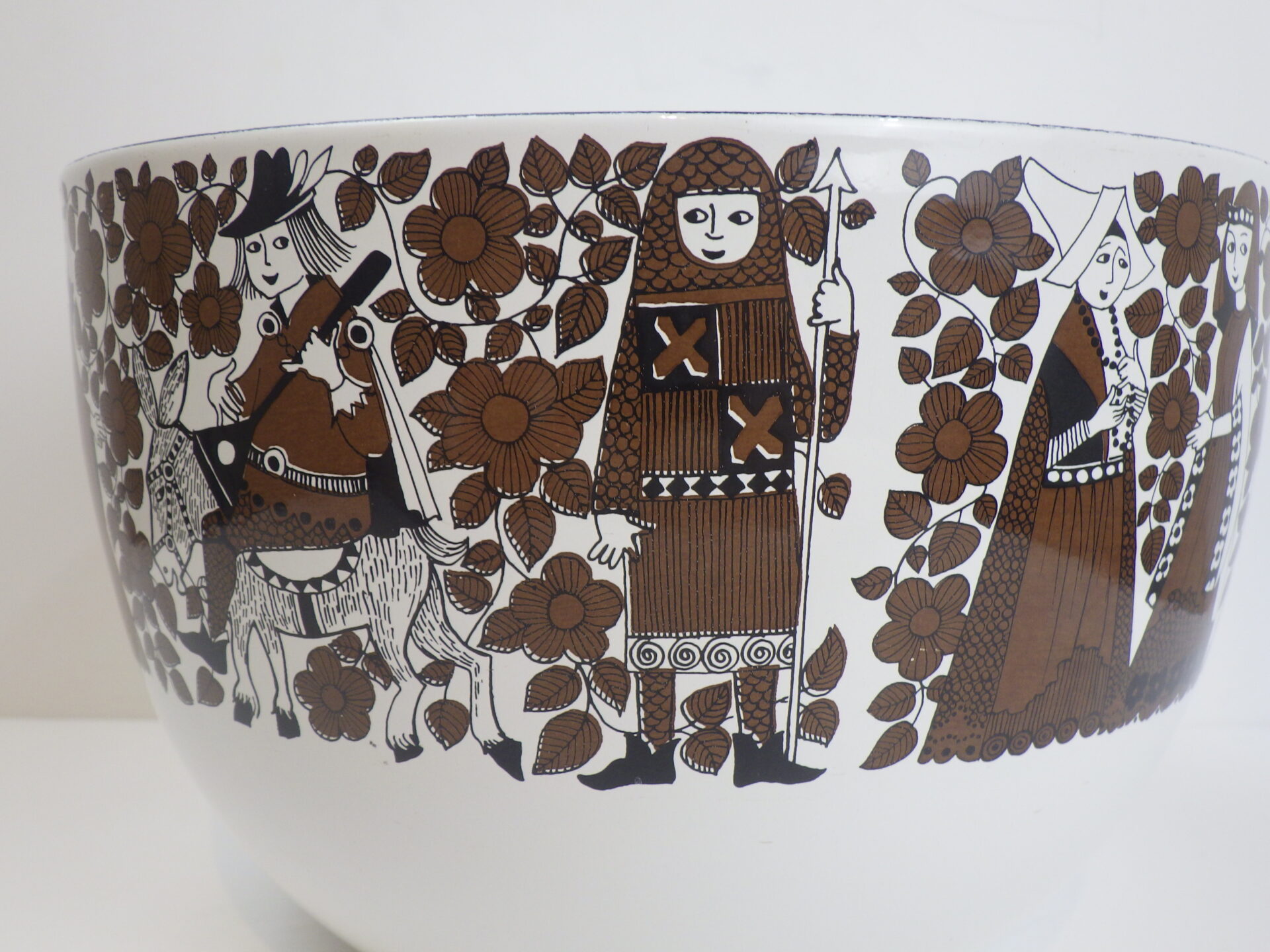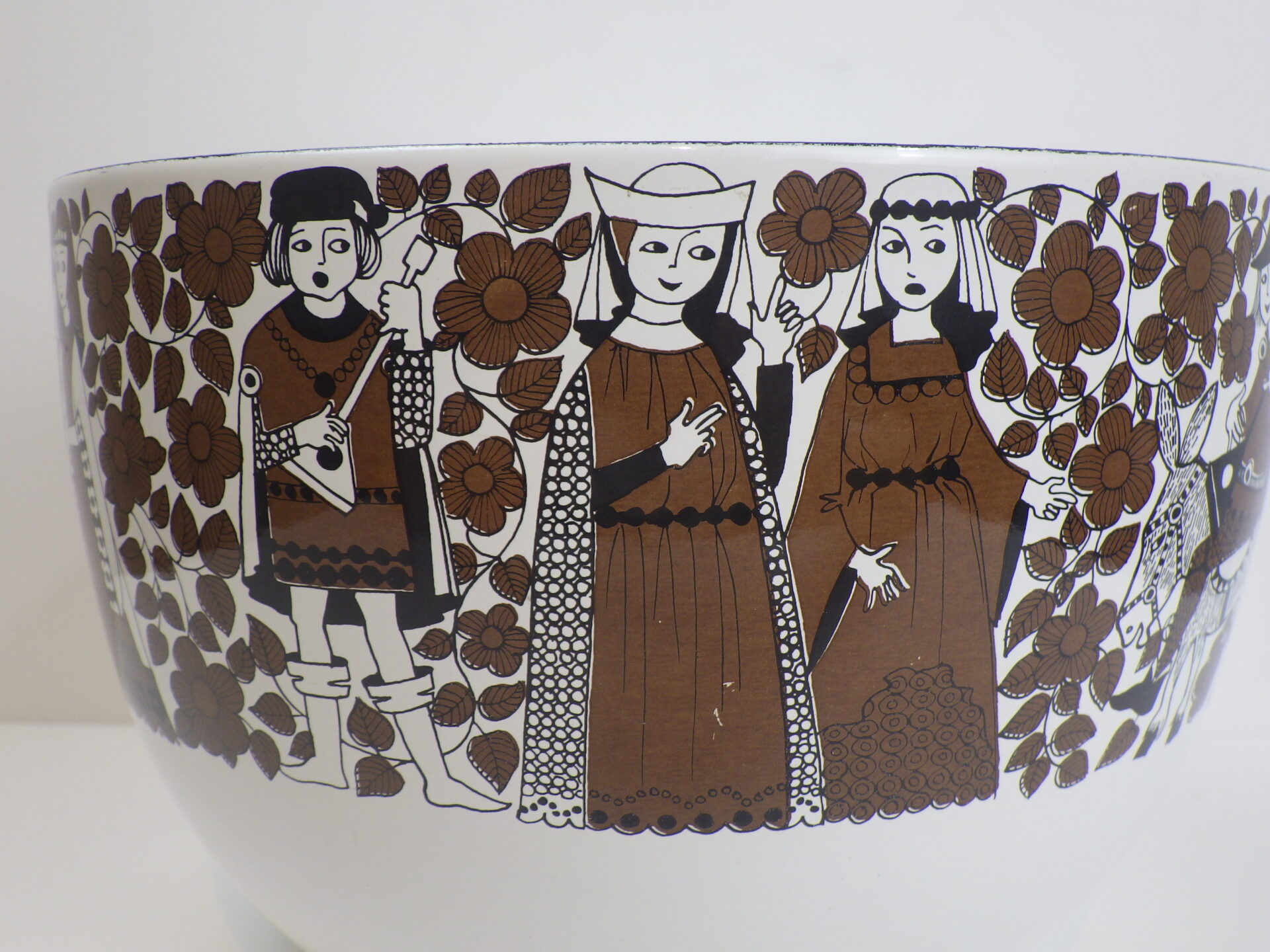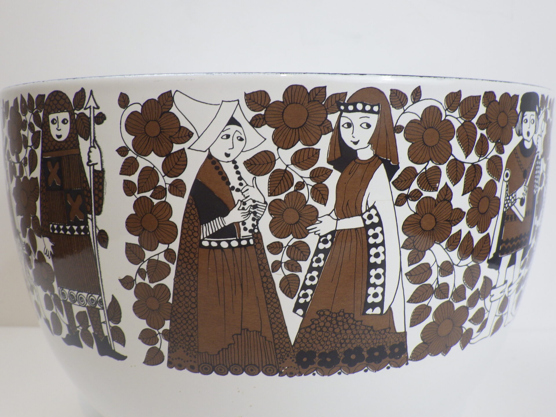 | フィンランドのFINEL/ARABIAのRitariのエナメルボウルです。 「Ritari」はフィンランド語で「騎士・騎士物語」と言う意味。 その名の通り中世の騎士や女性、吟遊詩人、花などがデザインされています。 フォルムはKaj Franck、デコレートデザインは「Raija Uosikkinen」が手掛けています。 大振りのボウルなので、お菓子作りやお料理の際にミキシングボウルとして活躍してくれそうです。 可愛いらしいフォルムとデザインなので、キッチンに飾るコレクターも多く、「使って」「見て」楽しめるアイテムですね。 |