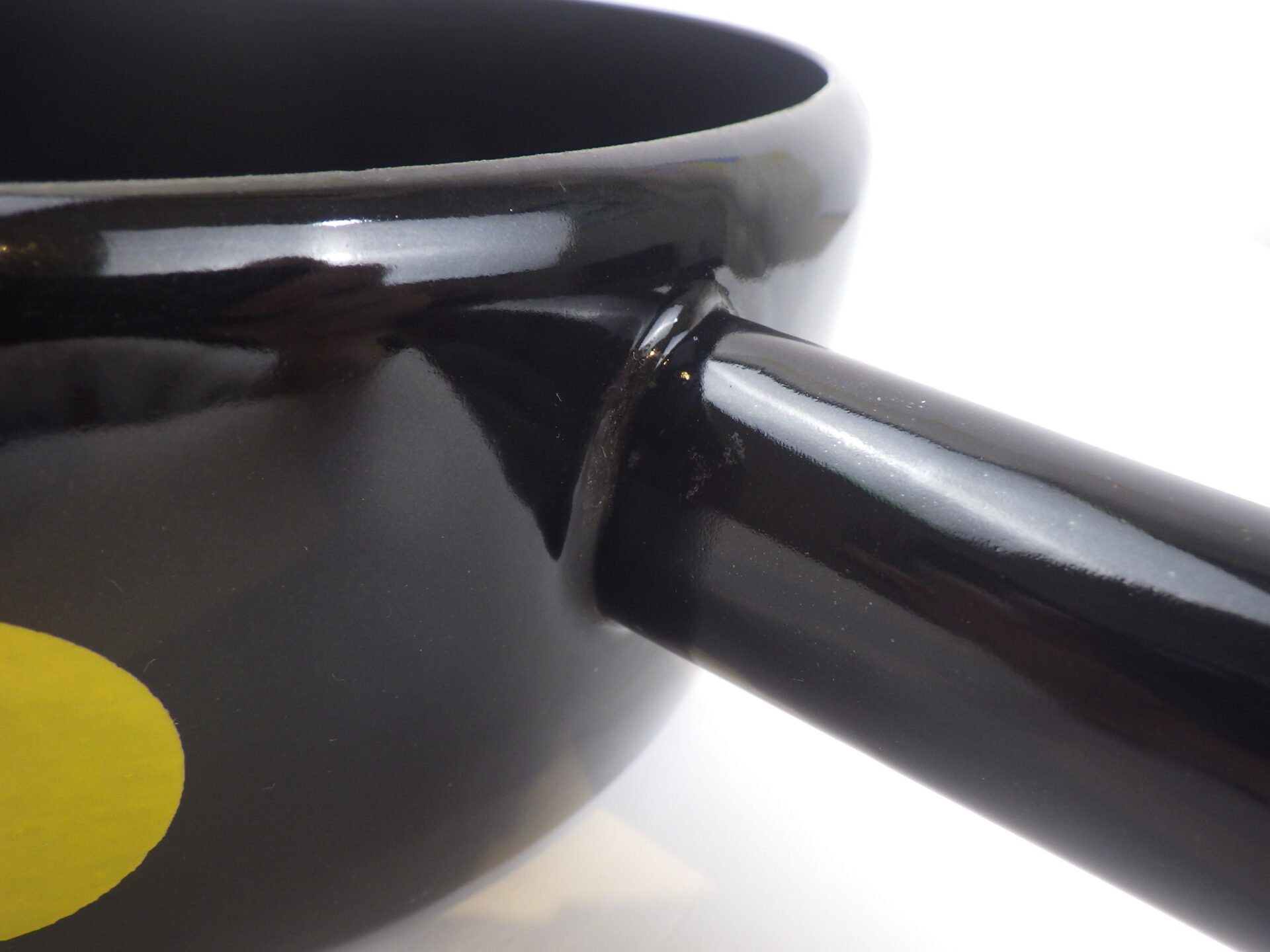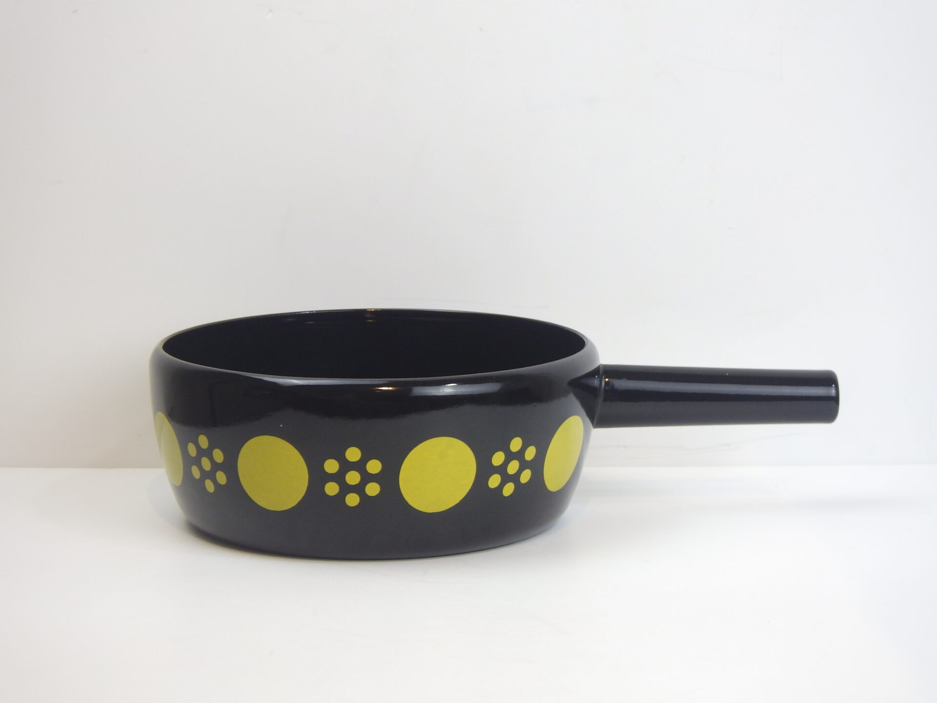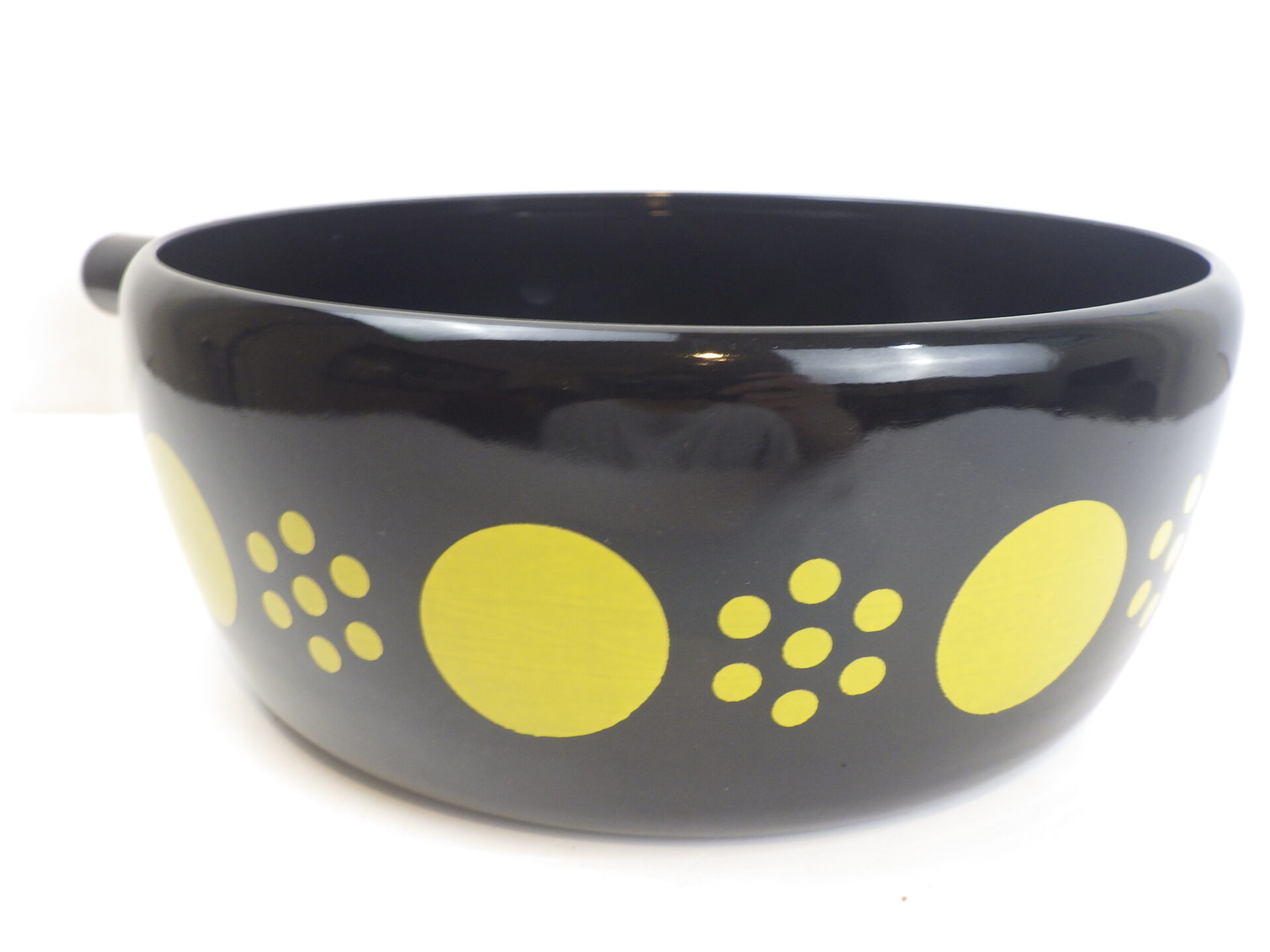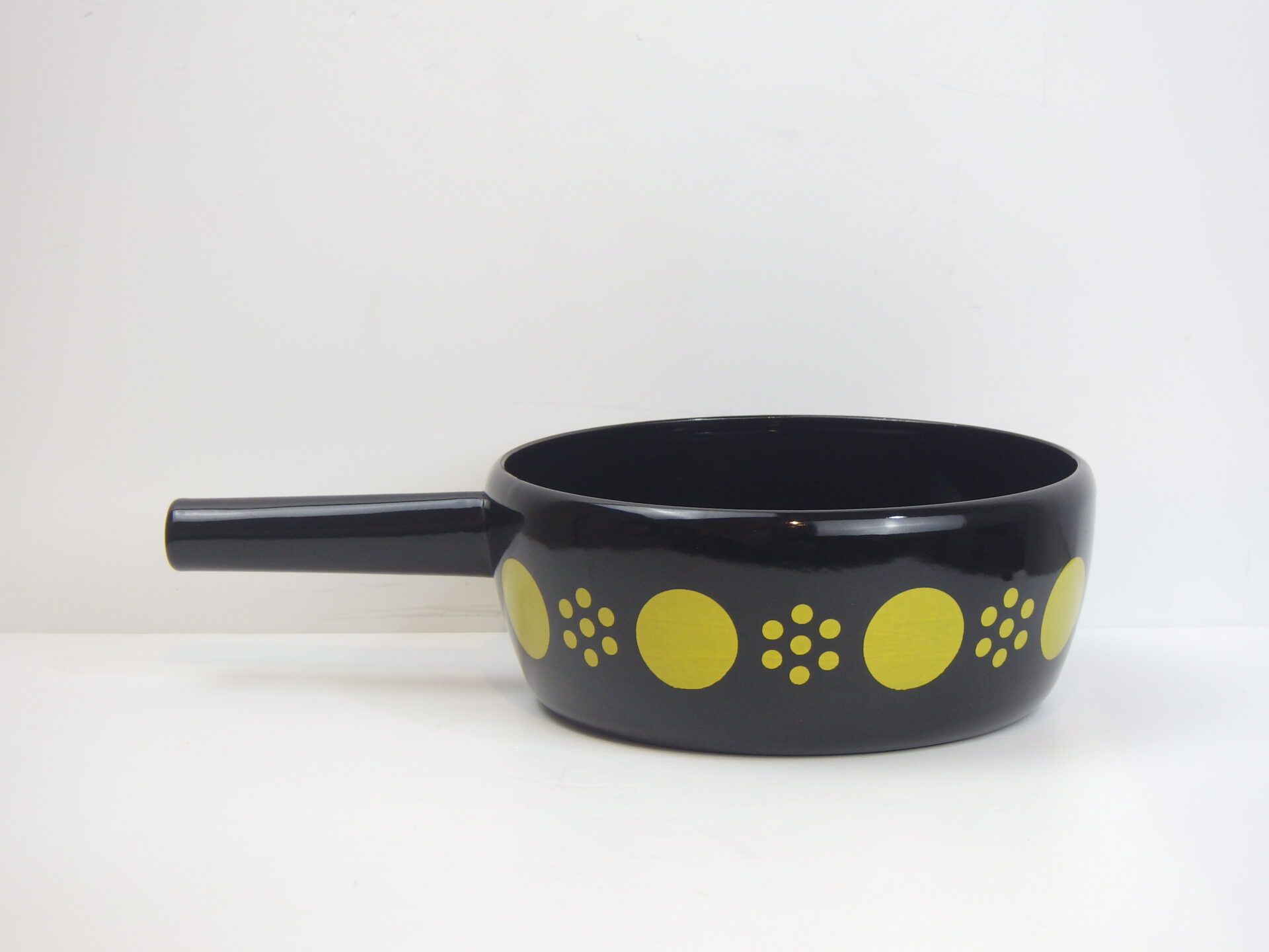 | ブラックベースにイエローの可愛いドットプリントのエナメルソース鍋です。 スウェーデン製です。 元々はウォームスタンドが付属していたようです。 普段使いの他、キャンプなどアウトドアに持ち出すのにも良いサイズです。 ぐるりと一周プリントされているので、どこから見ても可愛いのが良いですね。 |