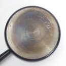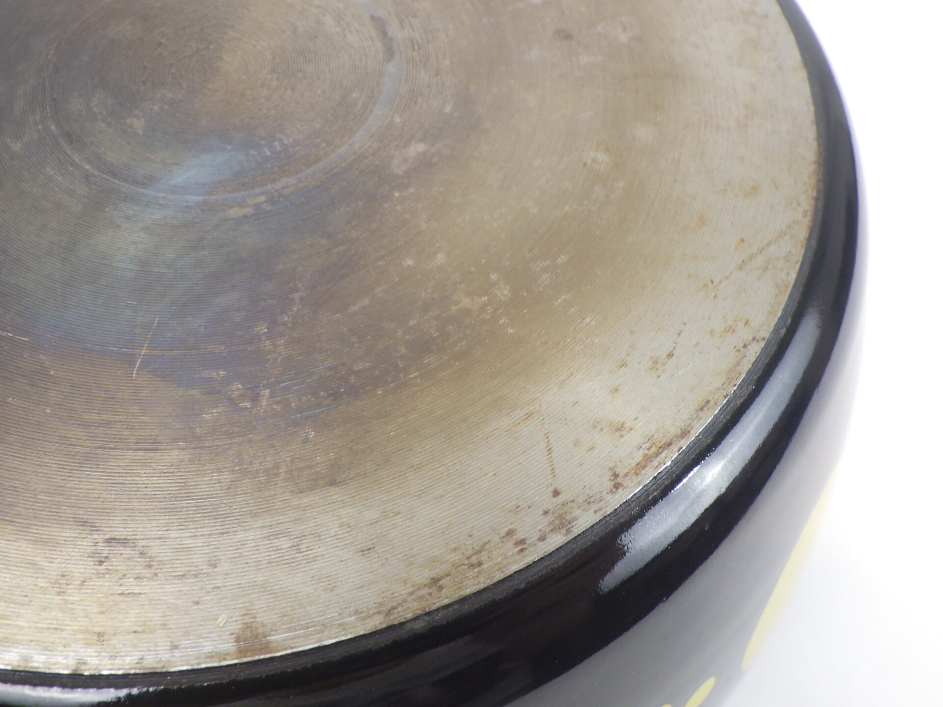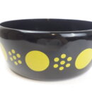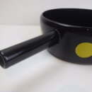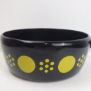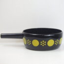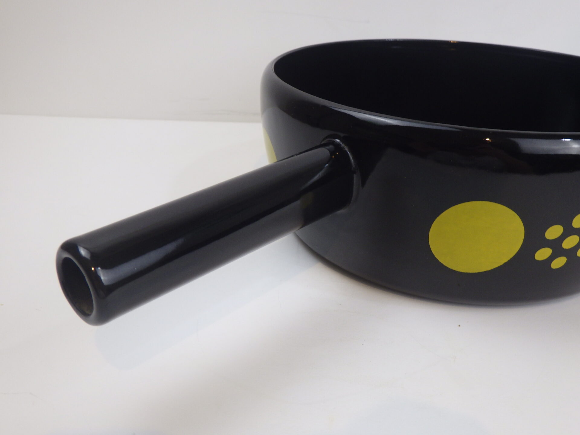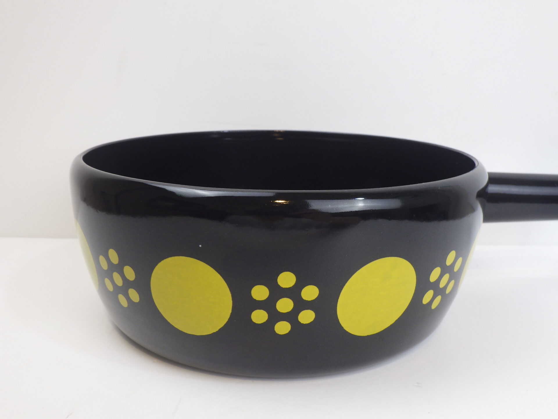 | ブラックベースにイエローの可愛いドットプリントのエナメルソース鍋です。 スウェーデン製です。 元々はウォームスタンドが付属していたようです。 普段使いの他、キャンプなどアウトドアに持ち出すのにも良いサイズです。 ぐるりと一周プリントされているので、どこから見ても可愛いのが良いですね。 |