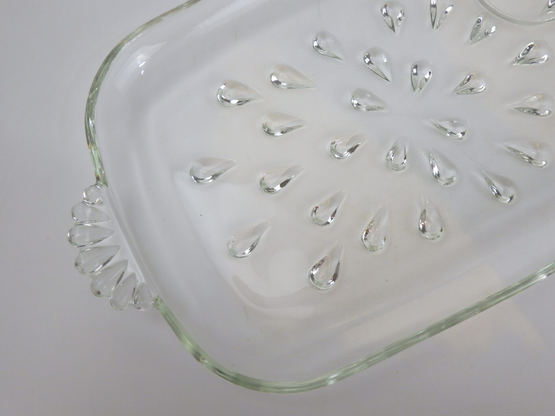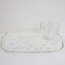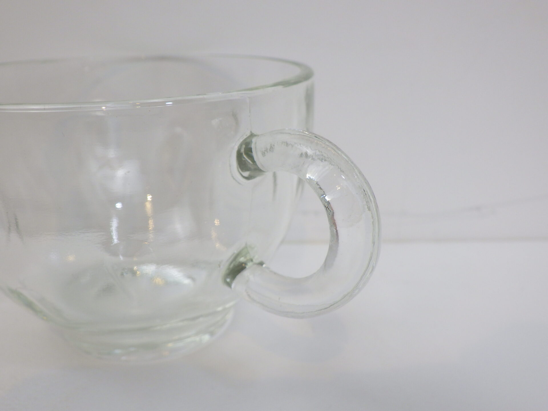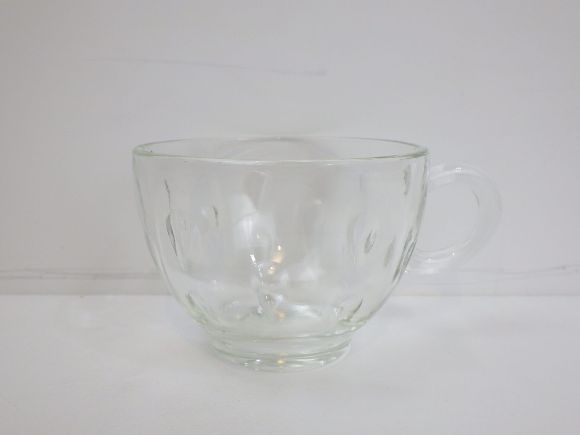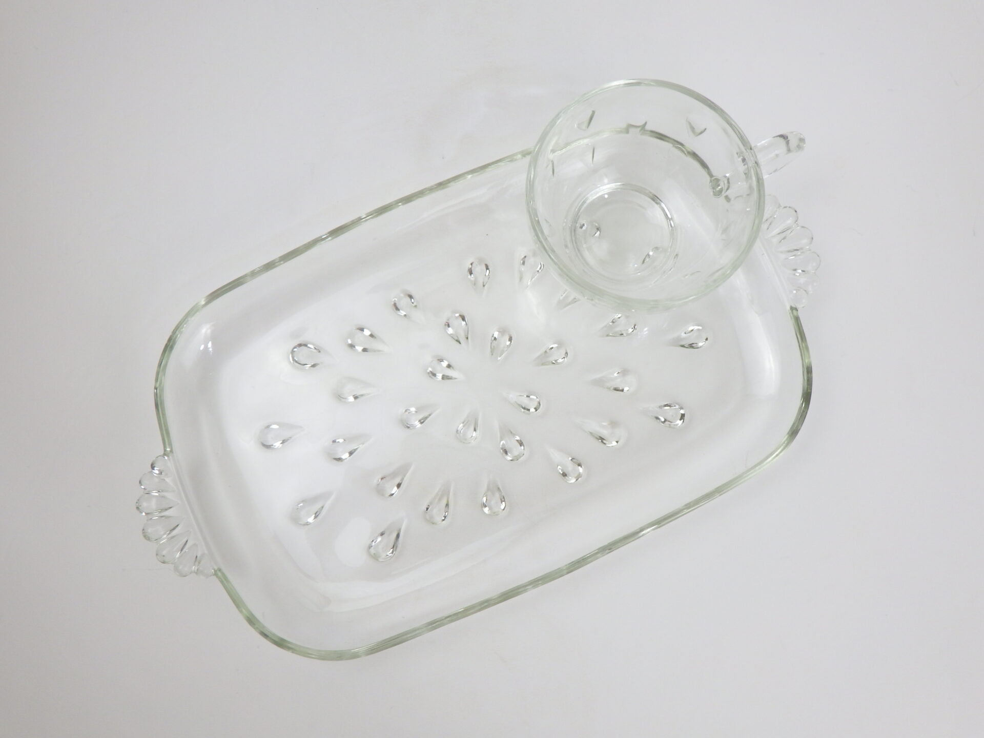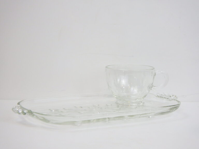 | ヘーゼルアトラス社のティアドロップ、スナックセットです。 ヘーゼルアトラスと言えばカラフルで可愛らしいプリントのミルクガラスを思い浮かべる方も多いかと思いますが、このようなクリアガラスのアイテムも沢山製造していました。 こちらはその名の通り、涙のしずくの形をしたエンボスが、カップ、プレートそれぞれに施されています。 サンドイッチなどの軽食の他、素麺などを盛り付けたり、ケーキとハーブティーでティータイムなんてのも良さそう。 プレートの両サイドに持ち手もついているので、テーブルに運ぶときに便利です。 日本ではあまり馴染みのないスナックセットですが、アレンジがきくので様々な場面で活躍してくれるアイテムです。 |