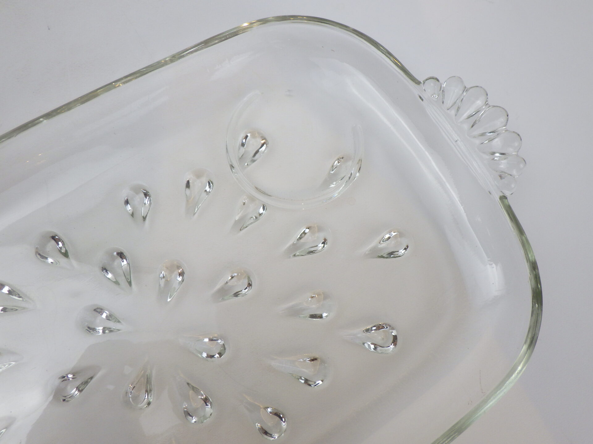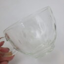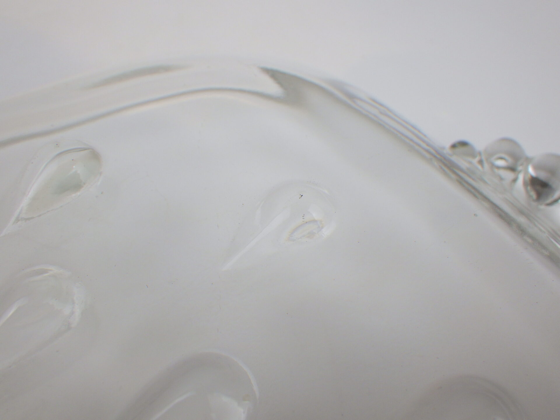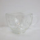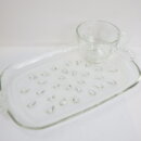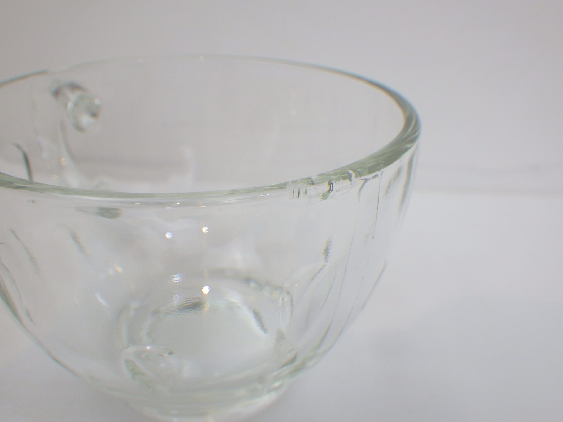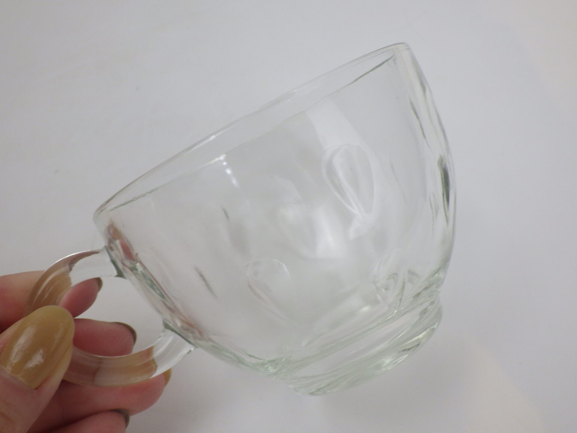 | ヘーゼルアトラス社のティアドロップ、スナックセットです。 ヘーゼルアトラスと言えばカラフルで可愛らしいプリントのミルクガラスを思い浮かべる方も多いかと思いますが、このようなクリアガラスのアイテムも沢山製造していました。 こちらはその名の通り、涙のしずくの形をしたエンボスが、カップ、プレートそれぞれに施されています。 サンドイッチなどの軽食の他、素麺などを盛り付けたり、ケーキとハーブティーでティータイムなんてのも良さそう。 プレートの両サイドに持ち手もついているので、テーブルに運ぶときに便利です。 日本ではあまり馴染みのないスナックセットですが、アレンジがきくので様々な場面で活躍してくれるアイテムです。 |
