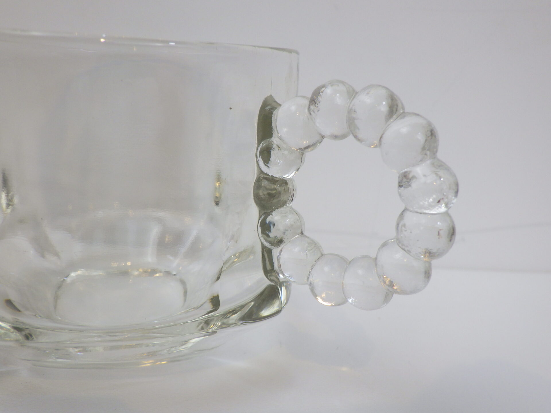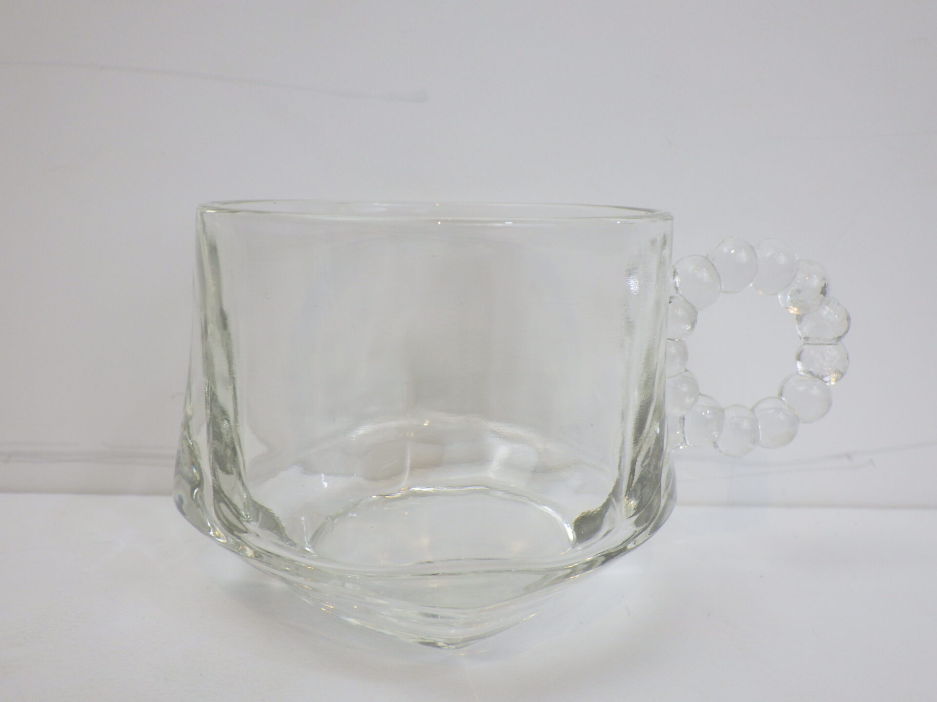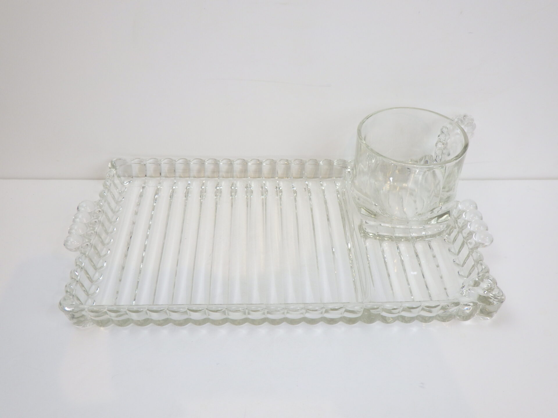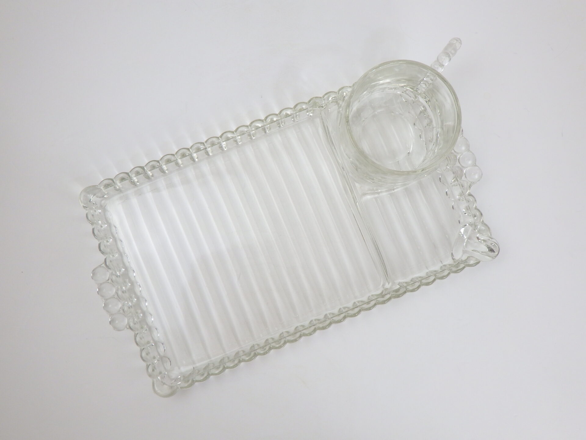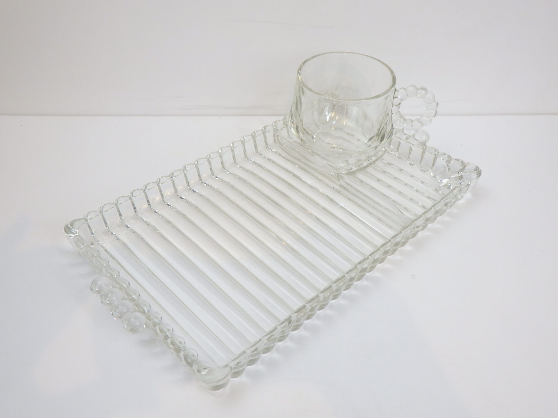 | ヘーゼルアトラス社のティアドロップ、スナックセットです。 ヘーゼルアトラスと言えばカラフルで可愛らしいプリントのミルクガラスを思い浮かべる方も多いかと思いますが、このようなクリアガラスのアイテムも沢山製造していました。 こちらは「3S」と呼ばれており、「Snack(スナック)」「Sip(飲む)」「Smoke(タバコ)」の略で、プレートの隅の四角く囲われている部分にタバコが置けるようになっている珍しいタイプです。(縁にタバコを引掛けられるくぼみもあります) お昼は軽食やスイーツを、夜はちょっとしたカクテルパーティーを楽しめる仕様となっているんですね。 カップも飲み口は丸いのですが、ボトム部分は四角い形状をしており、プレートのくぼみにぴったり収まるため、テーブルに運ぶ際にクルクル回らず安定します。 日本ではあまり馴染みのないスナックセットですが、アレンジがきくので様々な場面で活躍してくれるアイテムでおすすめしています。 |