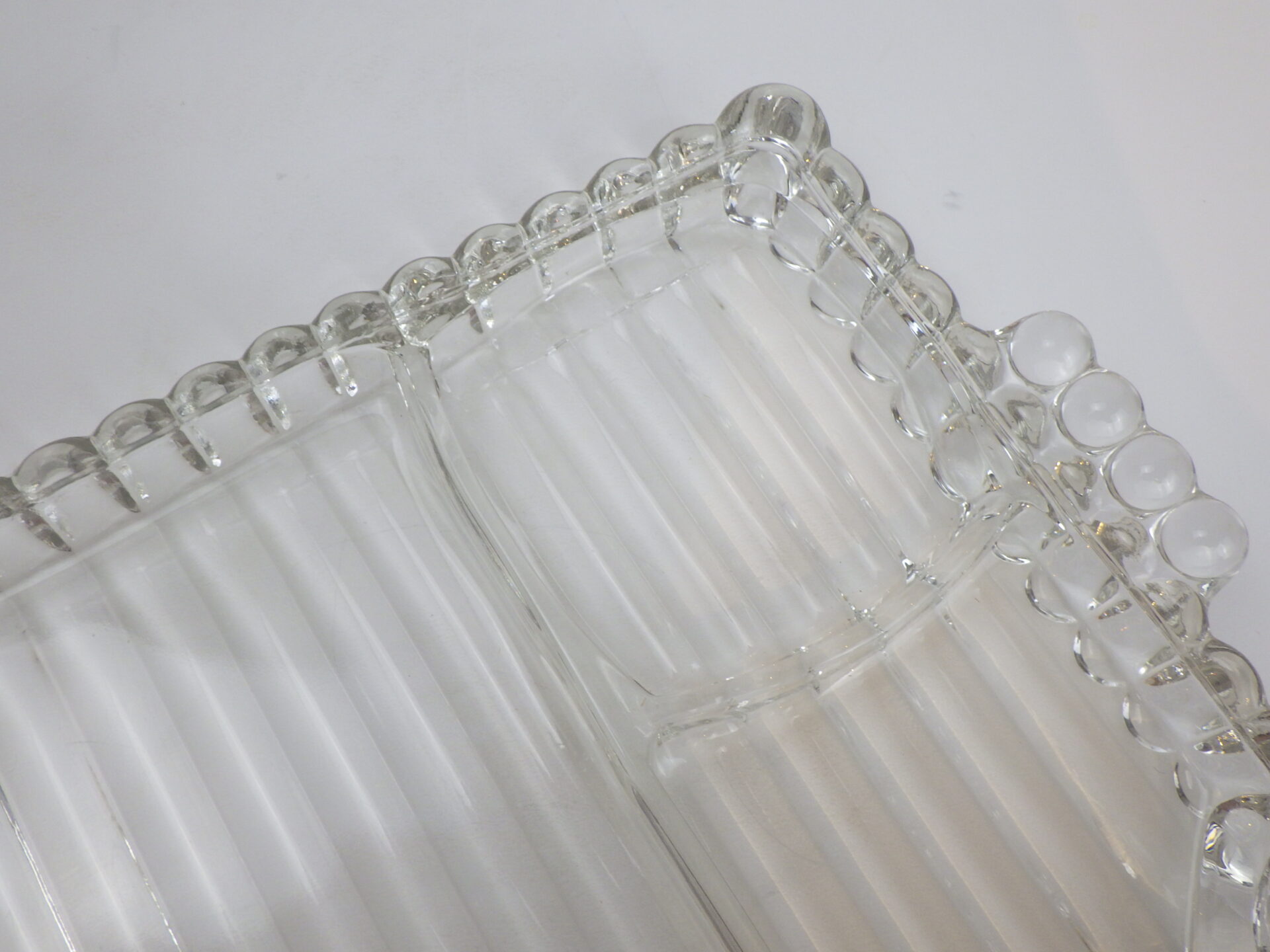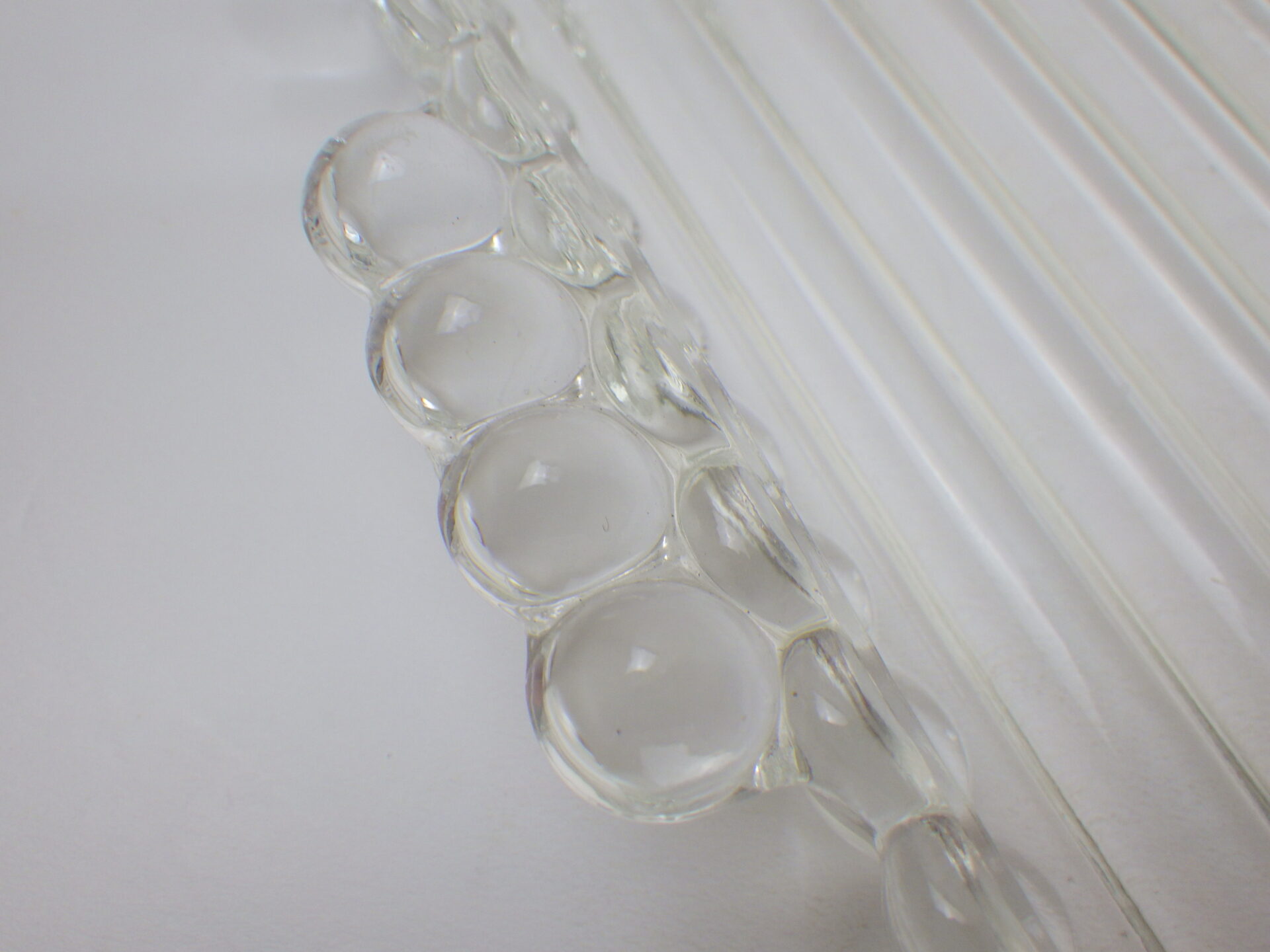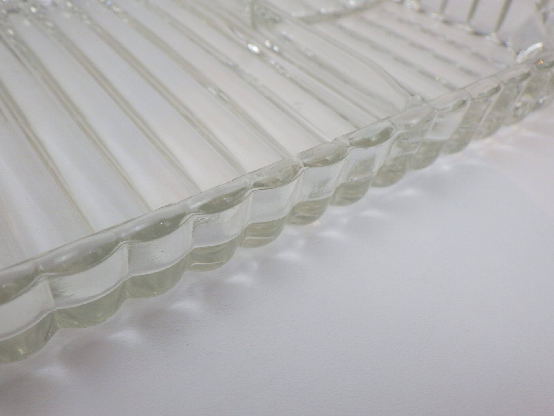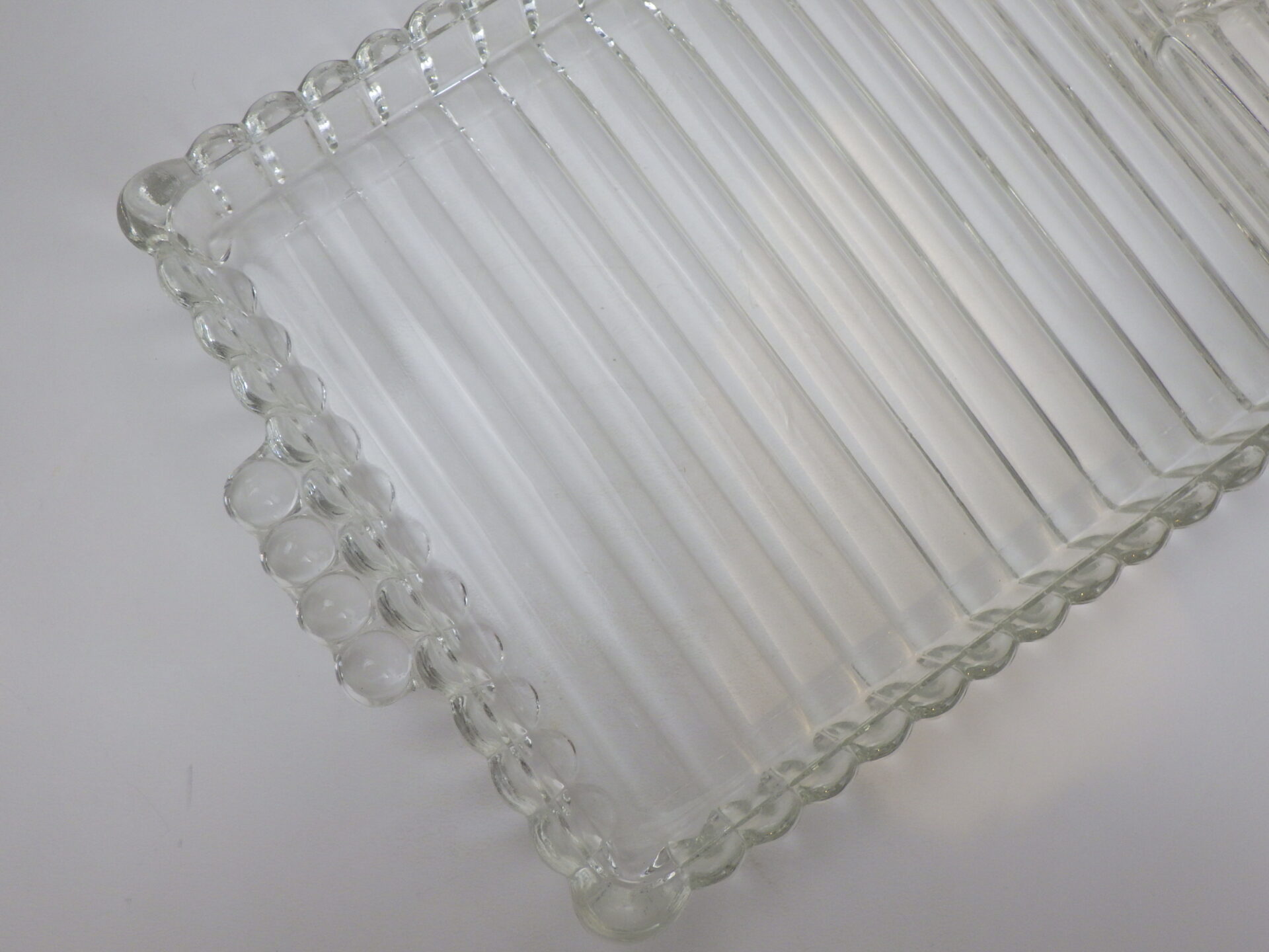 | ヘーゼルアトラス社のティアドロップ、スナックセットです。 ヘーゼルアトラスと言えばカラフルで可愛らしいプリントのミルクガラスを思い浮かべる方も多いかと思いますが、このようなクリアガラスのアイテムも沢山製造していました。 こちらは「3S」と呼ばれており、「Snack(スナック)」「Sip(飲む)」「Smoke(タバコ)」の略で、プレートの隅の四角く囲われている部分にタバコが置けるようになっている珍しいタイプです。(縁にタバコを引掛けられるくぼみもあります) お昼は軽食やスイーツを、夜はちょっとしたカクテルパーティーを楽しめる仕様となっているんですね。 カップも飲み口は丸いのですが、ボトム部分は四角い形状をしており、プレートのくぼみにぴったり収まるため、テーブルに運ぶ際にクルクル回らず安定します。 日本ではあまり馴染みのないスナックセットですが、アレンジがきくので様々な場面で活躍してくれるアイテムでおすすめしています。 |