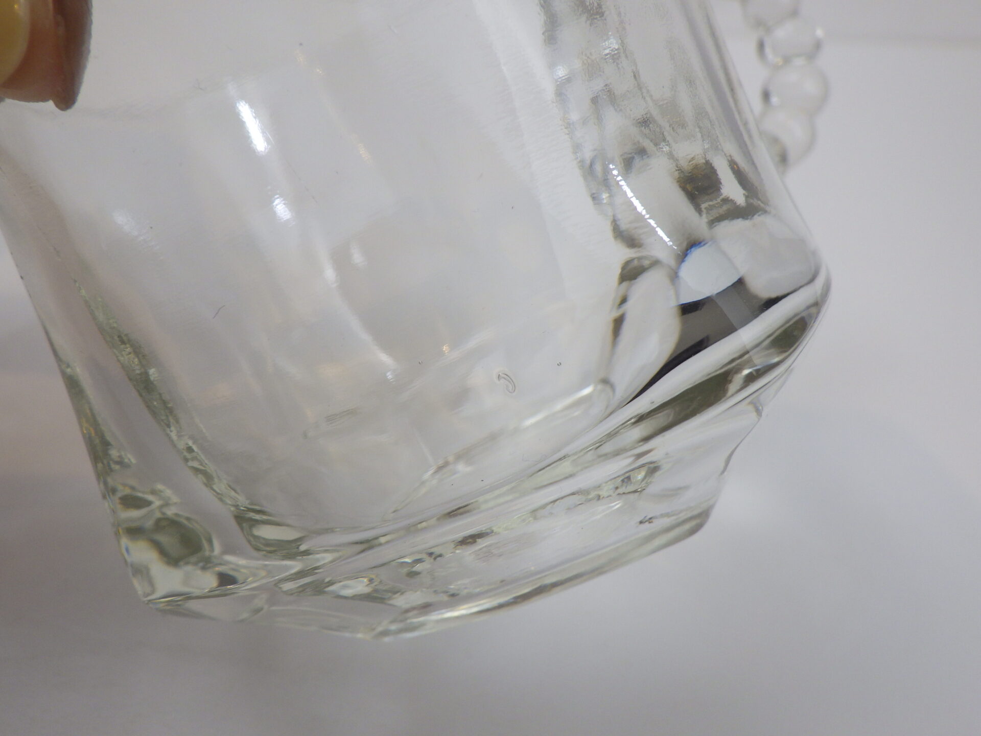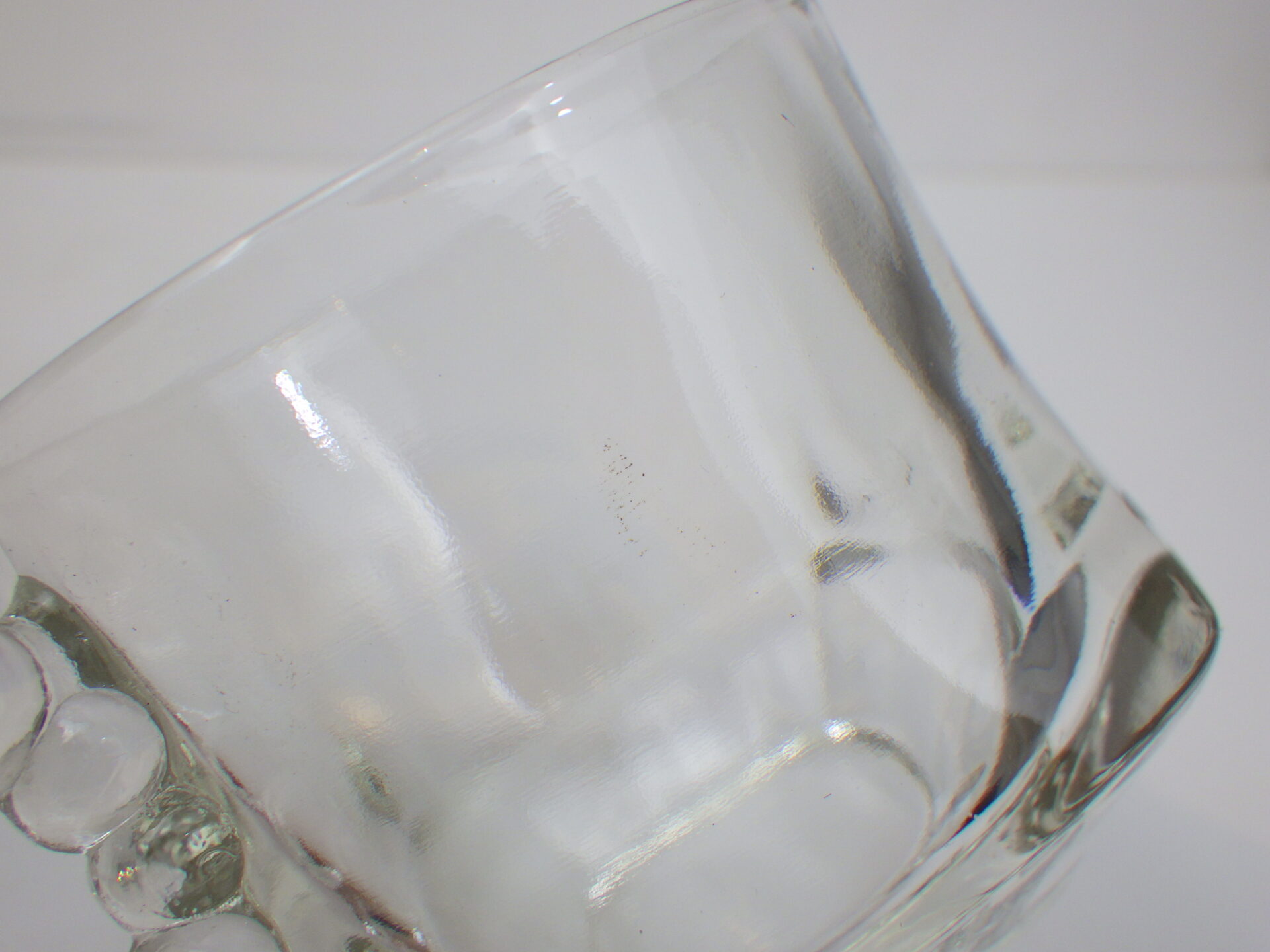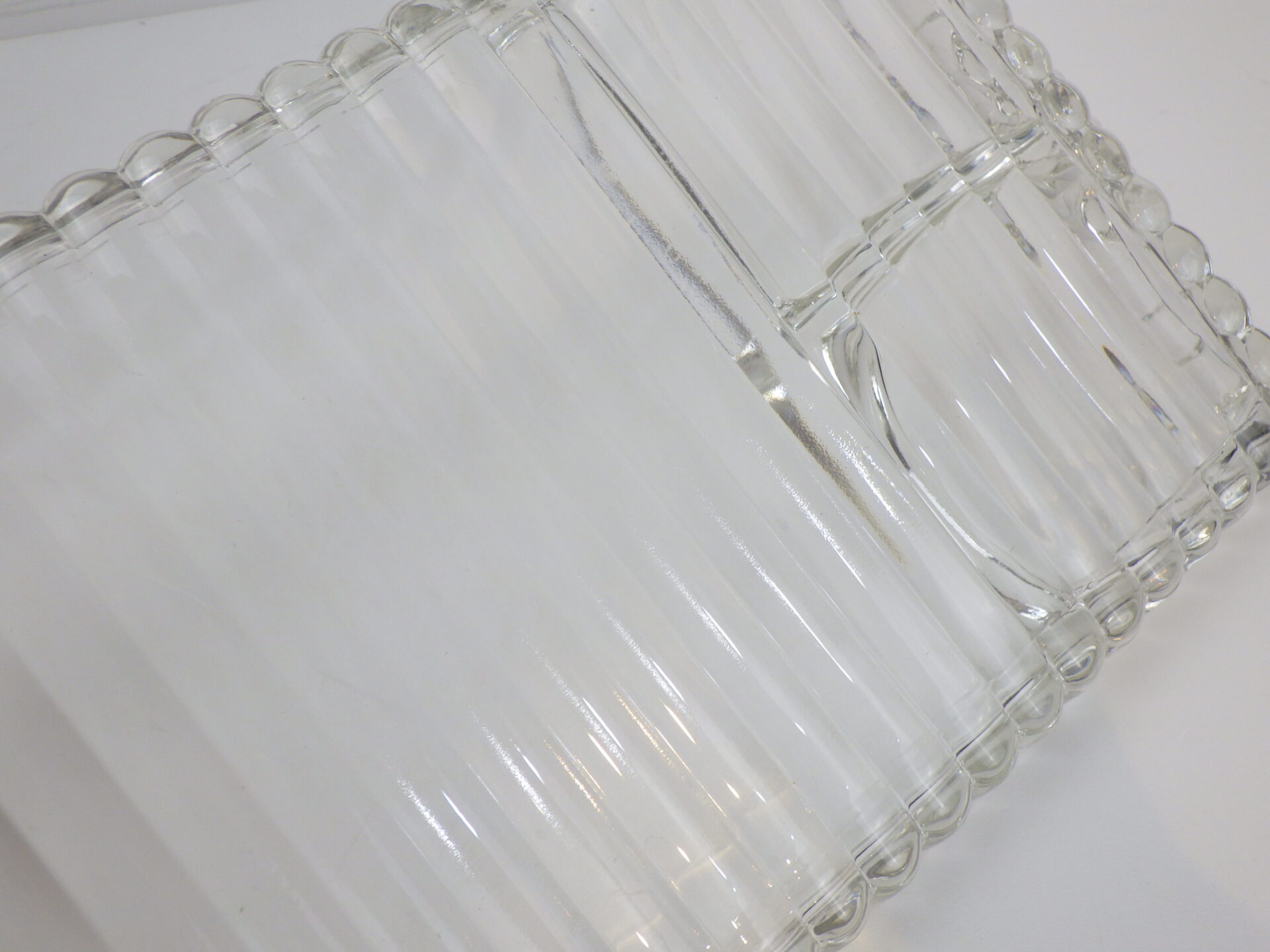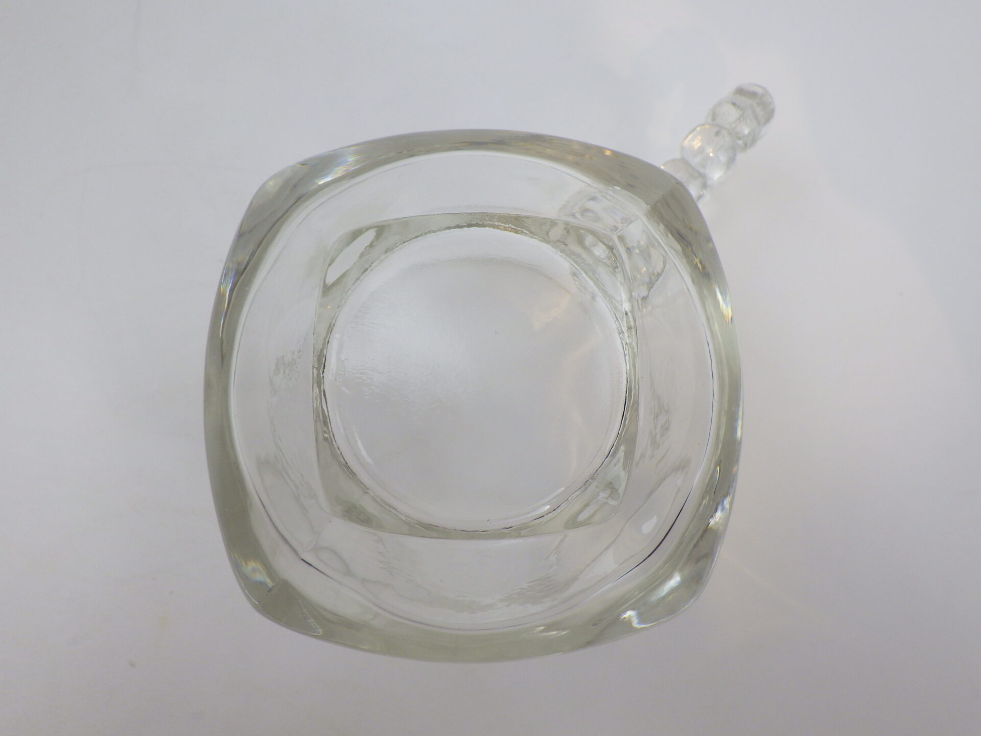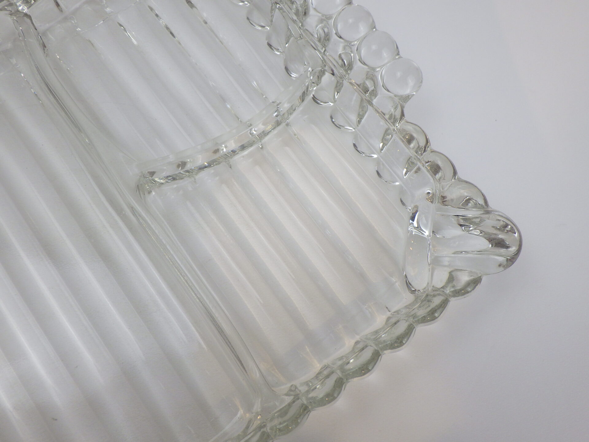 | ヘーゼルアトラス社のティアドロップ、スナックセットです。 ヘーゼルアトラスと言えばカラフルで可愛らしいプリントのミルクガラスを思い浮かべる方も多いかと思いますが、このようなクリアガラスのアイテムも沢山製造していました。 こちらは「3S」と呼ばれており、「Snack(スナック)」「Sip(飲む)」「Smoke(タバコ)」の略で、プレートの隅の四角く囲われている部分にタバコが置けるようになっている珍しいタイプです。(縁にタバコを引掛けられるくぼみもあります) お昼は軽食やスイーツを、夜はちょっとしたカクテルパーティーを楽しめる仕様となっているんですね。 カップも飲み口は丸いのですが、ボトム部分は四角い形状をしており、プレートのくぼみにぴったり収まるため、テーブルに運ぶ際にクルクル回らず安定します。 日本ではあまり馴染みのないスナックセットですが、アレンジがきくので様々な場面で活躍してくれるアイテムでおすすめしています。 |