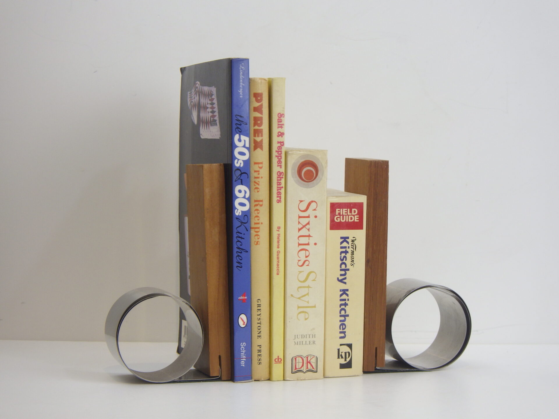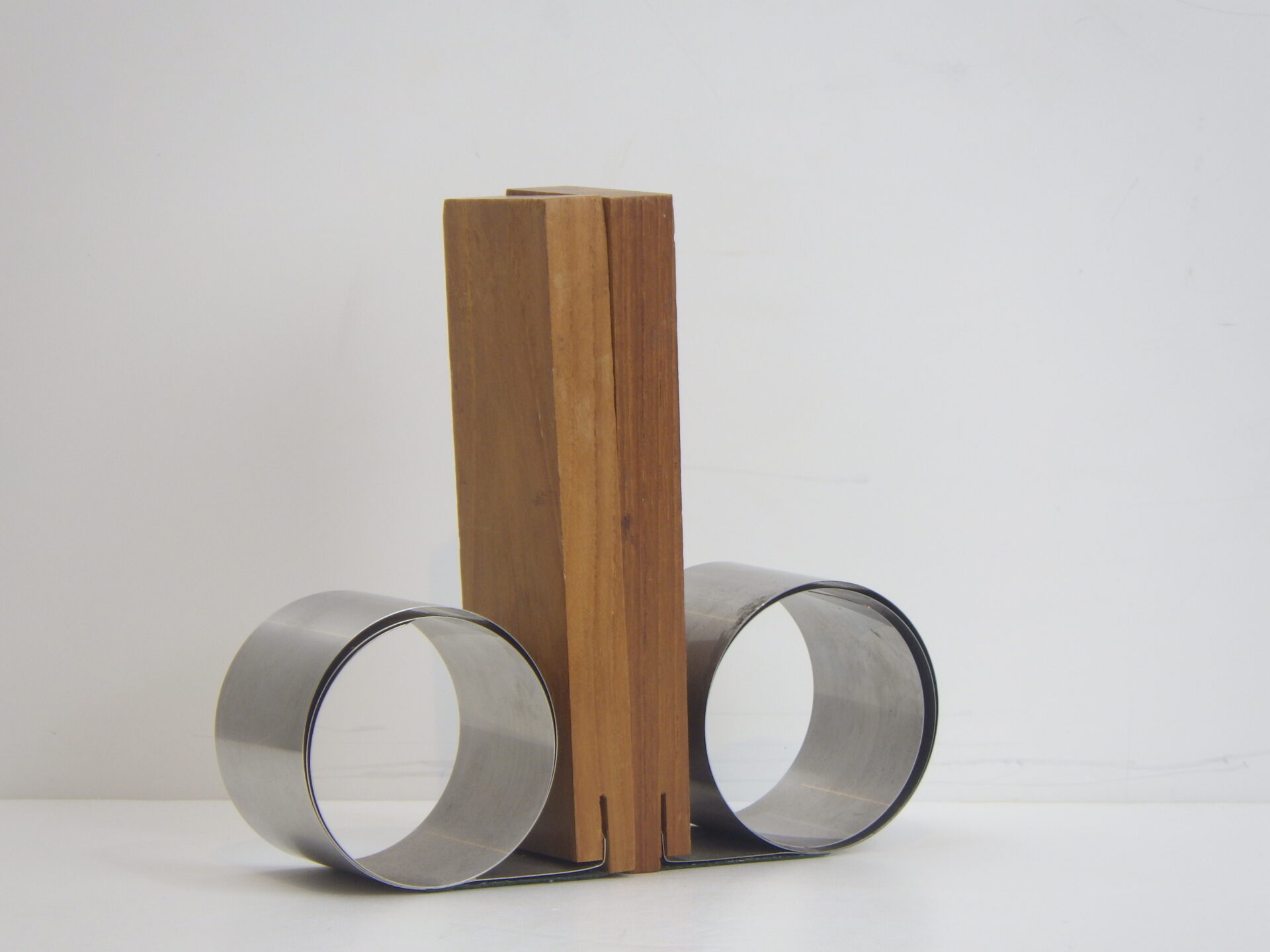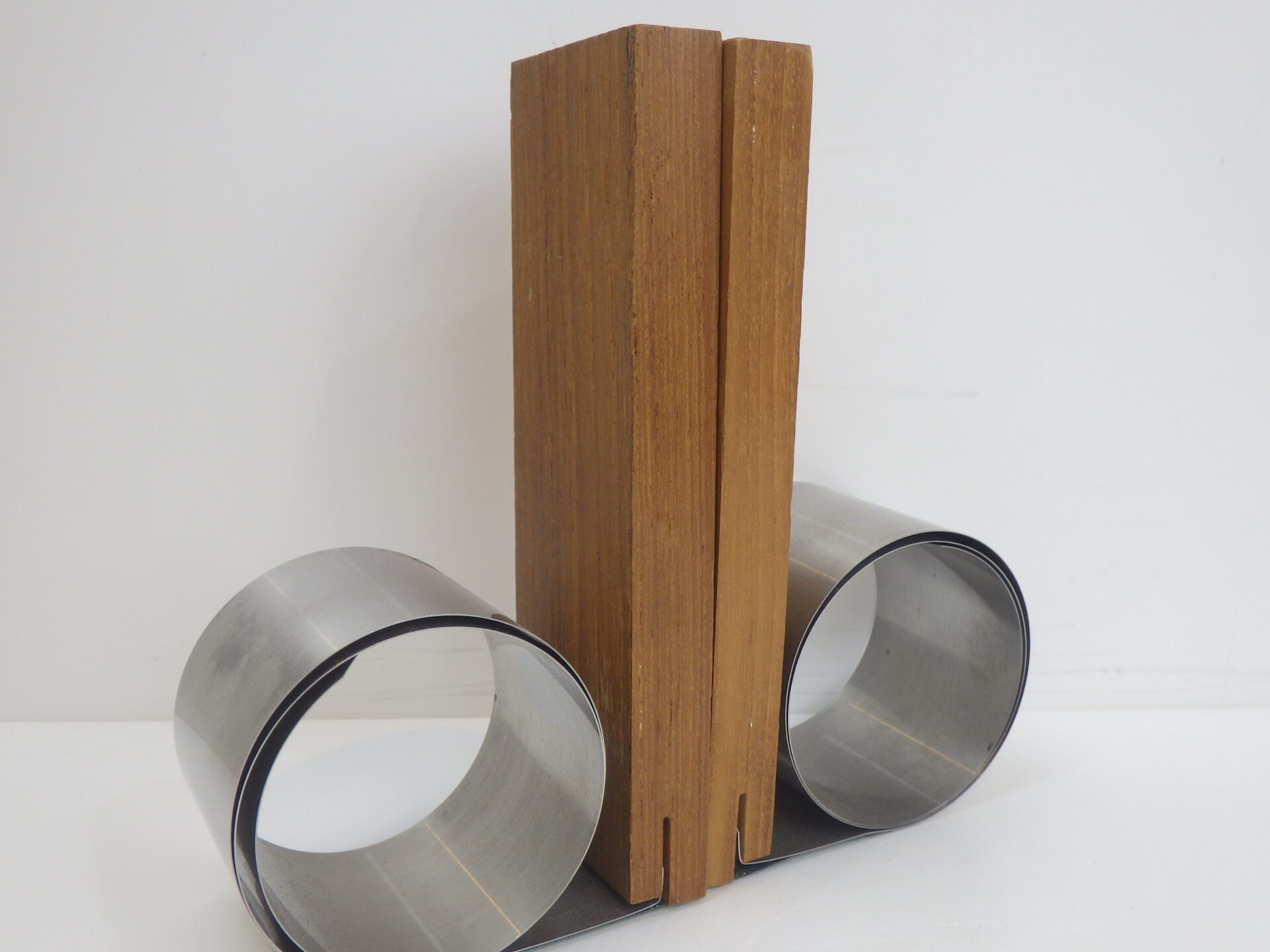 | アメリカで買い付けました。 ビンテージのブックエンドです。 写真のように二対で本を挟む形でも使えますが、本来は木とスチールのロールの間に本を挟んで使うもののようです。 幾何学デザインで異材質、小ぶりですが目を惹く要素のたっぷり詰まったアイテムとなっています。 インテリアのアクセントにおすすめしています。 |