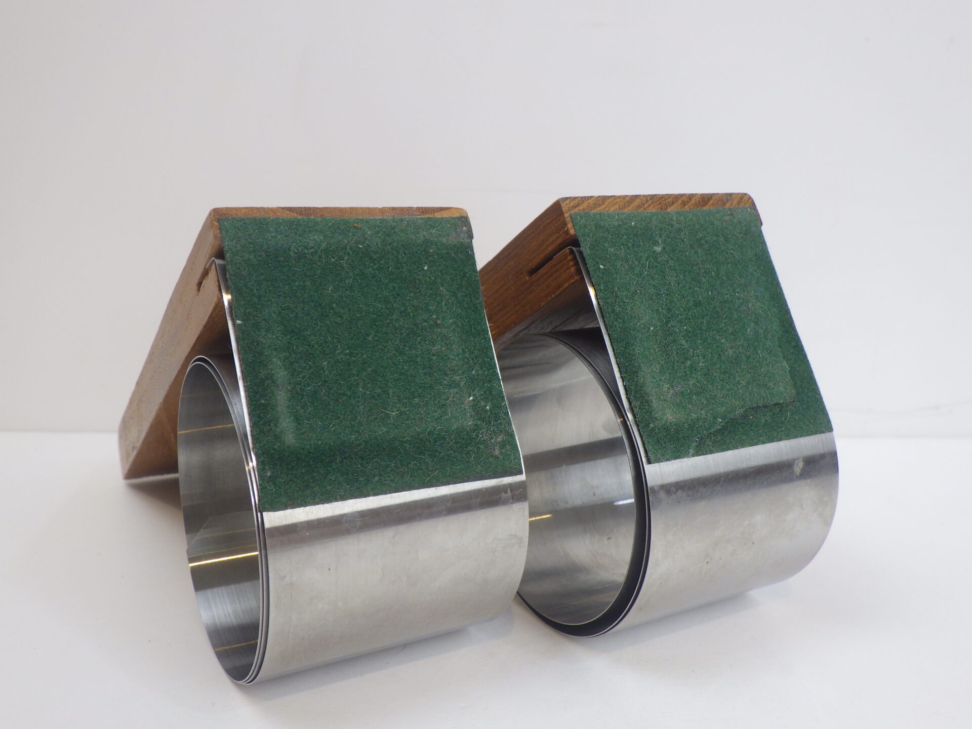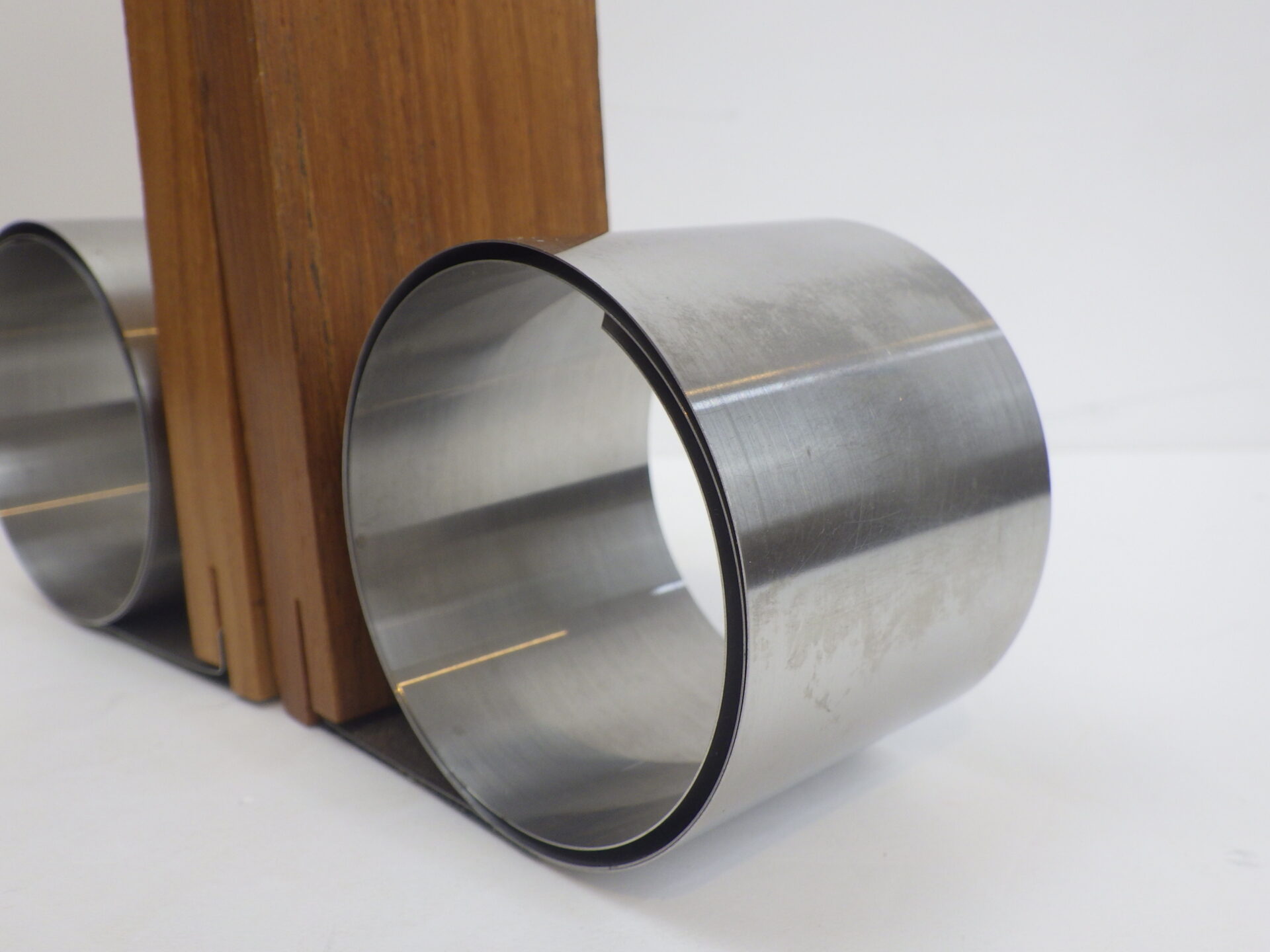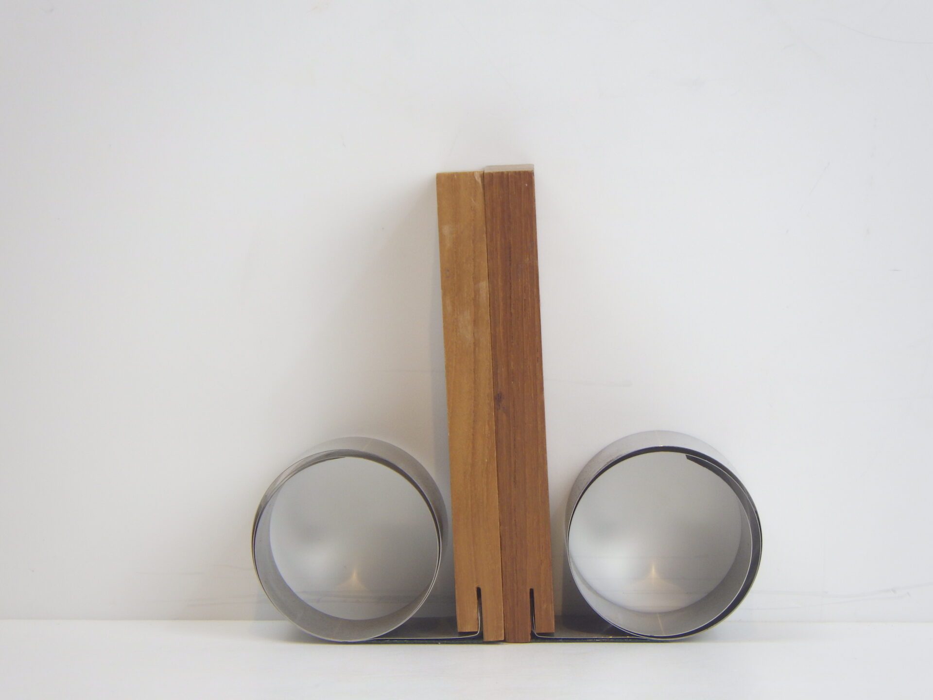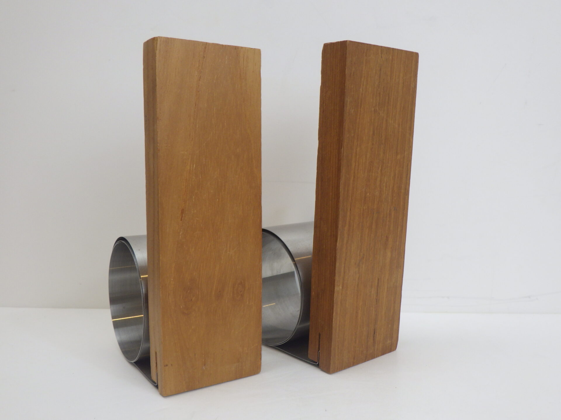 | アメリカで買い付けました。 ビンテージのブックエンドです。 写真のように二対で本を挟む形でも使えますが、本来は木とスチールのロールの間に本を挟んで使うもののようです。 幾何学デザインで異材質、小ぶりですが目を惹く要素のたっぷり詰まったアイテムとなっています。 インテリアのアクセントにおすすめしています。 |