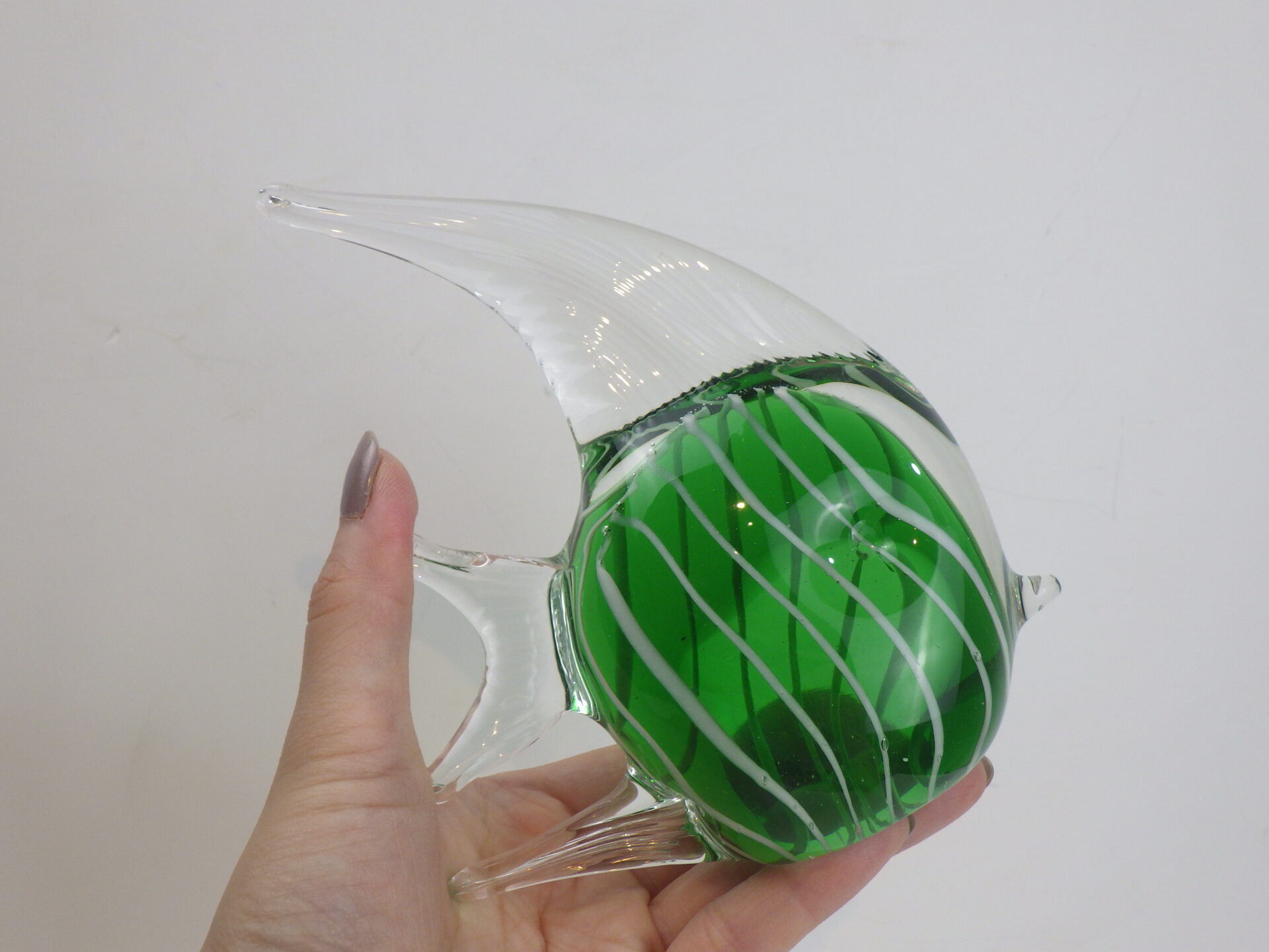 | アメリカで買い付けました。 ムラーノガラスのビンテージペーパーウェイトです。 ムラーノガラスとは、イタリアのヴェネチアの小さな島、「ムラーノ島」の職人の手によって生み出され、約千年に渡り受け継がれてきたガラス民芸品です。 日本では「ヴェネチアンガラス」という呼び名で馴染まれているかと思います。 一点ごとに手作業で製造されるため、大量生産された製品とは異なり、同じものが二つとして存在していないのも魅力の一つ。 色のトーンや形状、重さ、気泡の入り方など、それぞれに個性があります。 こちらのエンゼルフィッシュは、エメラルドグリーンにホワイトストライプのボディとクリアのヒレが何とも言えない美しいバランスをしています。 光の差し込み方で様々な表情を見せてくれるアイテムなので、季節や状況によって置き場所を替えながら楽しめそう。 ペーパーウェイトではなく、オブジェとしてちょっとしたスペースに飾ってみるのも良さそうです。 |