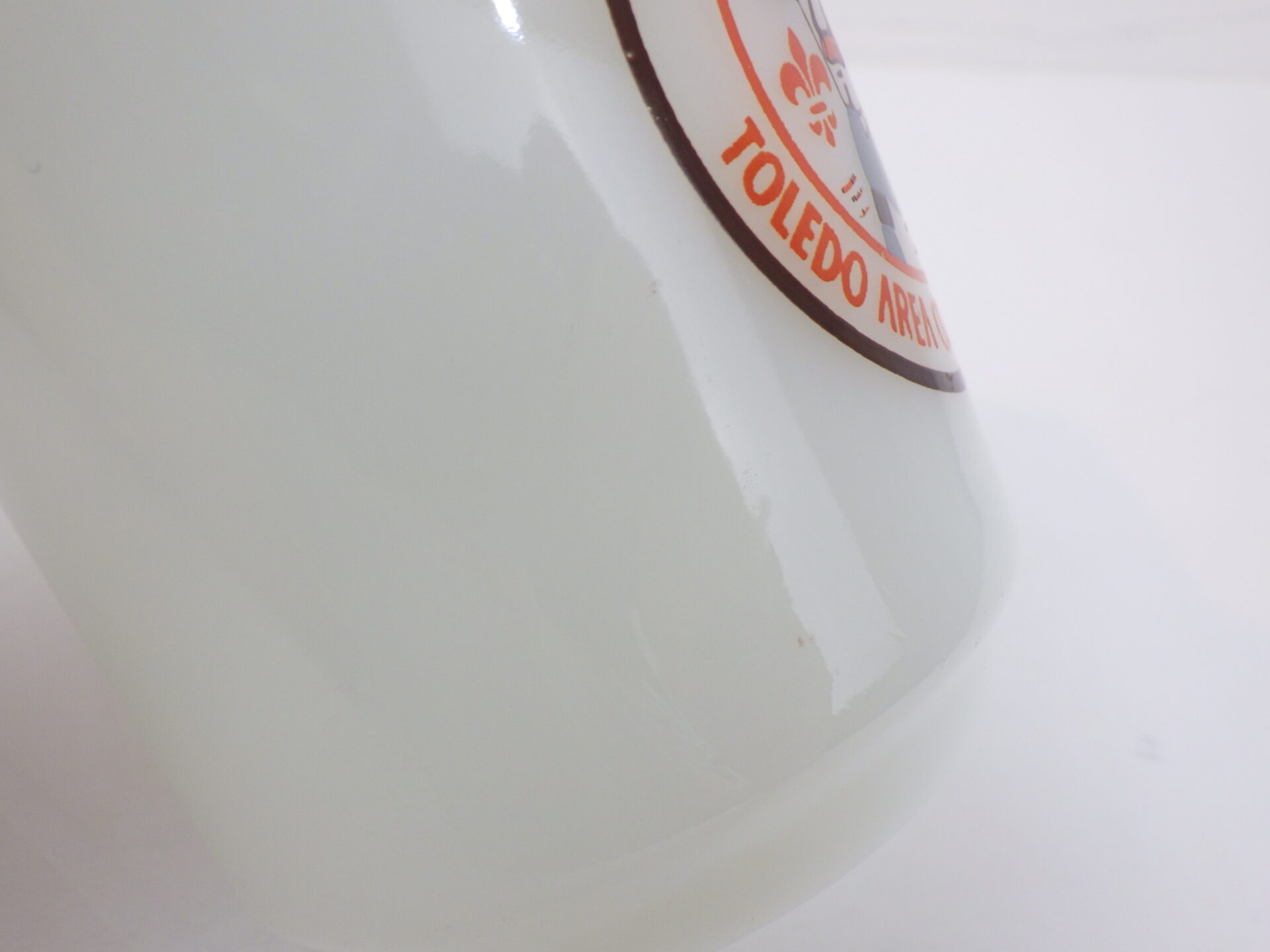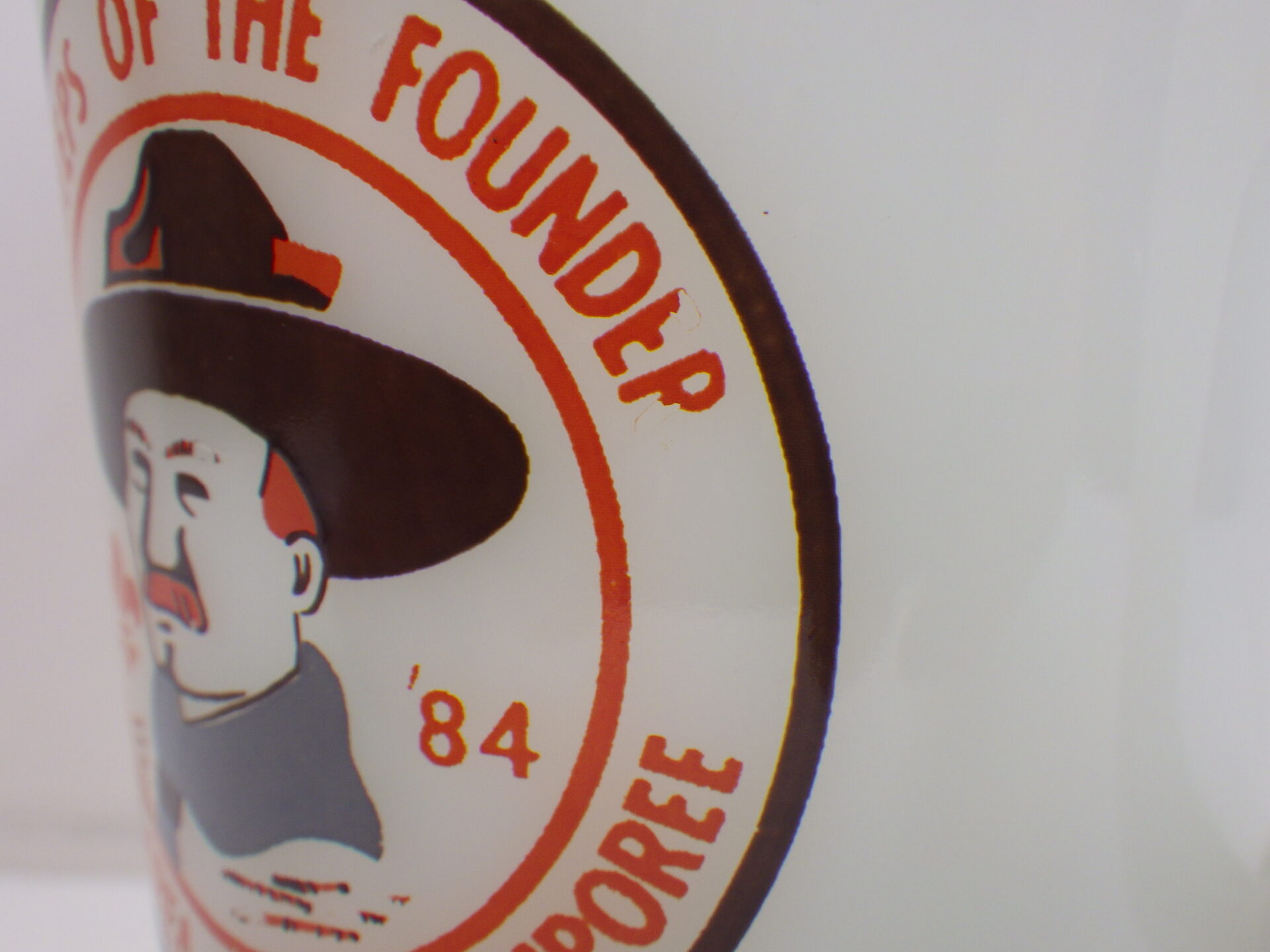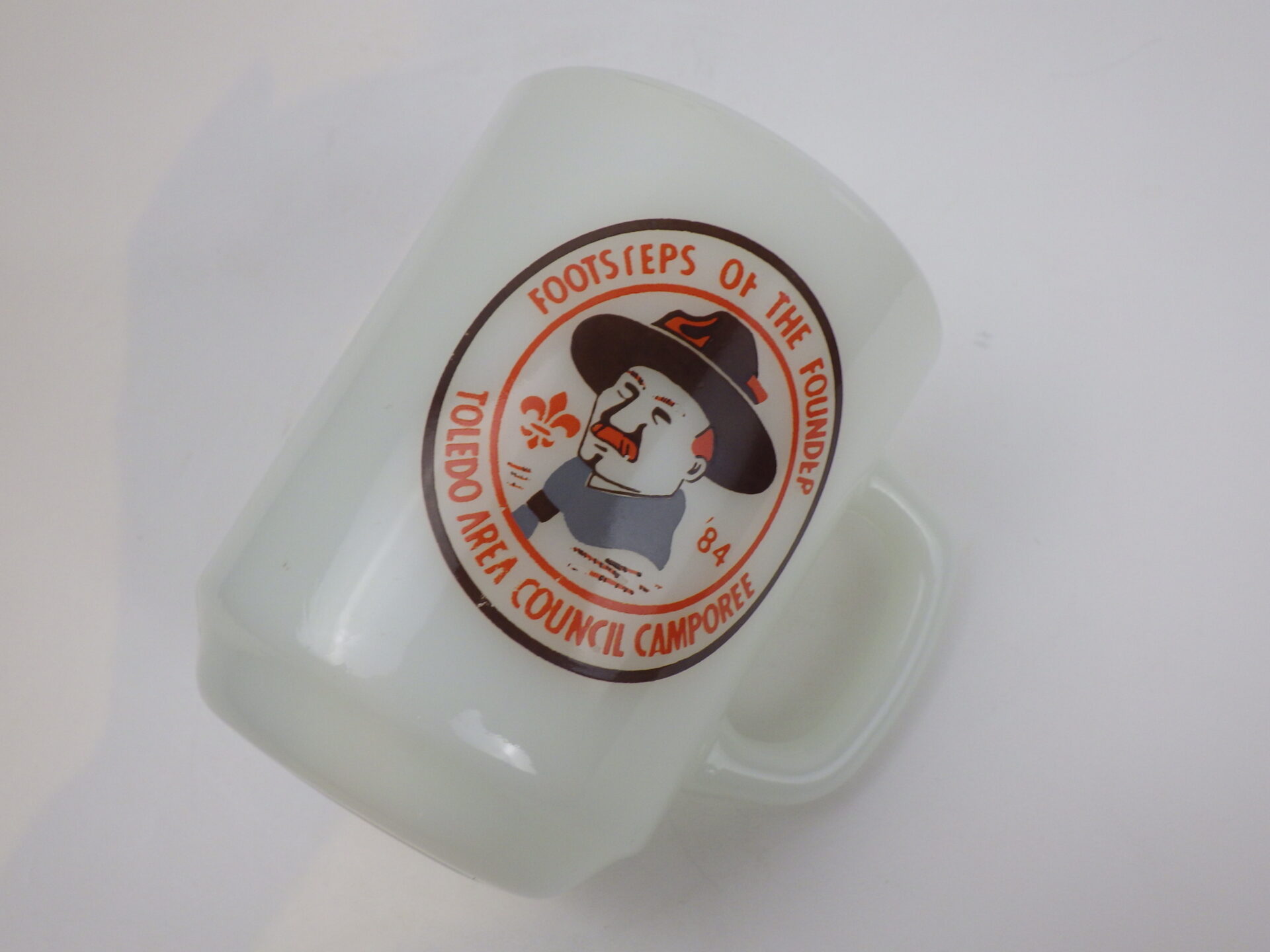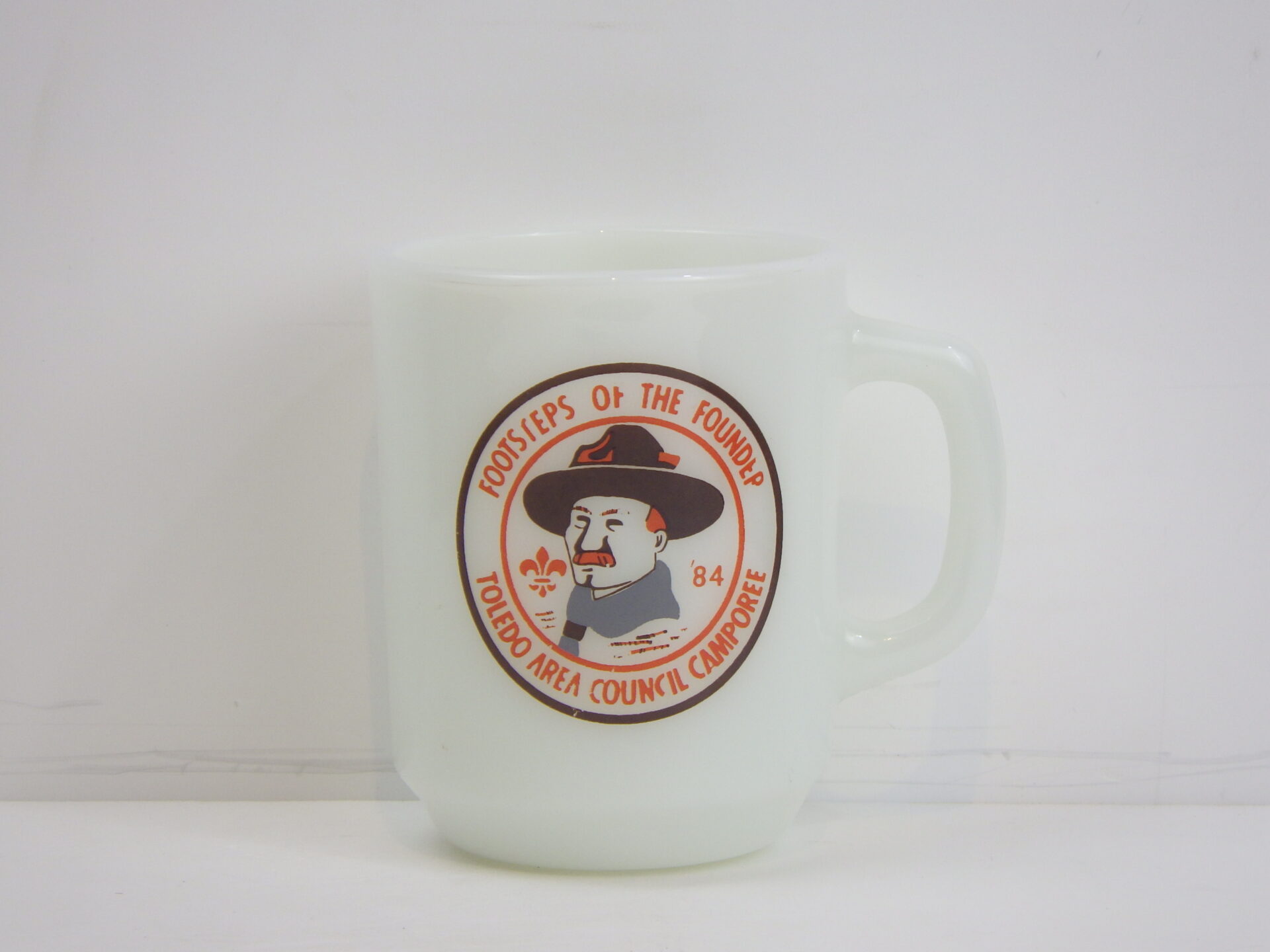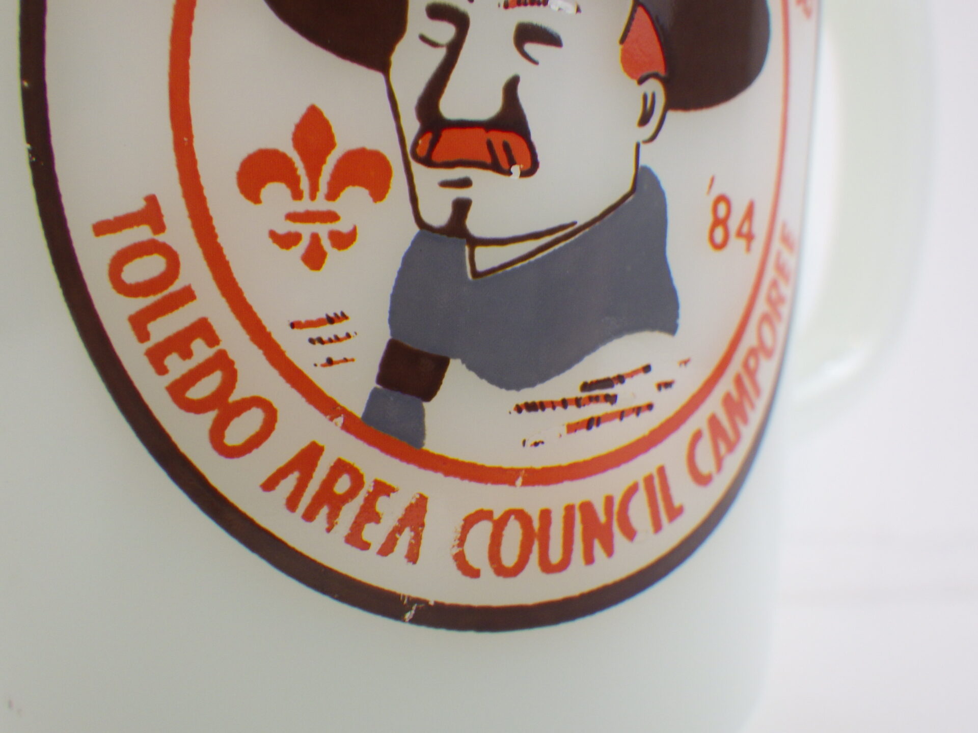| アメリカで買い付けました。 ボーイスカウトのロゴの入ったファイヤーキングマグです。 中央に描かれているのはスカウト運動の創立者であるイギリスの軍人ロバート・ベーデン・パウエルだと思われます。 「TOLEDO AREA COUNCIL CAMPOREE」とあるので、記念に作られたマグのようですね。 |