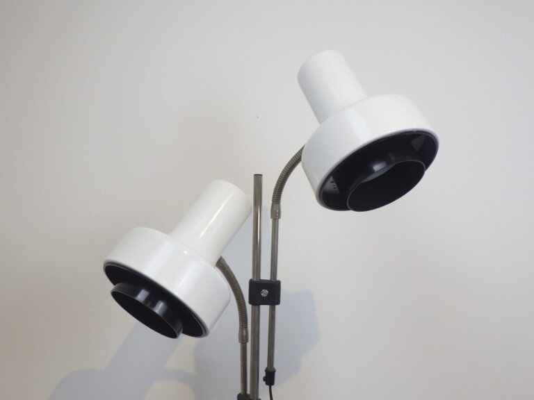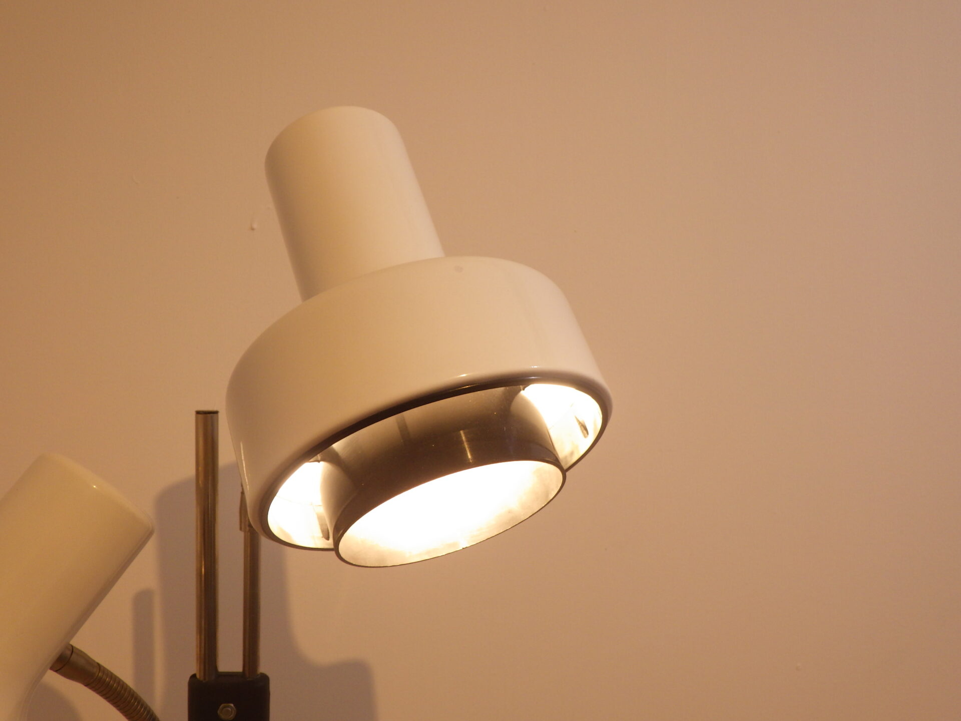 細身の支柱にホワイトのシェードが二灯ついており、スマートなシルエットですが明るさのボリュームはしっかりとあります。