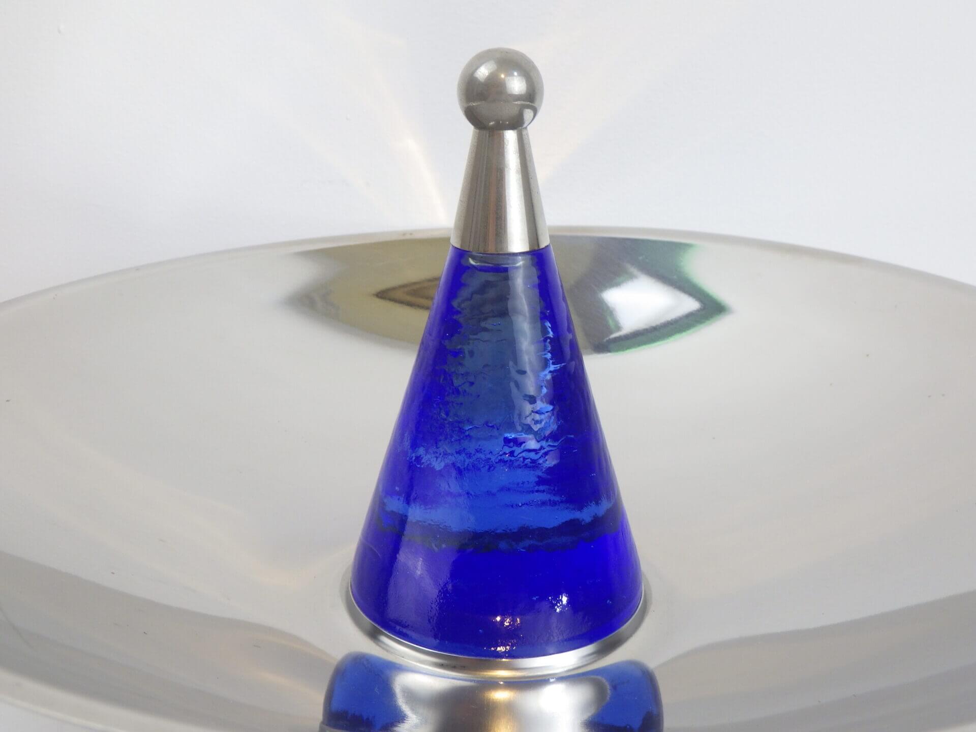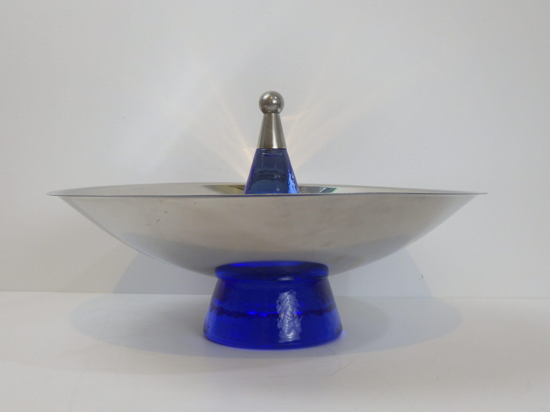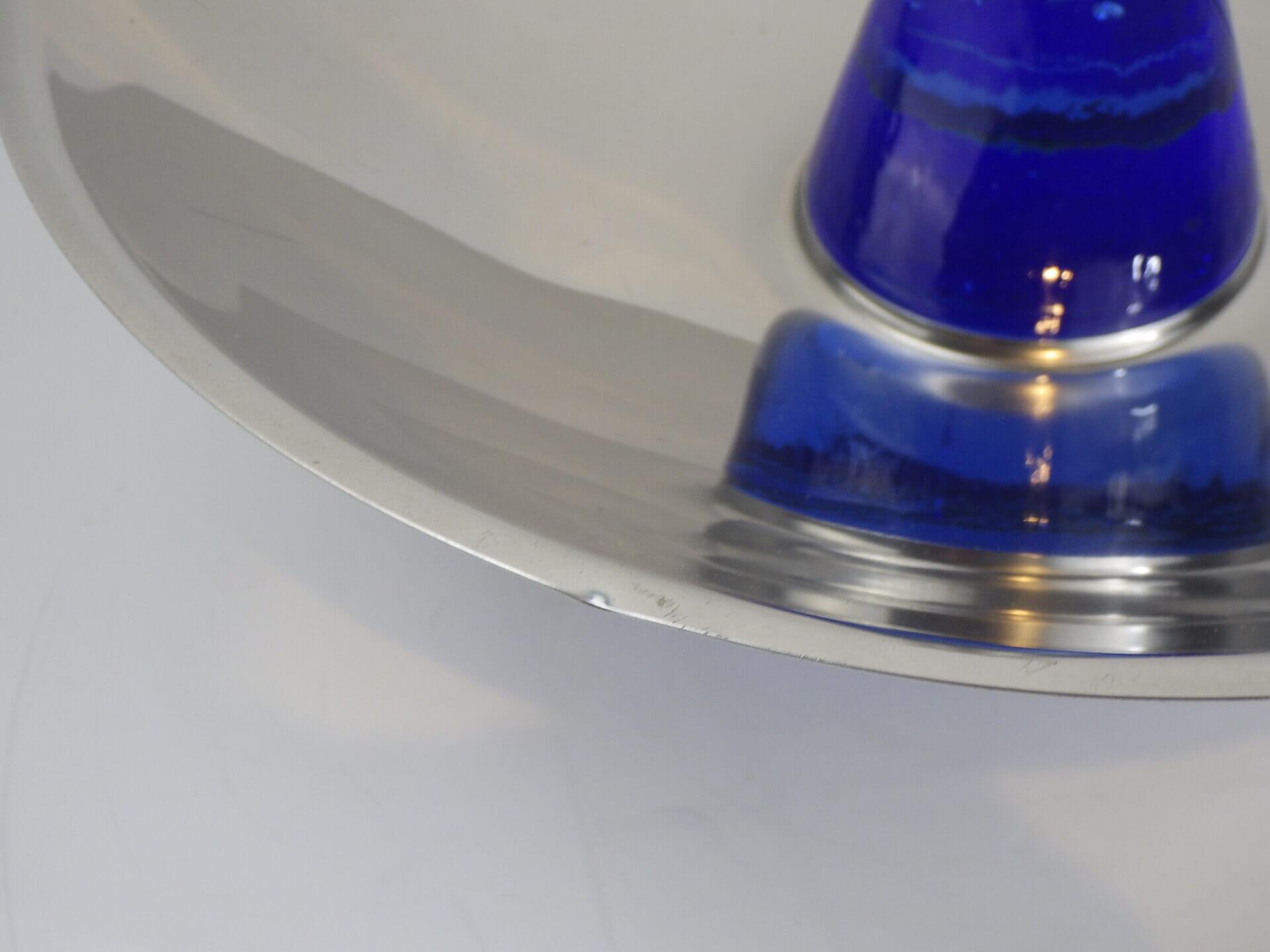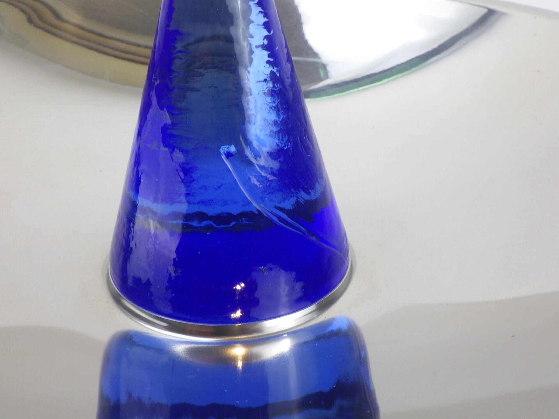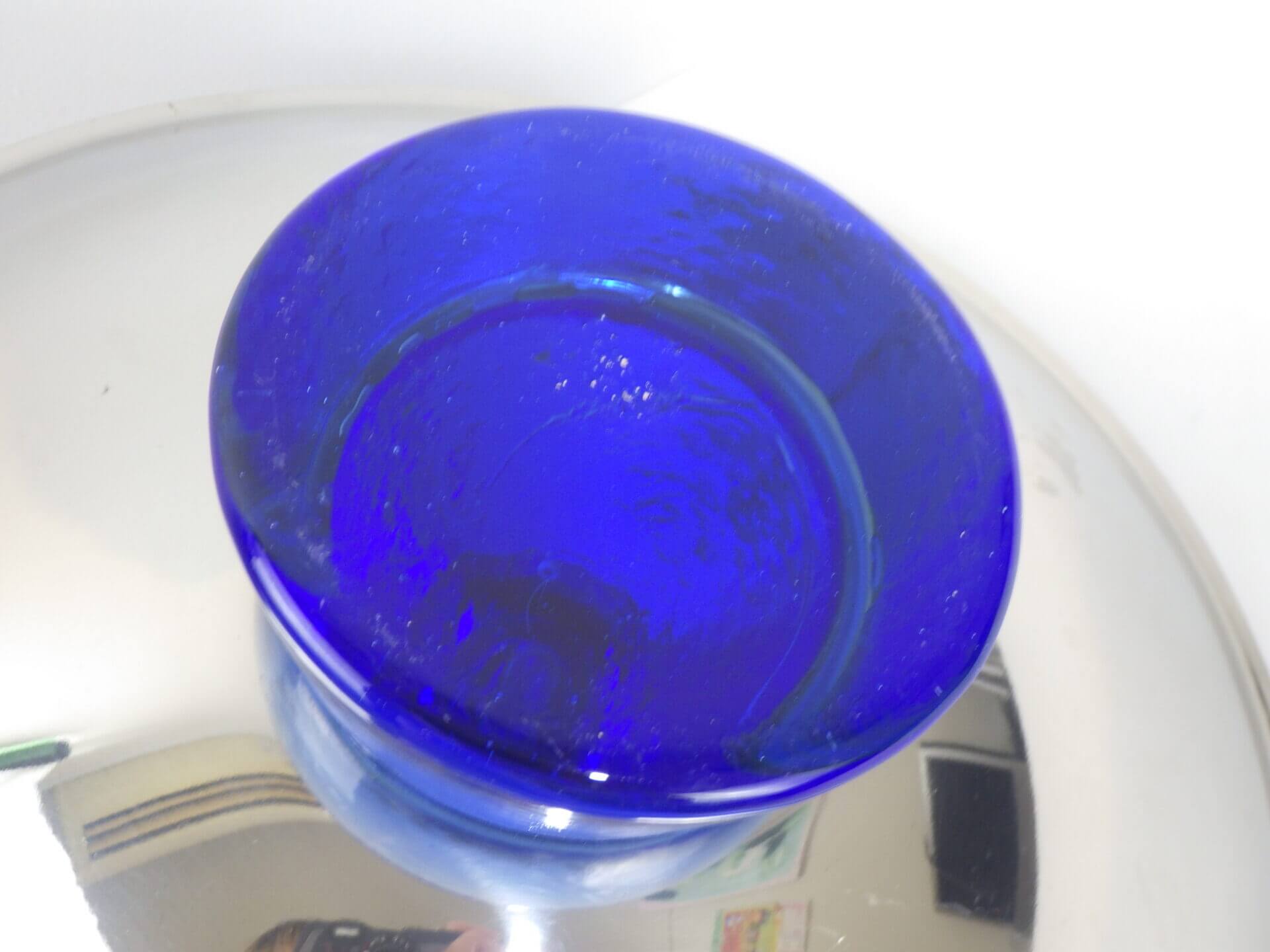 | ヨーロッパで買い付けました。 おそらくフルーツボウル(コンポート)だと思われます。 支柱はガラス製で、ヨレや気泡が見られますが、光を取り込むとその部分がキラキラして幻想的です。 また、見る角度によって海の底のような深いブルーに見えたり、クリアに近い薄いブルーに見えたりと、不思議な輝き方をする作りとなっています。 何も置かなくてもこれ一つでインテリアとして成り立つ印象的なアイテムですので、空間のアクセントとしておすすめしています。 また、支柱の先にリングやブレスレットをかけたりして、アクセサリー入れのように使用するのも面白そうです。 |