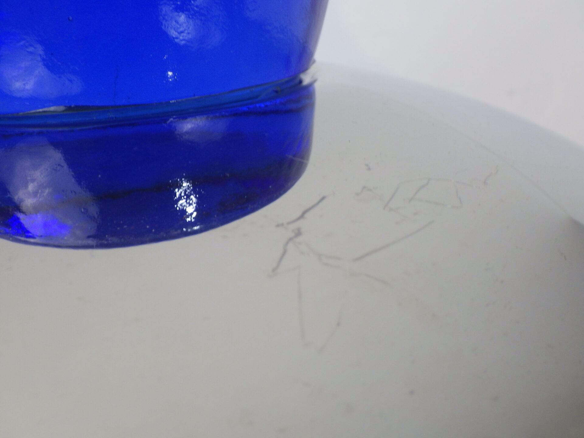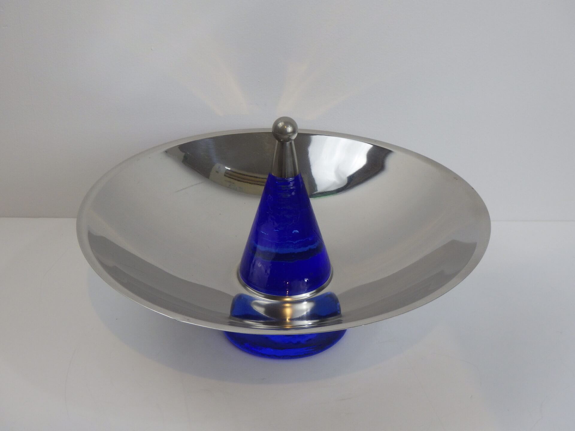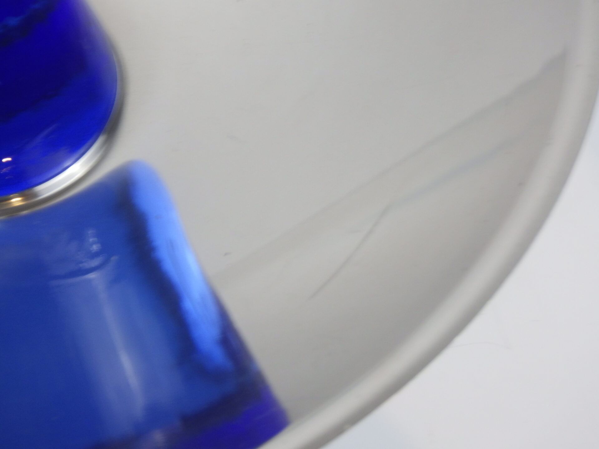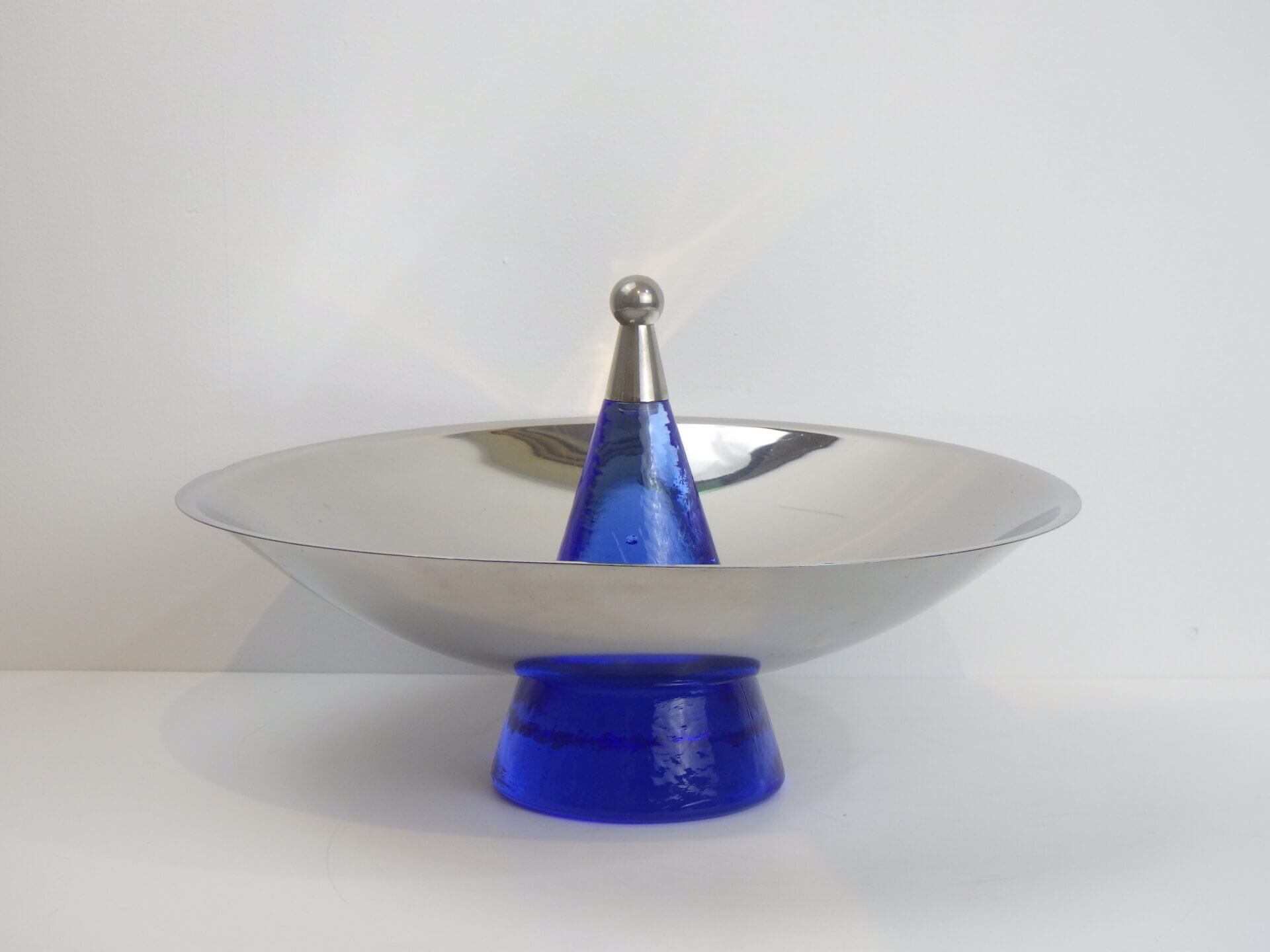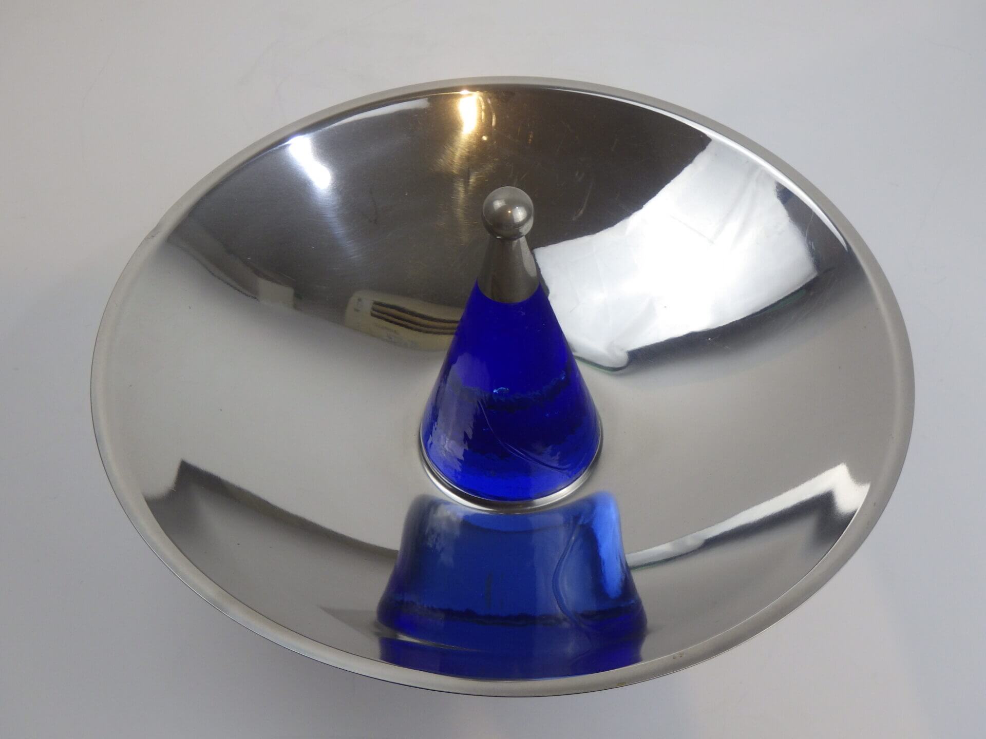 | ヨーロッパで買い付けました。 おそらくフルーツボウル(コンポート)だと思われます。 支柱はガラス製で、ヨレや気泡が見られますが、光を取り込むとその部分がキラキラして幻想的です。 また、見る角度によって海の底のような深いブルーに見えたり、クリアに近い薄いブルーに見えたりと、不思議な輝き方をする作りとなっています。 何も置かなくてもこれ一つでインテリアとして成り立つ印象的なアイテムですので、空間のアクセントとしておすすめしています。 また、支柱の先にリングやブレスレットをかけたりして、アクセサリー入れのように使用するのも面白そうです。 |