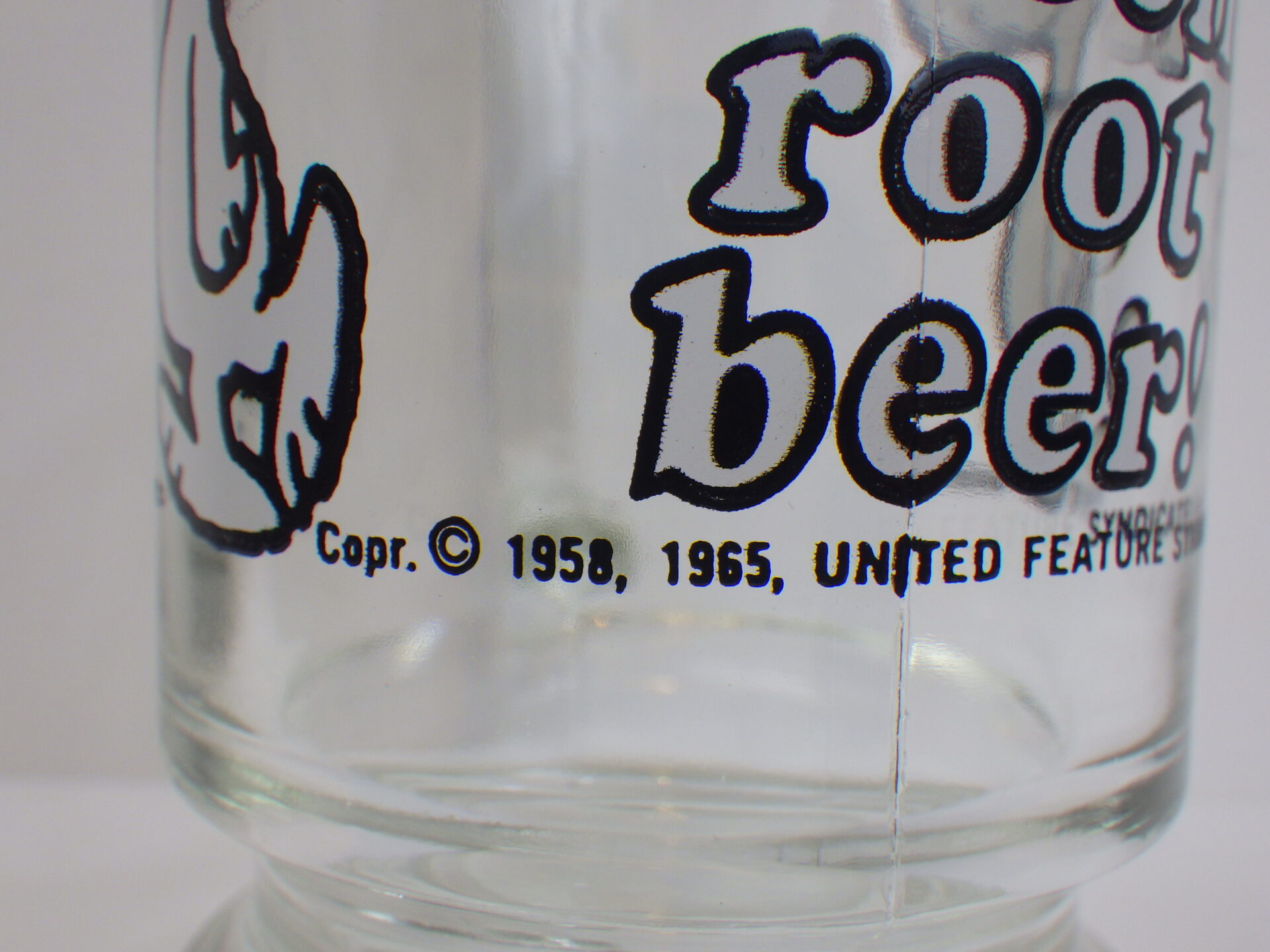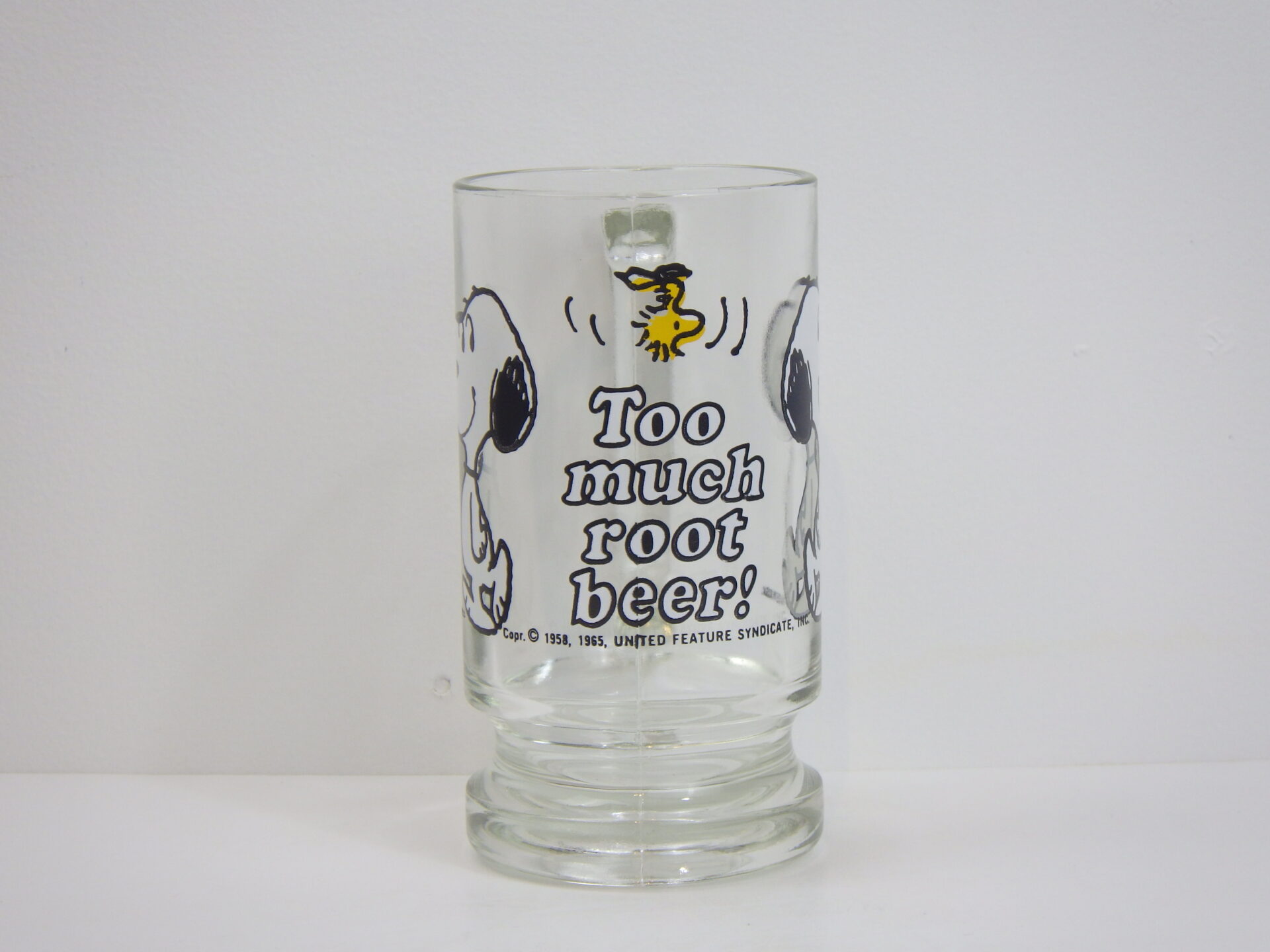 | アメリカで買い付けました。 ファイヤーキングでお馴染み、アンカーホッキング社製のビールマグです。 スヌーピーとウッドストックが描かれており、「Too much root beer!(ルートビアの飲み過ぎ!)」の文字も。 ちなみにルートビアとは見た目はビールのようですが、アルコールは入っておらず、炭酸飲料の一種で、スヌーピーの好物としてよく一緒に描かれています。 |