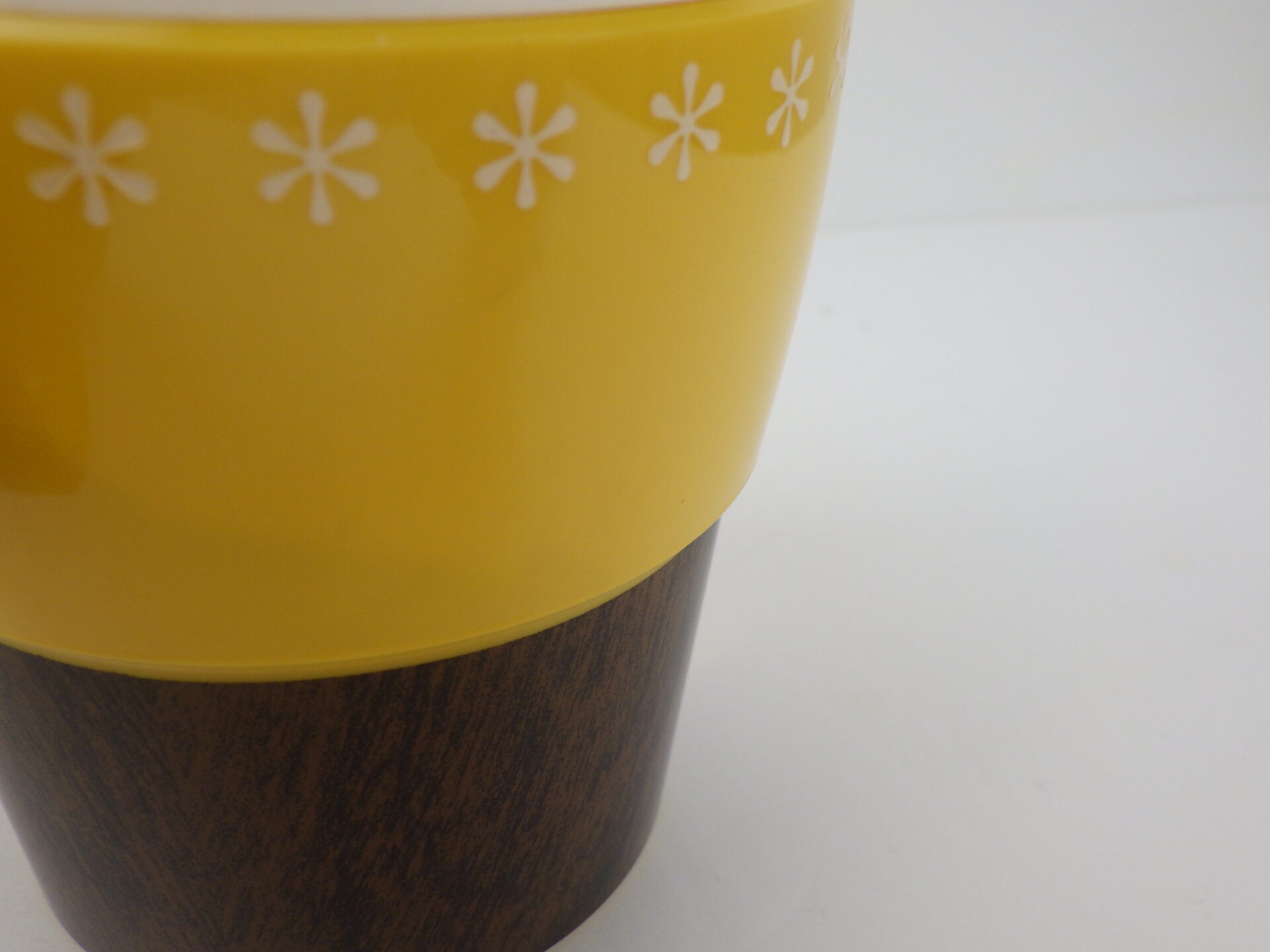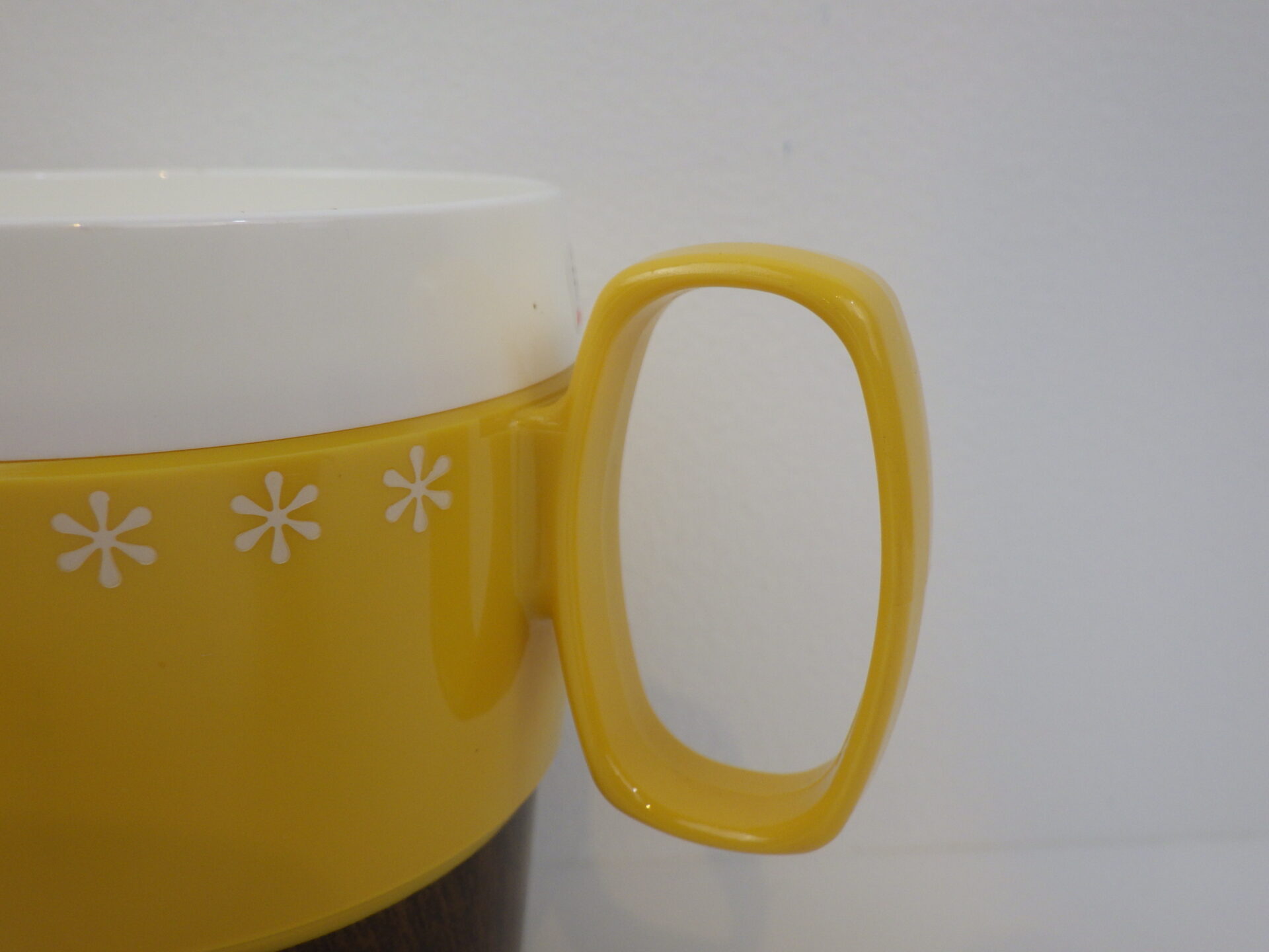 | アメリカで買い付けました。 可愛らしいプラスチック製のマグカップです。 ハーベストゴールドにスノーフレークのプリントが可愛いですね。 軽くて使い勝手も良いため、自宅使いだけでなくキャンプやピクニックなどアウトドアの際にも気軽に持ち出せます。 また、スタッキングも出来るので、コンパクトに収納出来て便利です。 |