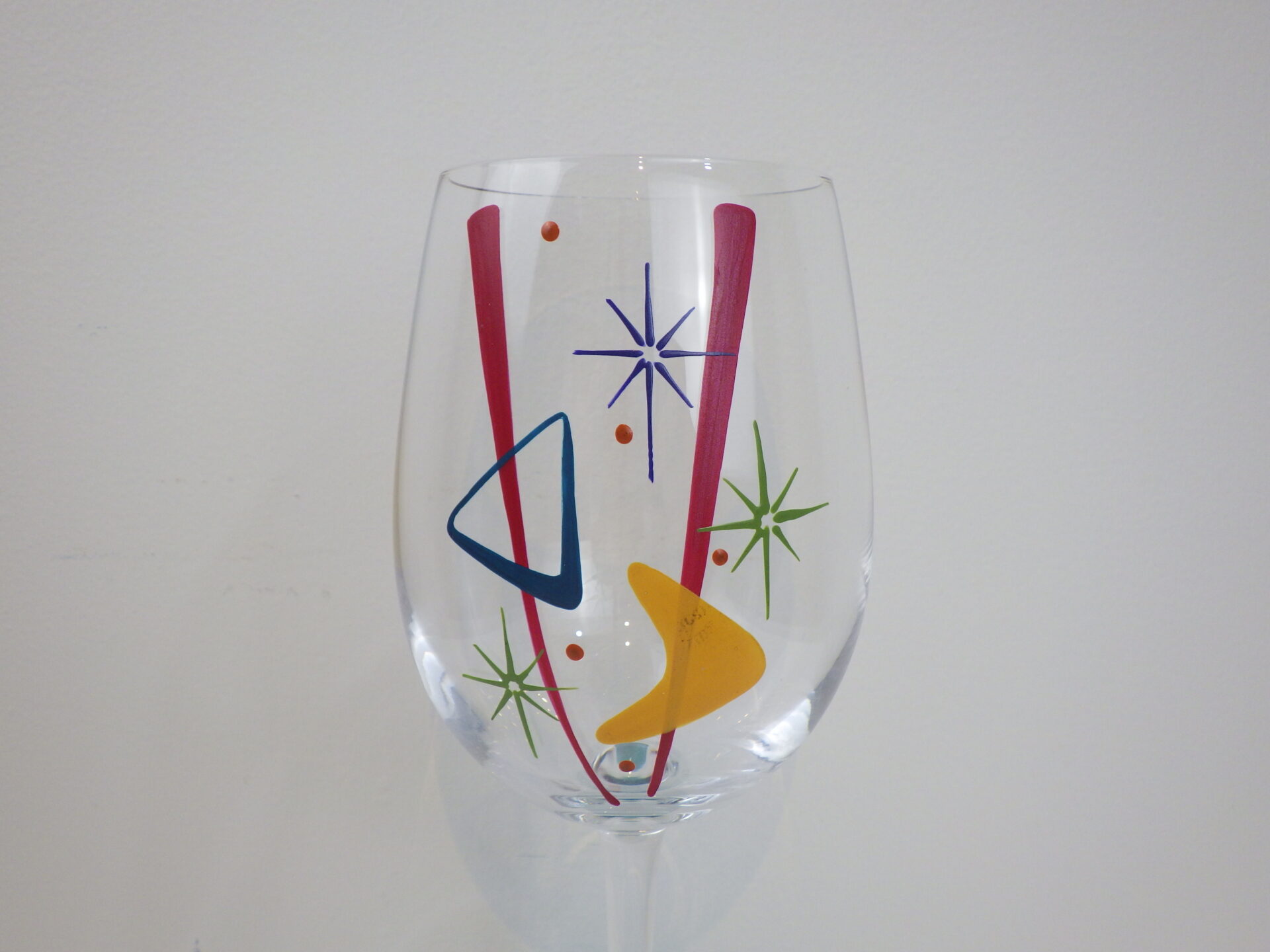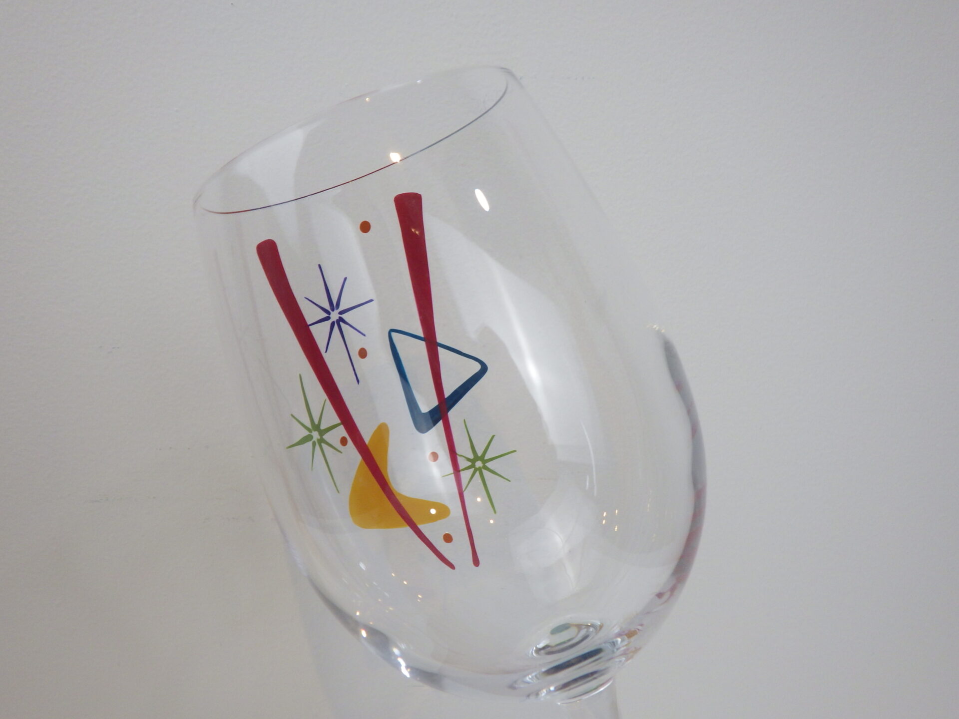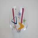 | アメリカで買い付けました。 ビンテージのワイングラスです。 ハンドペイントで模様、色付けされています。 幾何学模様の中にスターバーストが散りばめられており、とても目を惹くデザインですね。 カクテルタイムを楽しくポップに過ごしたい方におすすめのアイテムです。 |