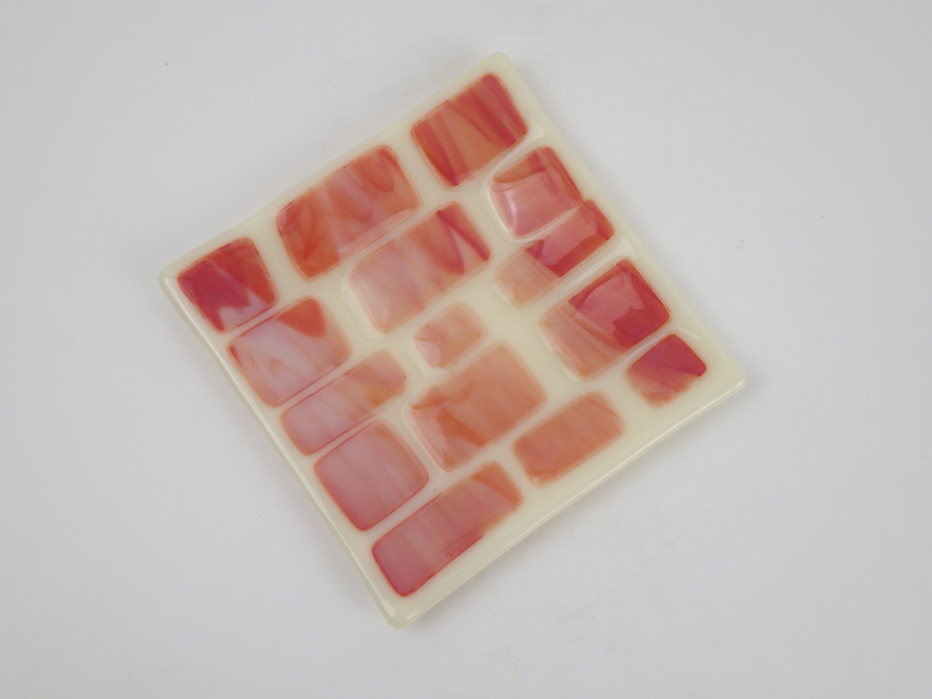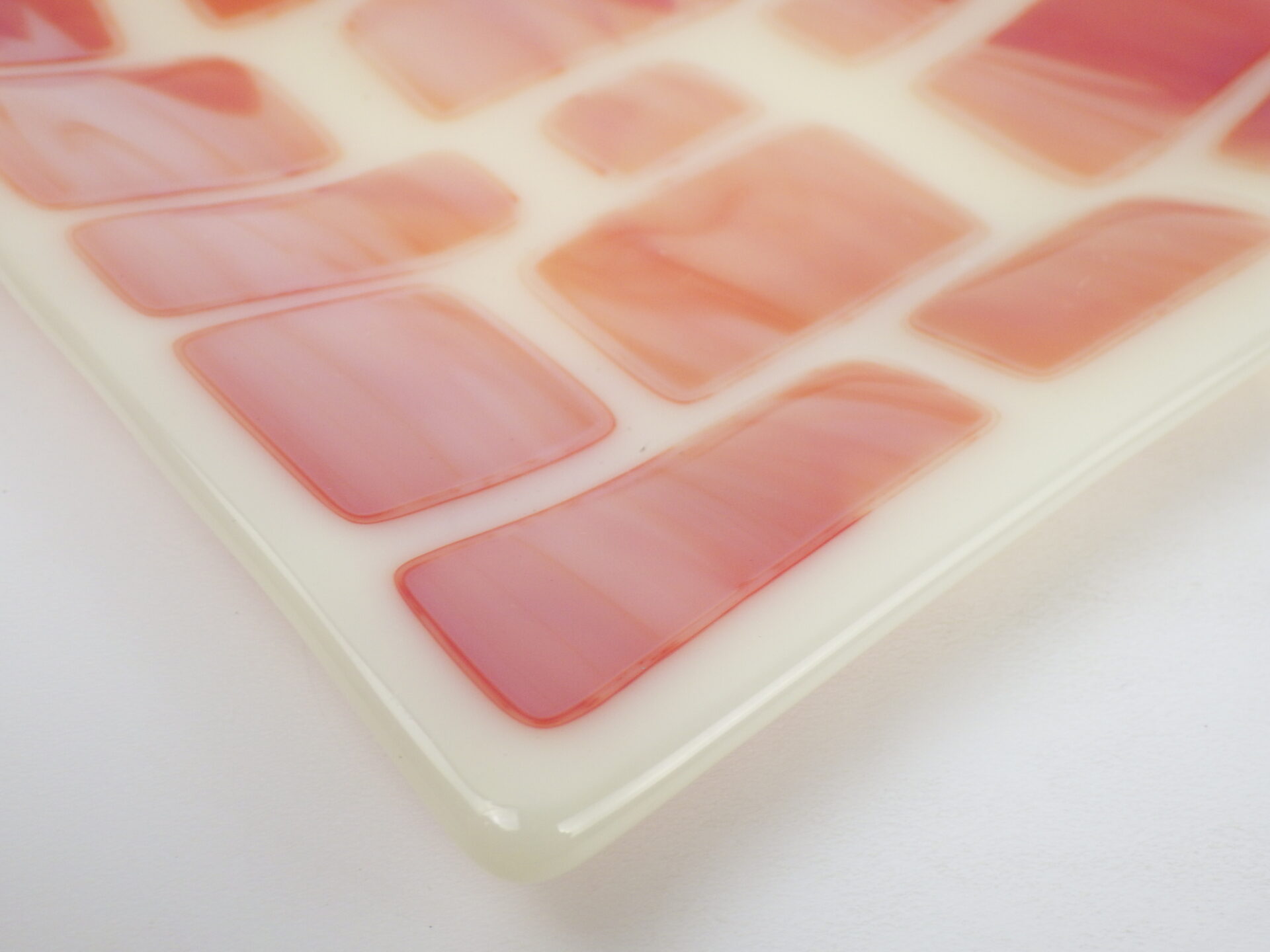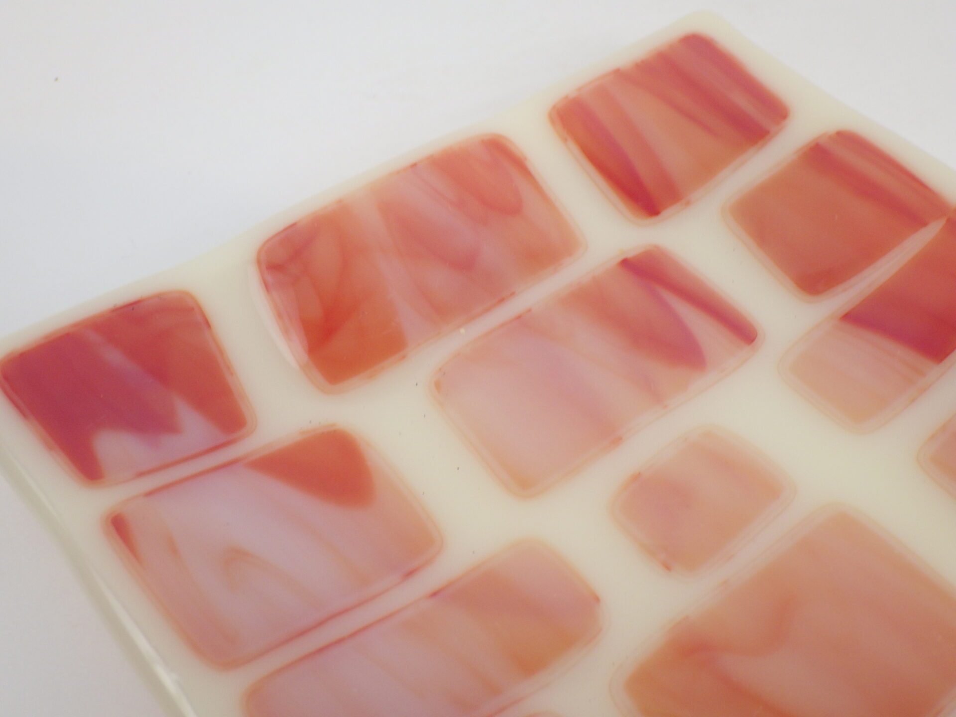 | アメリカで買い付けました。 ビンテージのガラストレイです。 上品なオフホワイトの地に、マーブル模様ののサーモンピンクがタイルの様に区画分けされており、ぽこぽこと凹凸しているため、光が反射してとても綺麗です。 アクセサリートレイやキートレイとして、またはお香用の受け皿なんかにしてみても良さそうです。 ガーリーになり過ぎず、大人っぽい可愛らしさを演出してくれそうですね。 |